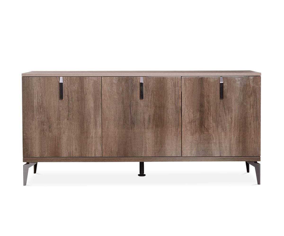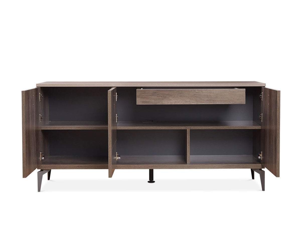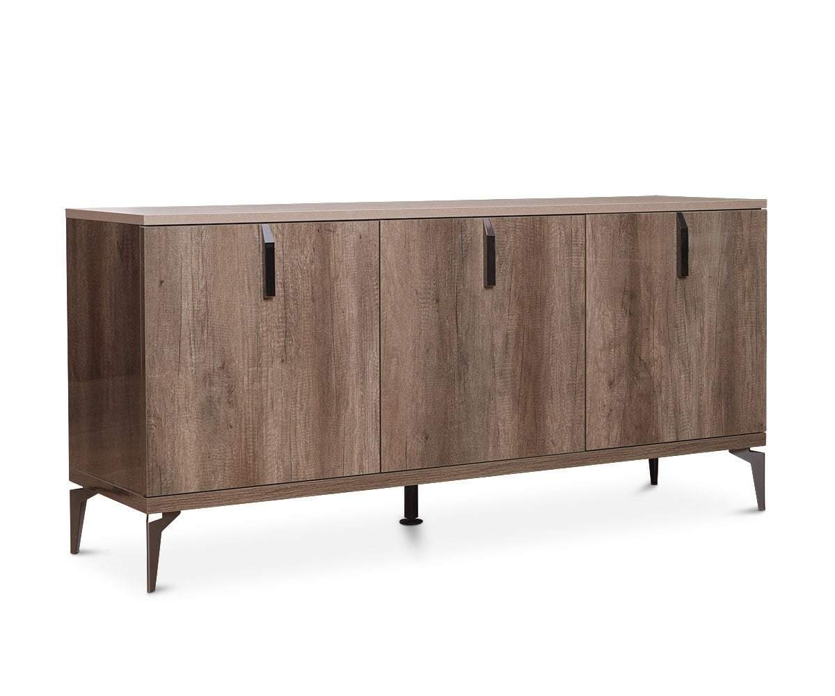 Made in Italy, the Akana sideboard brings a bounty of storage to your dining room. Natural warmth comes from the striking wood grain pattern enhanced by the high gloss finish and intriguing metal accents. Three doors open to reveal five spacious compartments and one drawer. Organize your table decor, glassware, serving dishes and more in a stylish statement piece for your dining area.