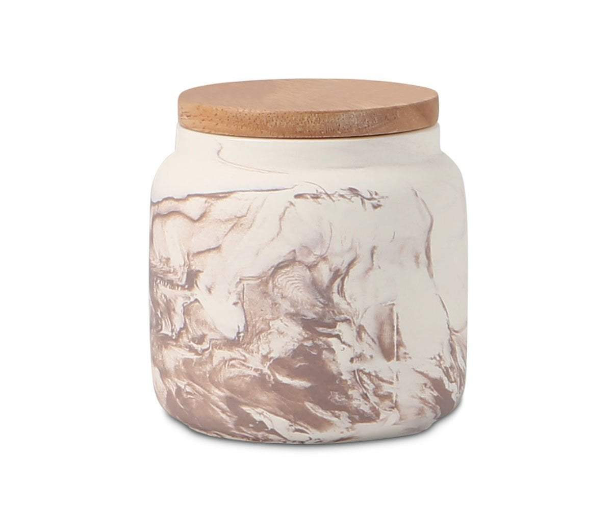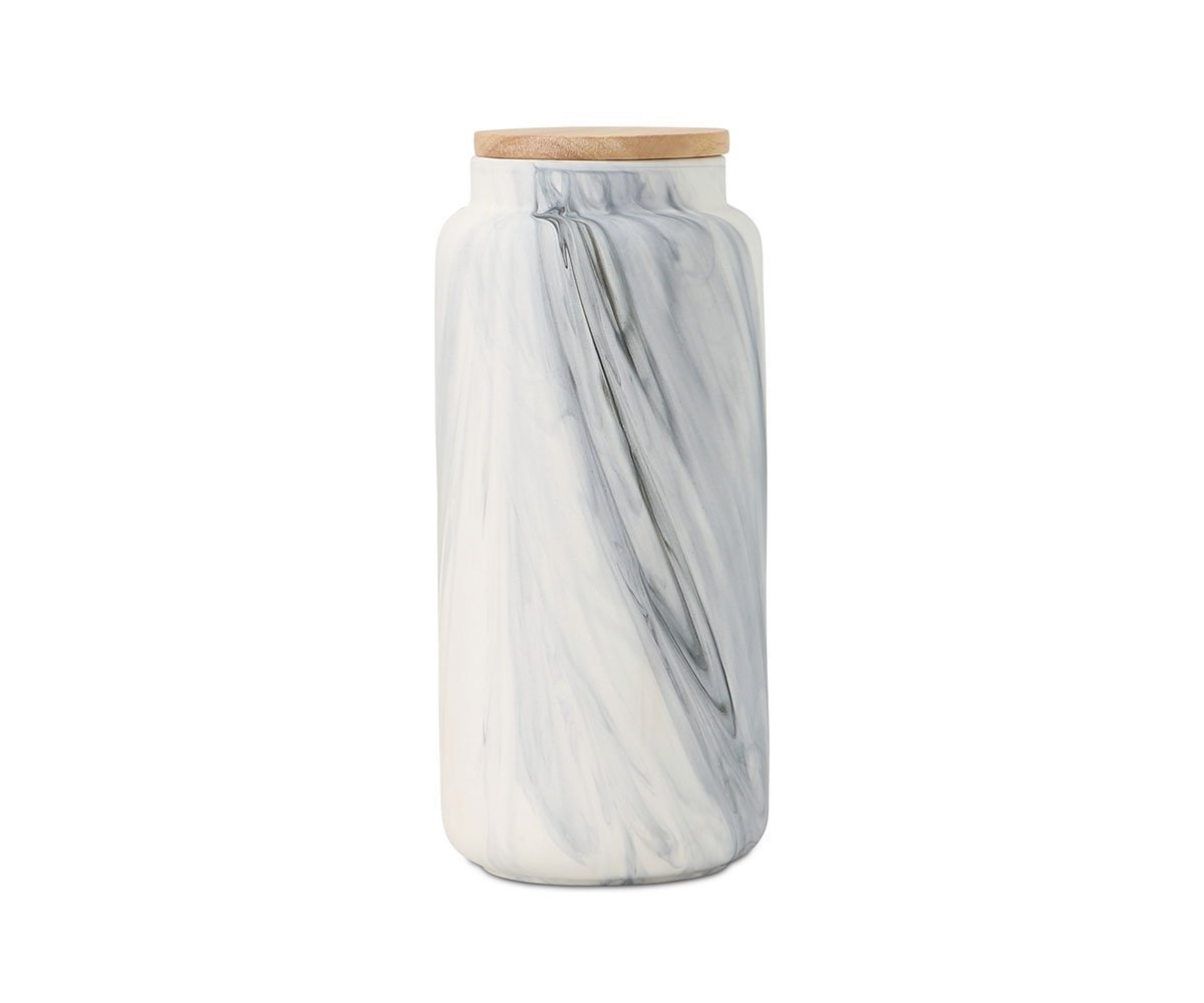 The Akran ceramic jar is smooth to the touch and displays a beautifully marbled design. This accessory is functional as well as decorative by providing a stylish spot of storage where you need it. Its lid made of oak gives a natural touch that enhances the overall look.