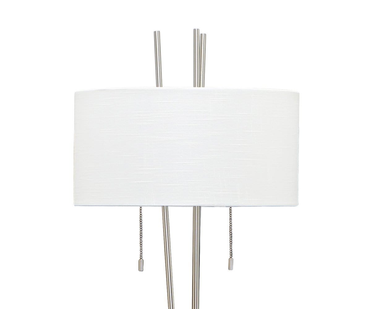 The Anderson floor lamp presents cool, modern design with a warm, inviting glow. The airy, sculptural base is constructed of three steel poles which support the large textured linen drum shade. Each of the two 10W LED bulbs has its own on/off pull chain.