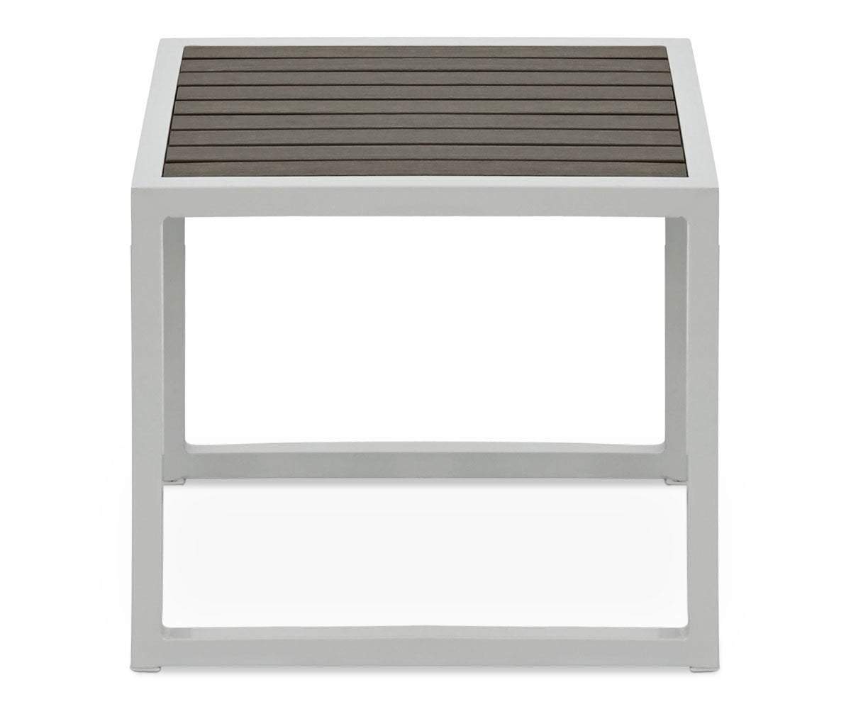 The Aurora end table features a white powder-coated aluminum frame with a tabletop of resin wood slats. Both durable and lightweight, it is designed for use season after season. This accent piece is large enough to serve multiple purposes, yet small enough to tuck into small spaces.