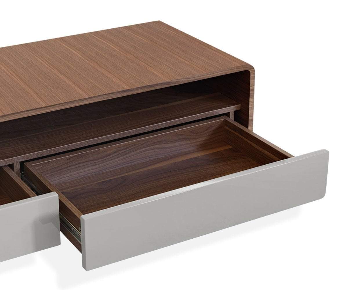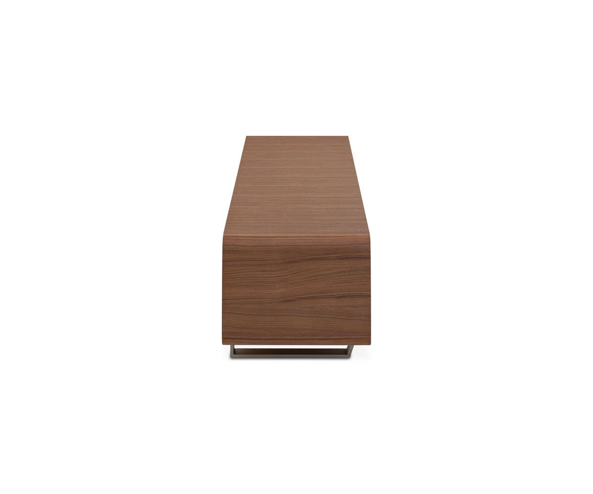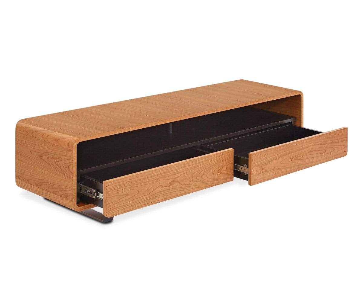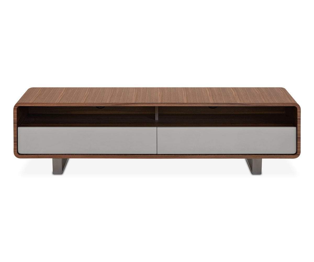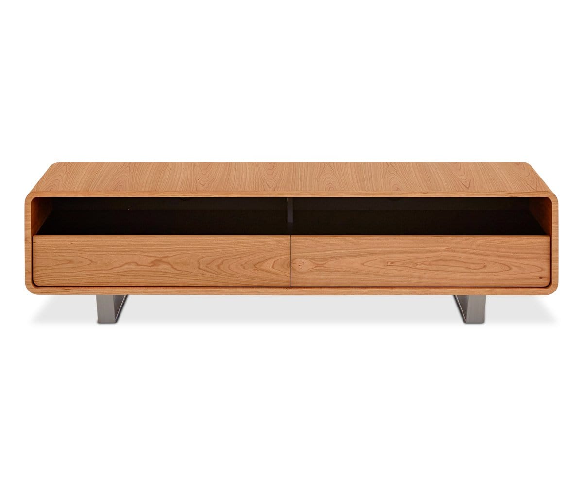 The low profile of the Baptisia 59" media stand offers sleek style without skimping on storage. Supported on two stainless steel legs, this cabinet features one long open shelf with a divider and two expansive drawers. The attractive patterns in the wood grain bring visual interest and warmth to your entertainment area.