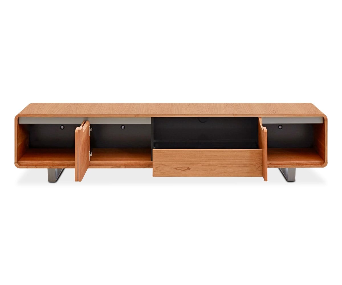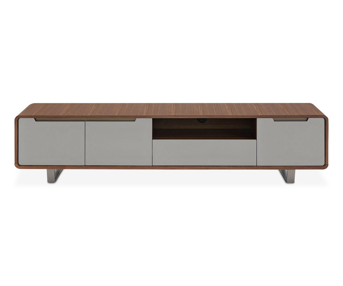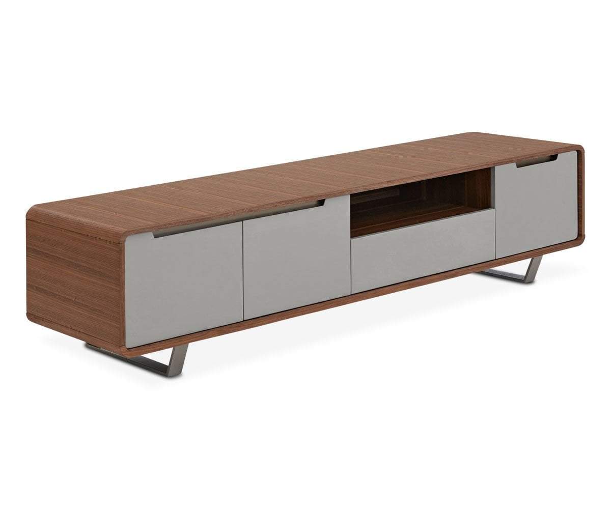 An abundance of style with a low profile defines the Baptisia 79" media stand. The distinctive open shelf is strategically placed and surrounded by three cabinets and a storage drawer in a glossy grey finish. Stow away equipment and stay organized by dedicating space for items you would prefer to keep out of sight in your entertainment area. With the attractive patterns in the wood grain, this piece adds warmth to your space balanced by the finishing touch of sculptural stainless steel legs.