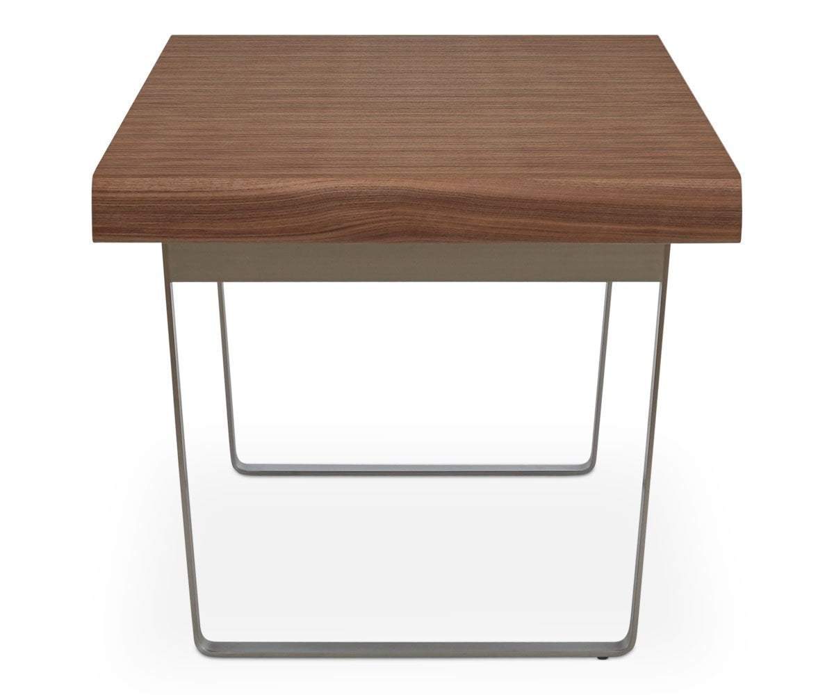 The smooth wood tabletop of the Baptisia dining table with inset sides and wrap-around ends give it both depth and personality, while the beauty of this piece is continued in the brushed stainless steel legs. Set your dining room apart from the rest as you enjoy a meal with guests in contemporary fashion and let the conversation flow.