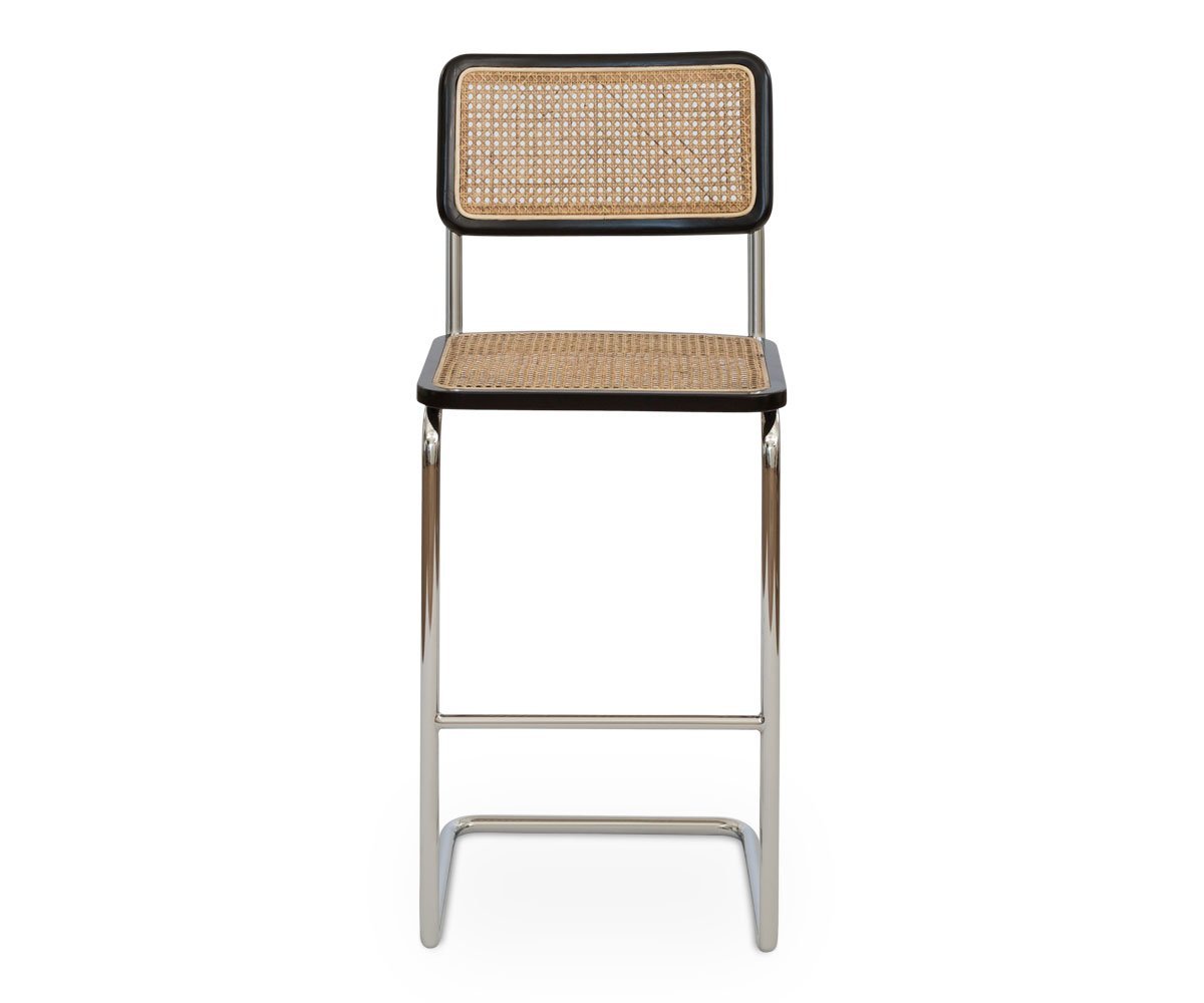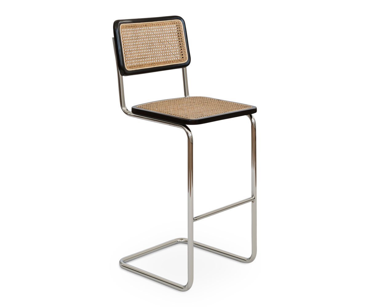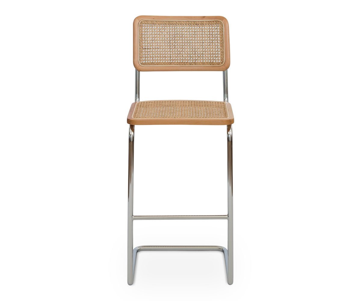 The distinctive cane seat and backrest on the Bendt bar stool are bordered in a solid European beech wood, creating a modern take on a classic design. This mix of materials, paired with the cantilevered metal frame finished in polished chrome offer an unmistakably mid-century feel to your bar area.
