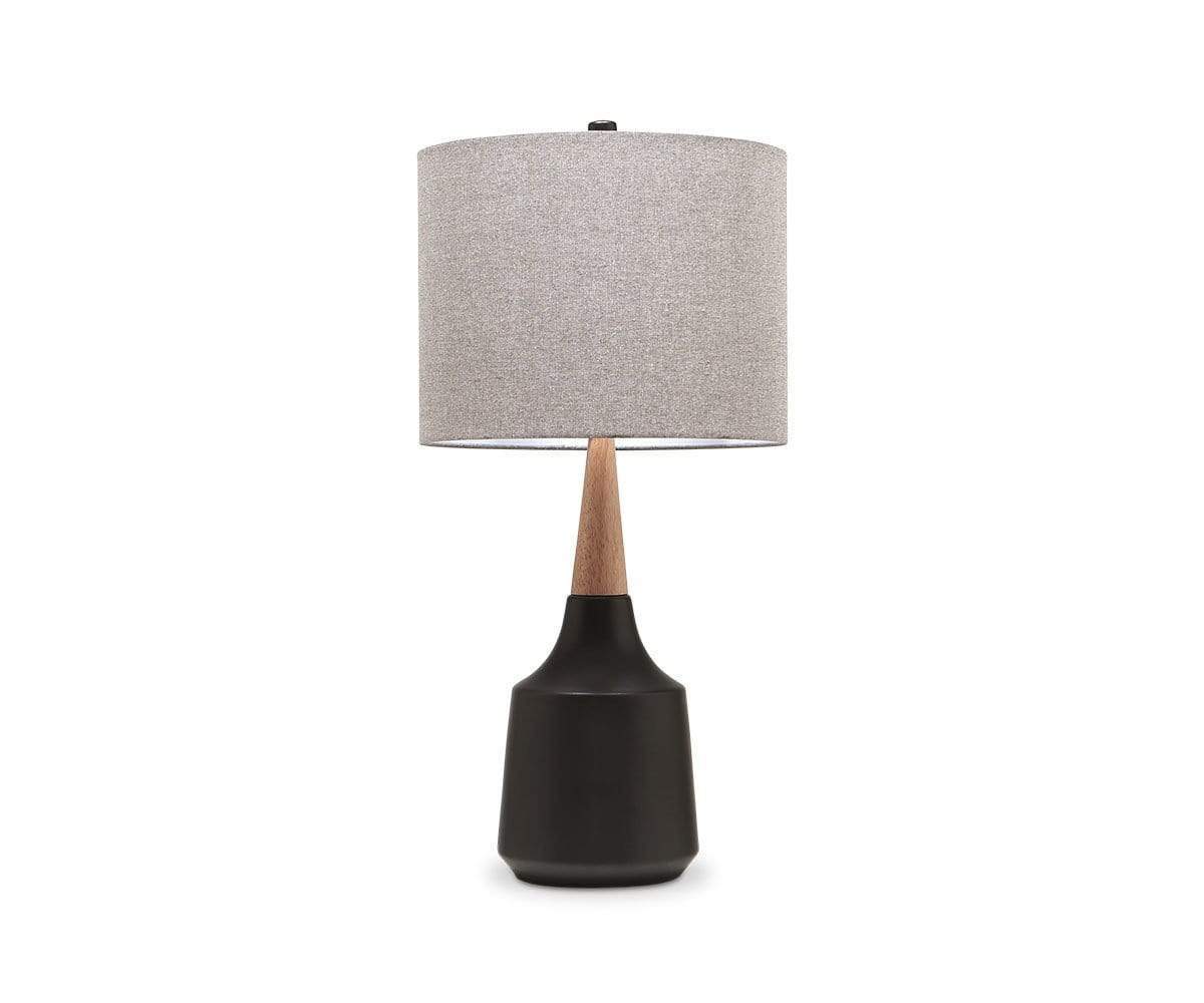 The Bergset Table Lamp brings dynamic masculine style to any room. The black ceramic base lends visual weight to the bottom of the profile, and a tapered wooden neck draws the eyes up to the grey textured fabric drum shade.