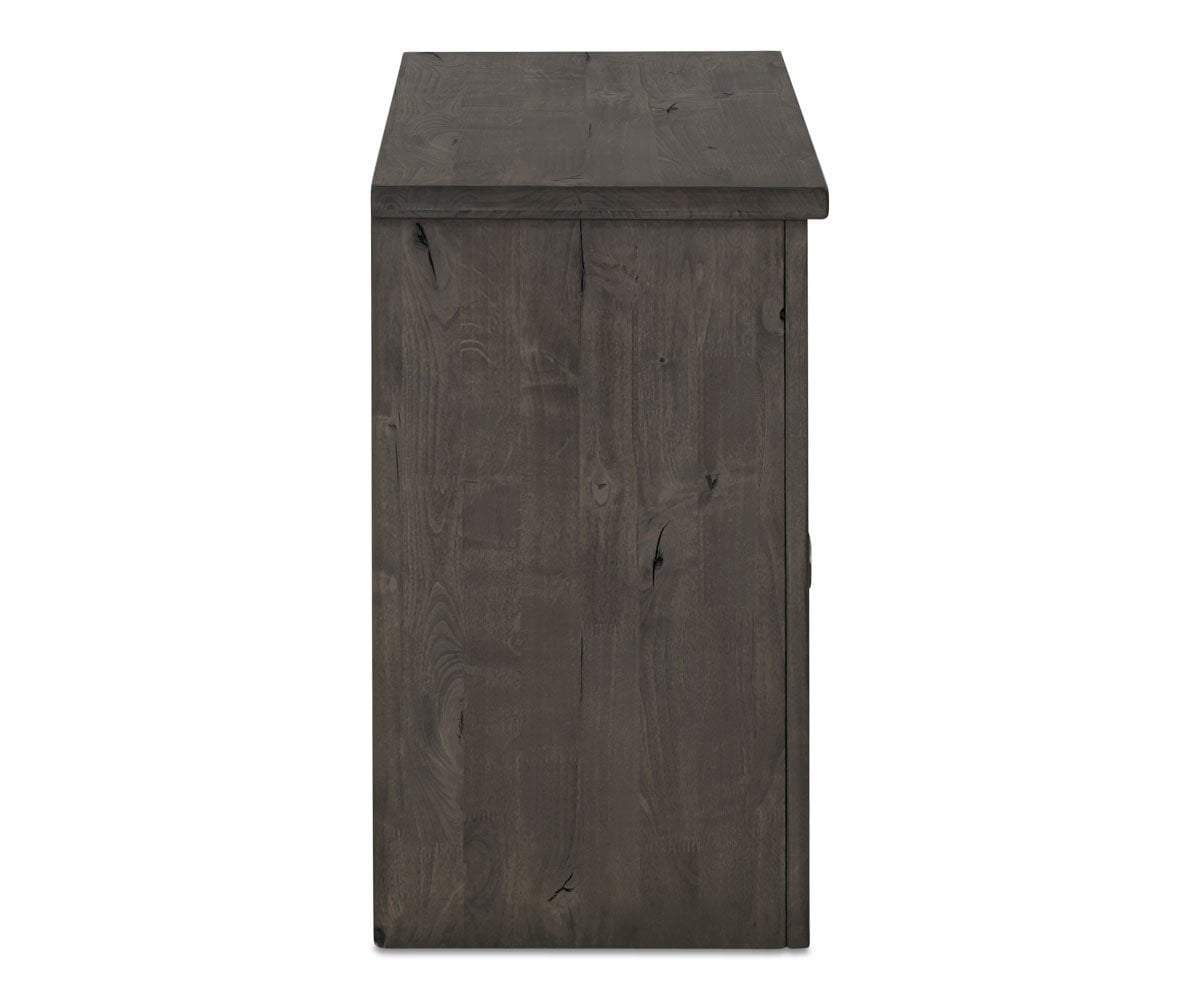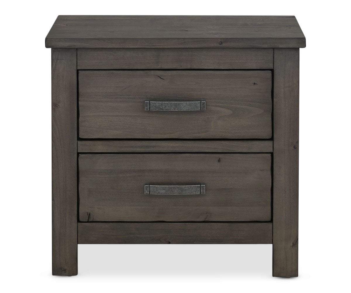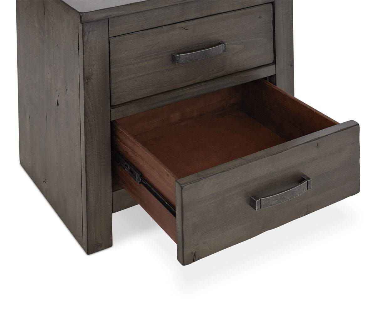 The two-drawer Carter nightstand is constructed of solid American alder wood and finished in a grey stain. This modern-meets-rustic design pairs perfectly with many decor styles while adding function and organization to your bedroom.
