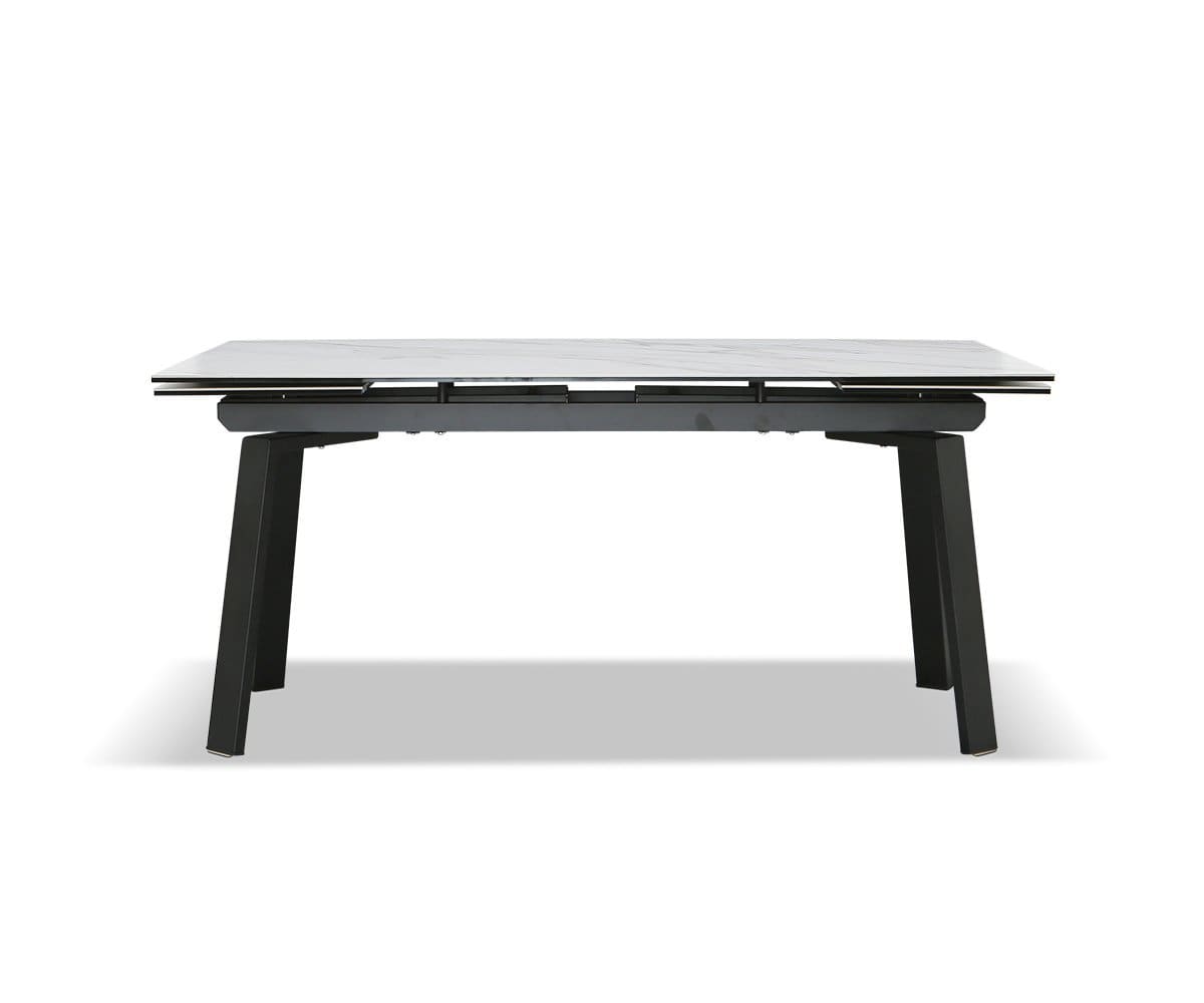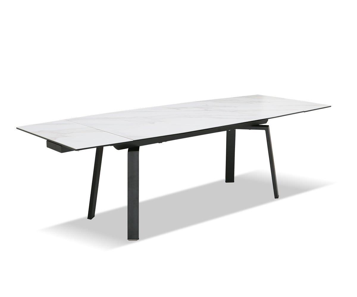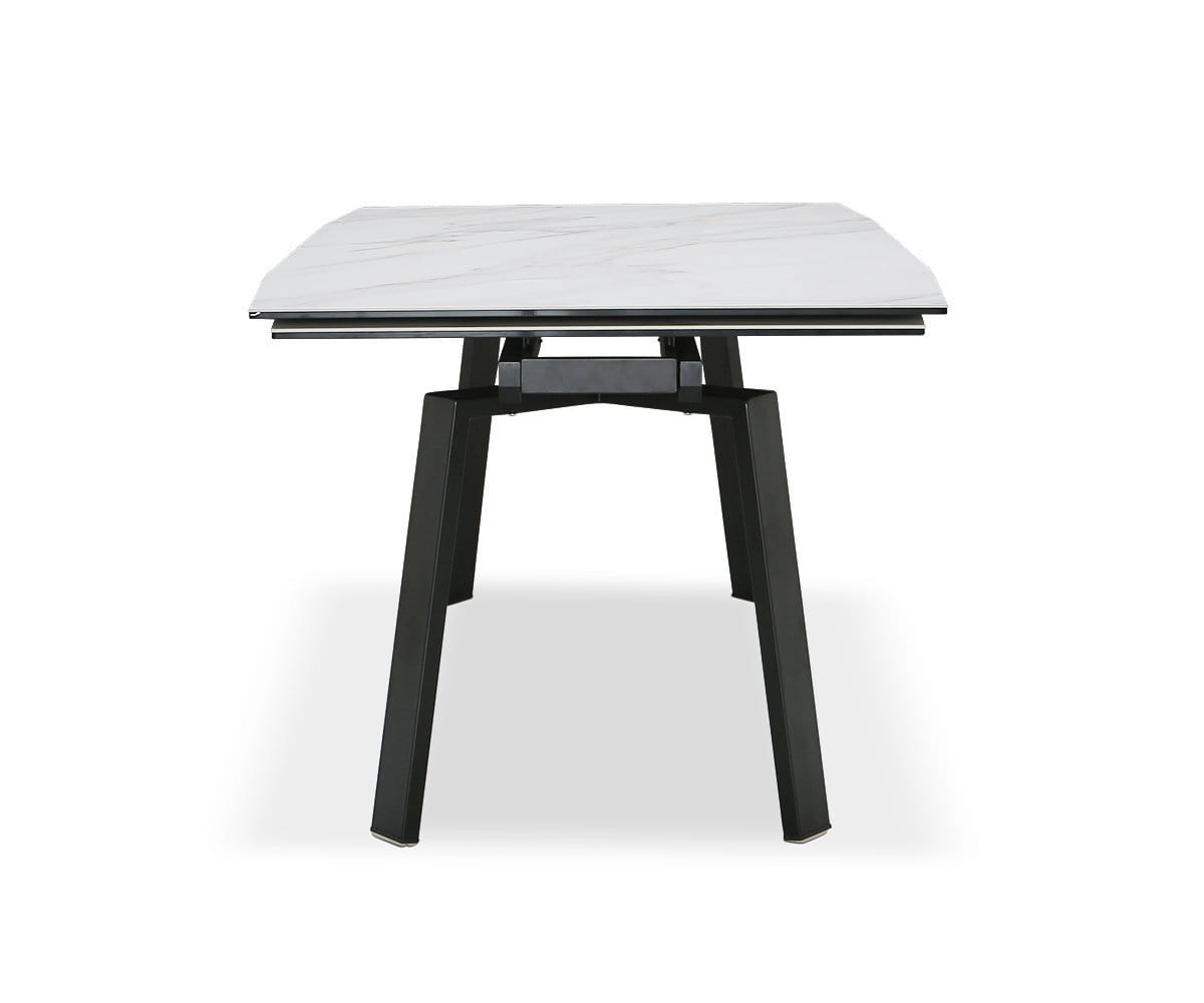 Extend as many invites as you like with the Desmi extension dining table. The black metal frame contrasts gorgeously with a pale ceramic tabletop that's both moisture and heat-resistant. With self-storing leaves that expand your seating up to 12, you're covered for any occasion.