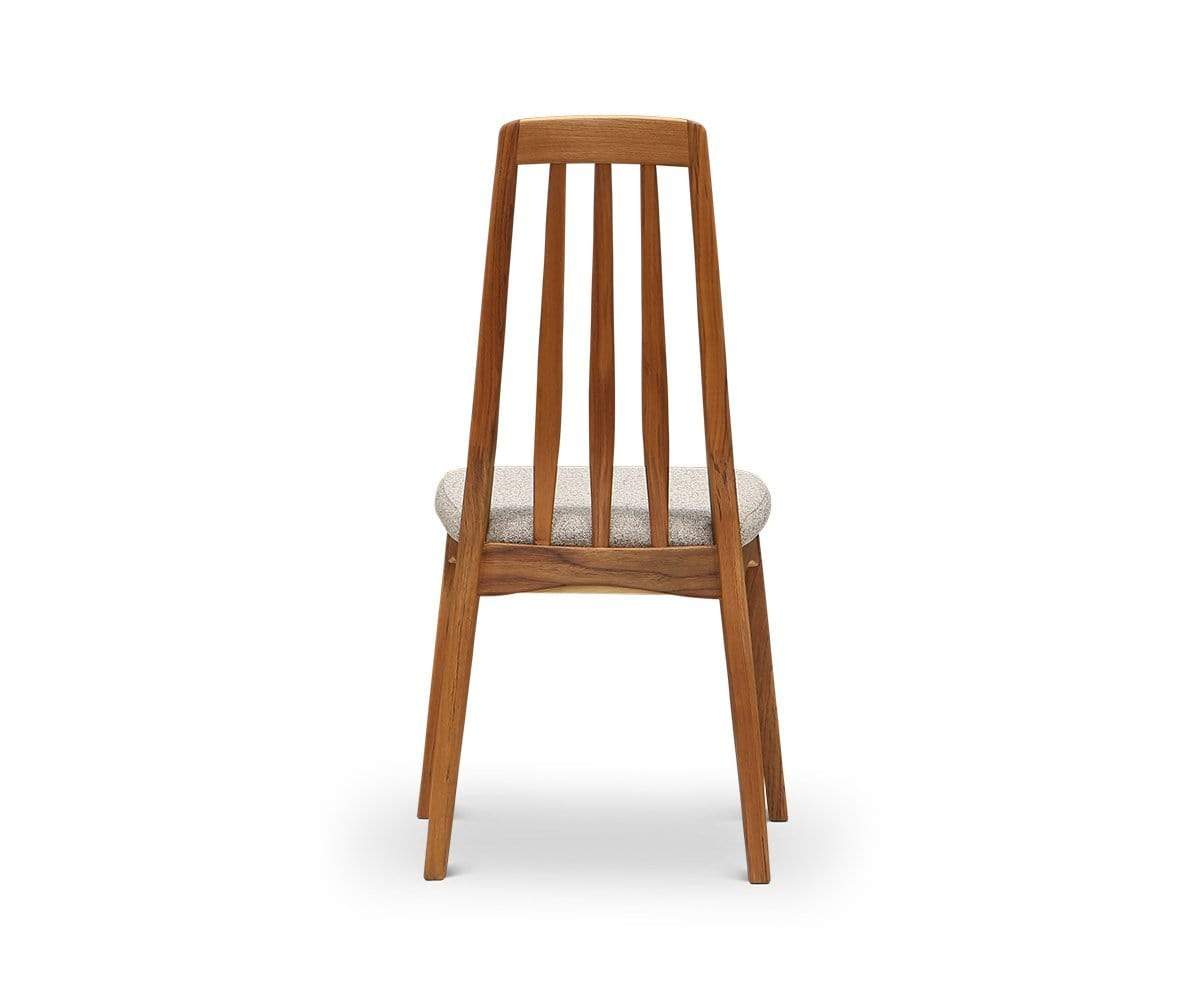The Evon dining chair pairs well with contemporary, modern and transitional decor. The high slatted backrest and curved aprons contrast with the straight legs. It’s crafted with a teak wood frame and cushioned fabric seat.