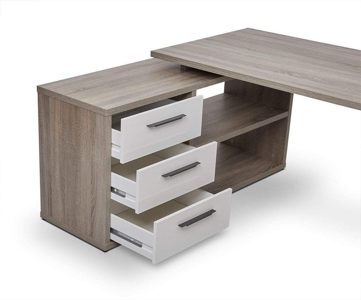 Select the Gammel desk with storage return to create an attractive work environment that encourages productivity. Featuring ample surface space and three drawers combined with an open cabinet, organization and storage come easily. Made in Italy of eco-friendly materials, the white high gloss drawer fronts enhance the truffle oak finish of the desk and cabinet. Equip your office with modern style and neutrals that fit with many decor themes.