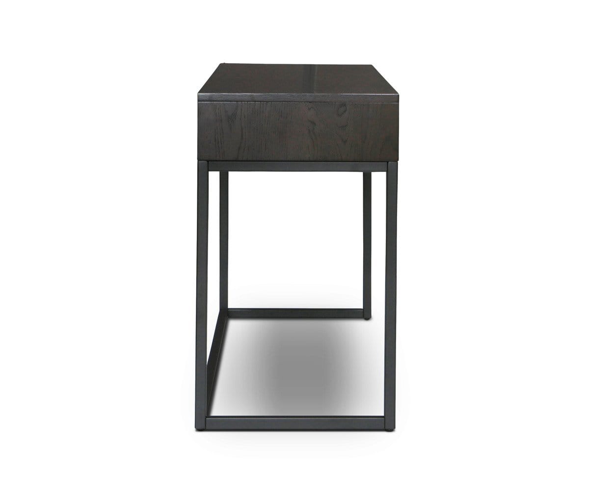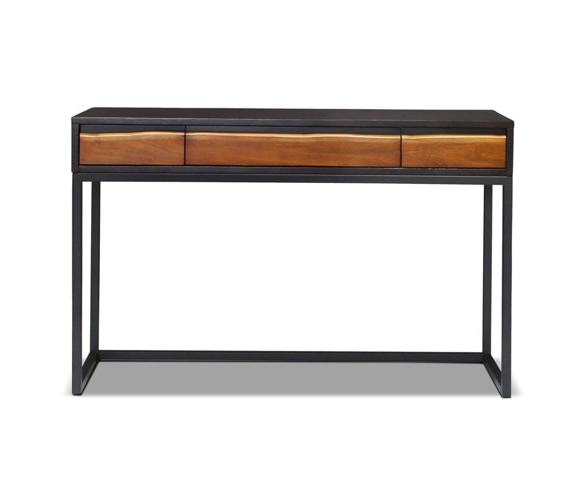 The Hasse console is stately yet airy, an effect produced by the minimalist black metal base and solid American poplar frame. Three drawers provide space for keeping miscellaneous items tucked away within reach. A rich timber brown stain enhances the wood grain.