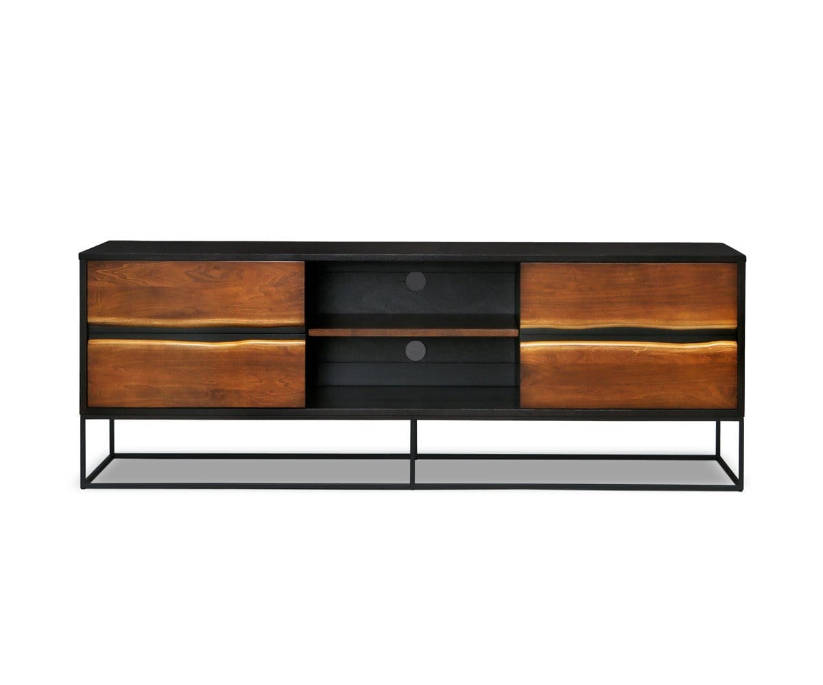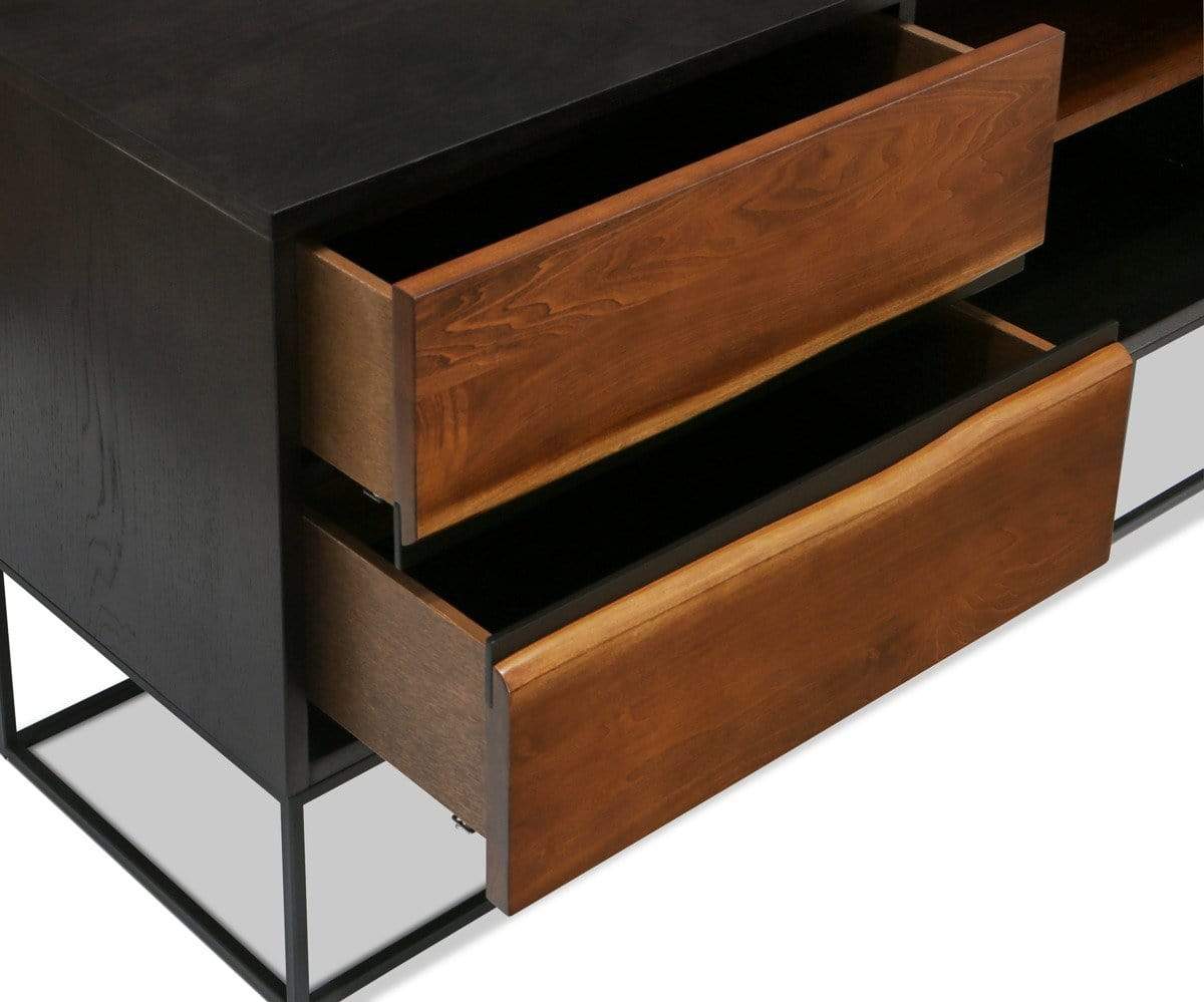 Update your entertainment area with the Hasse media stand. This modern, rustic industrial stand is crafted with a metal base and solid American poplar frame and drawers. The frame is finished in black to match the base. Two open shelves in the center set off the woodgrain of the drawers on either side.