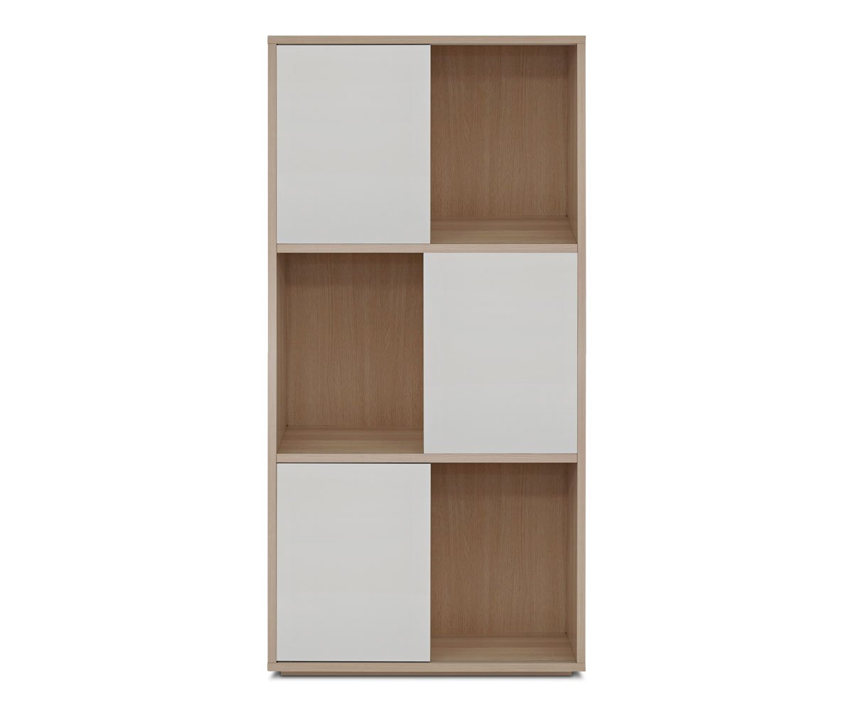 Tall, sleek and mod the Hayden bookcase can change its look with ease. Six storage cubbies become hidden or exposed as you slide the three white doors from side to side. This substantial piece crafted in Italy, complements many different decor themes with its light neutral color palette. Choose objects to display, yet easily access anything you store out of sight.