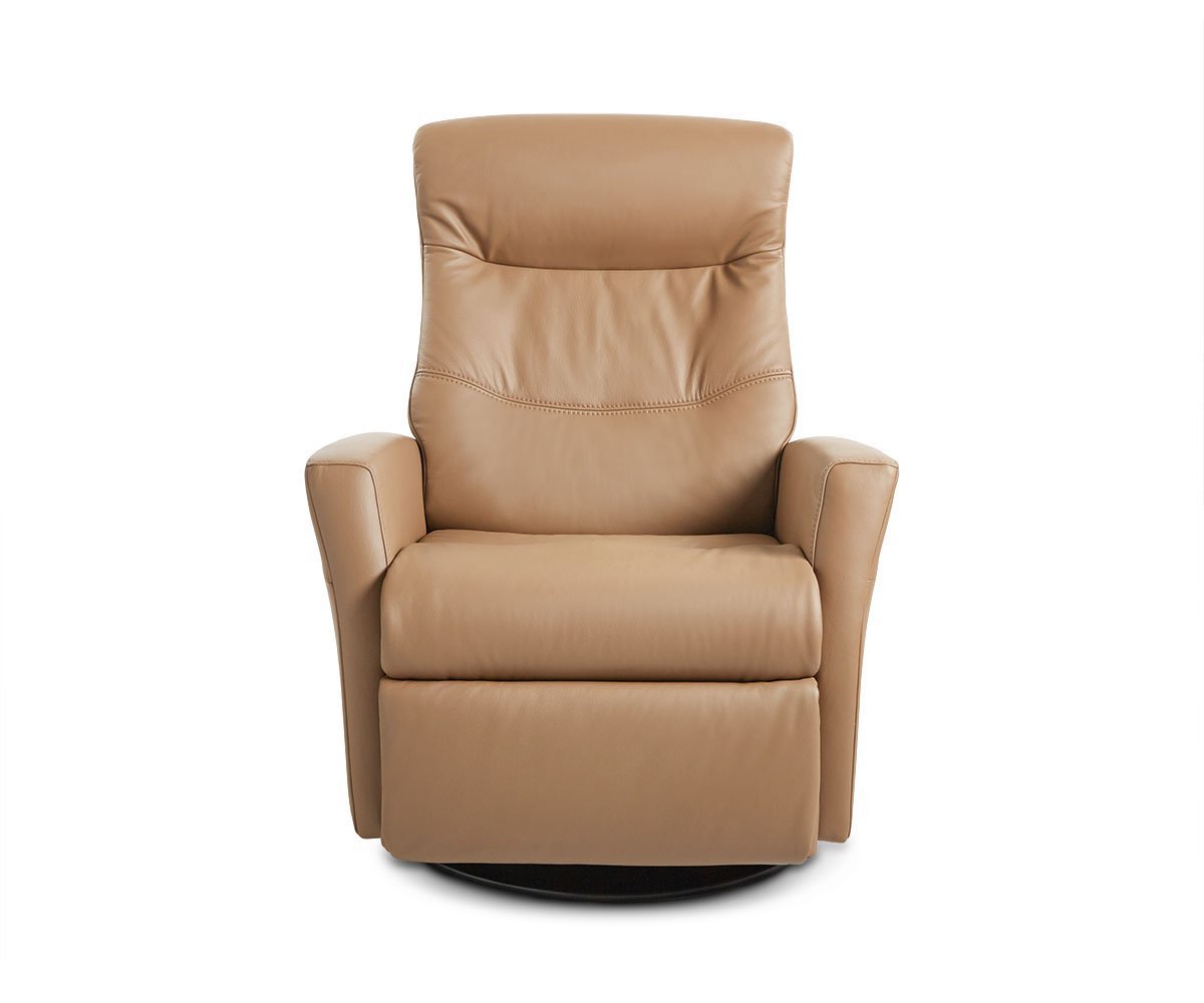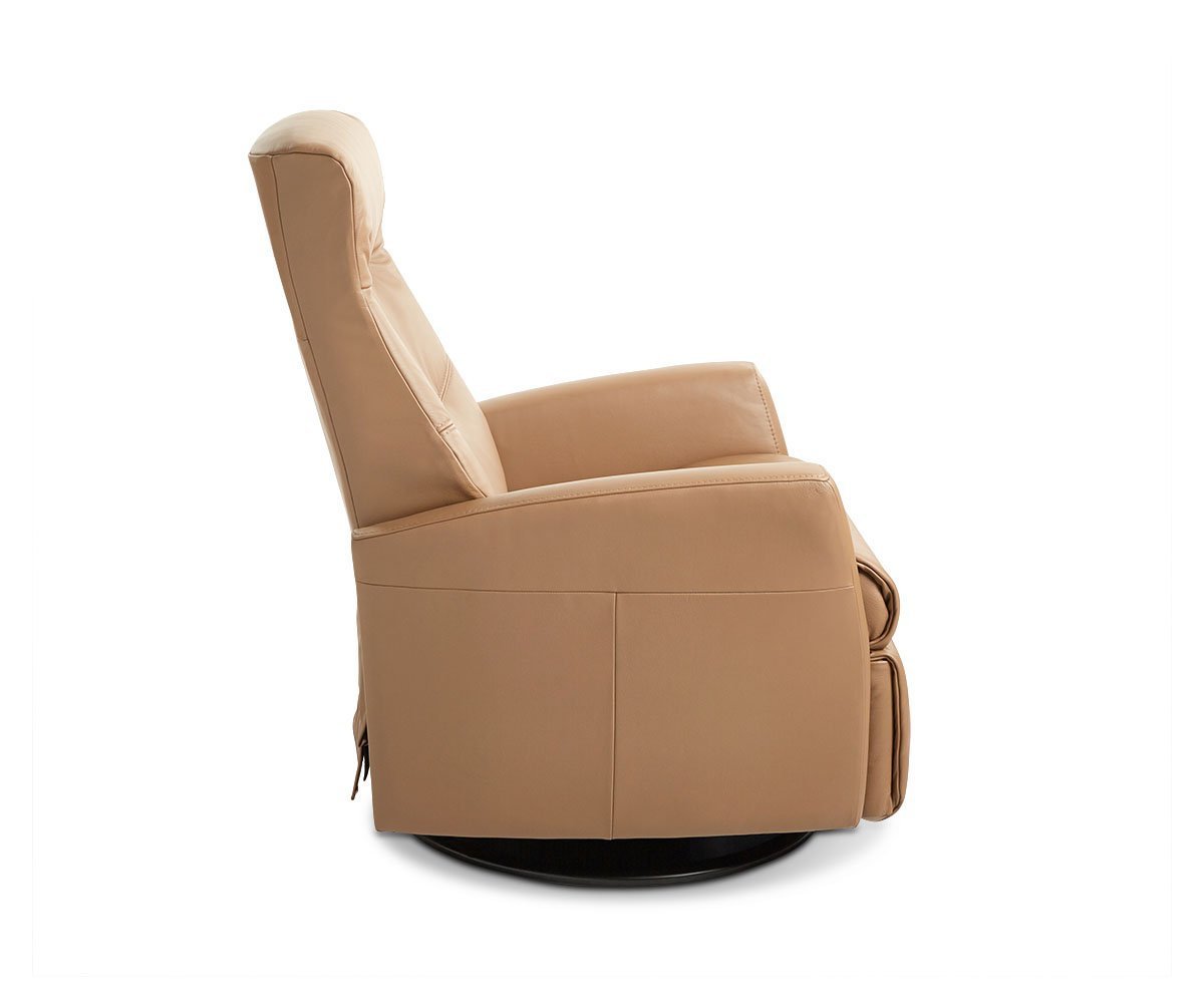 Establish your home comfort zone in grand style with the Hedvig manual recliner. Upholstered in fine leather, it provides full body support from head to toe while allowing you to swivel, glide, rock or recline to your heart’s content. You will find the lever for the reclining feature cleverly wrapped in matching upholstery and located inside the seat area. Designed with durability in mind, this chair will provide years and years of relaxation. Just settle in, put your feet up and unwind.