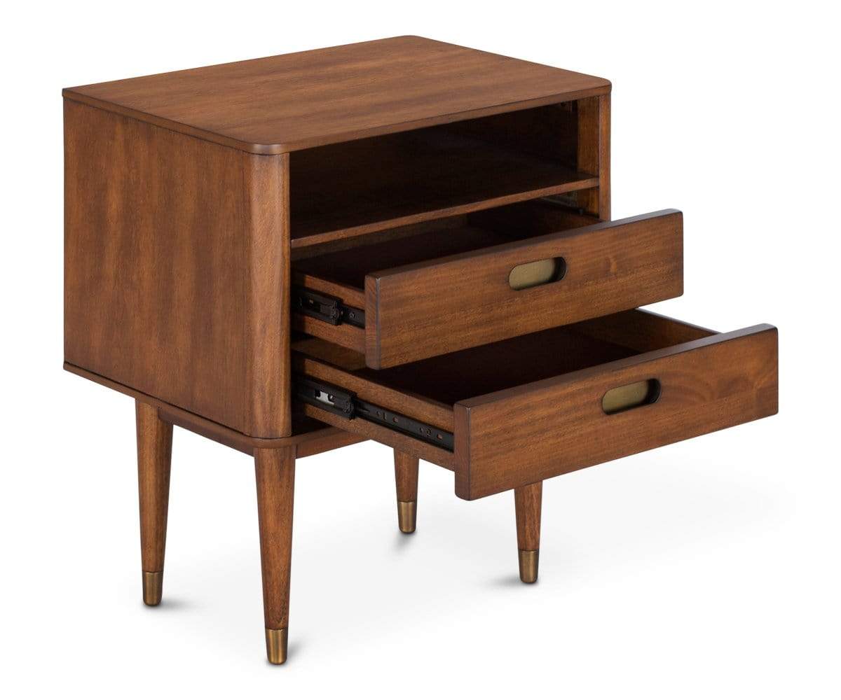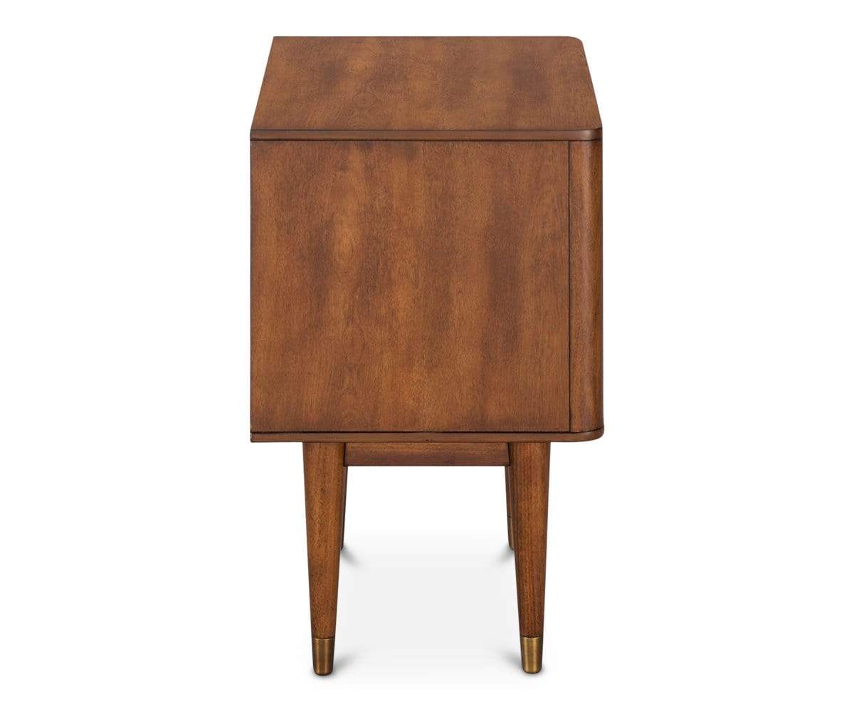The Holfred nightstand boasts a combination of storage for your bedside with two drawers and a display shelf. Simple lines in the design are accented by the fine attention to detail from the exquisite cutouts of the drawer pulls to the brass capped feet.