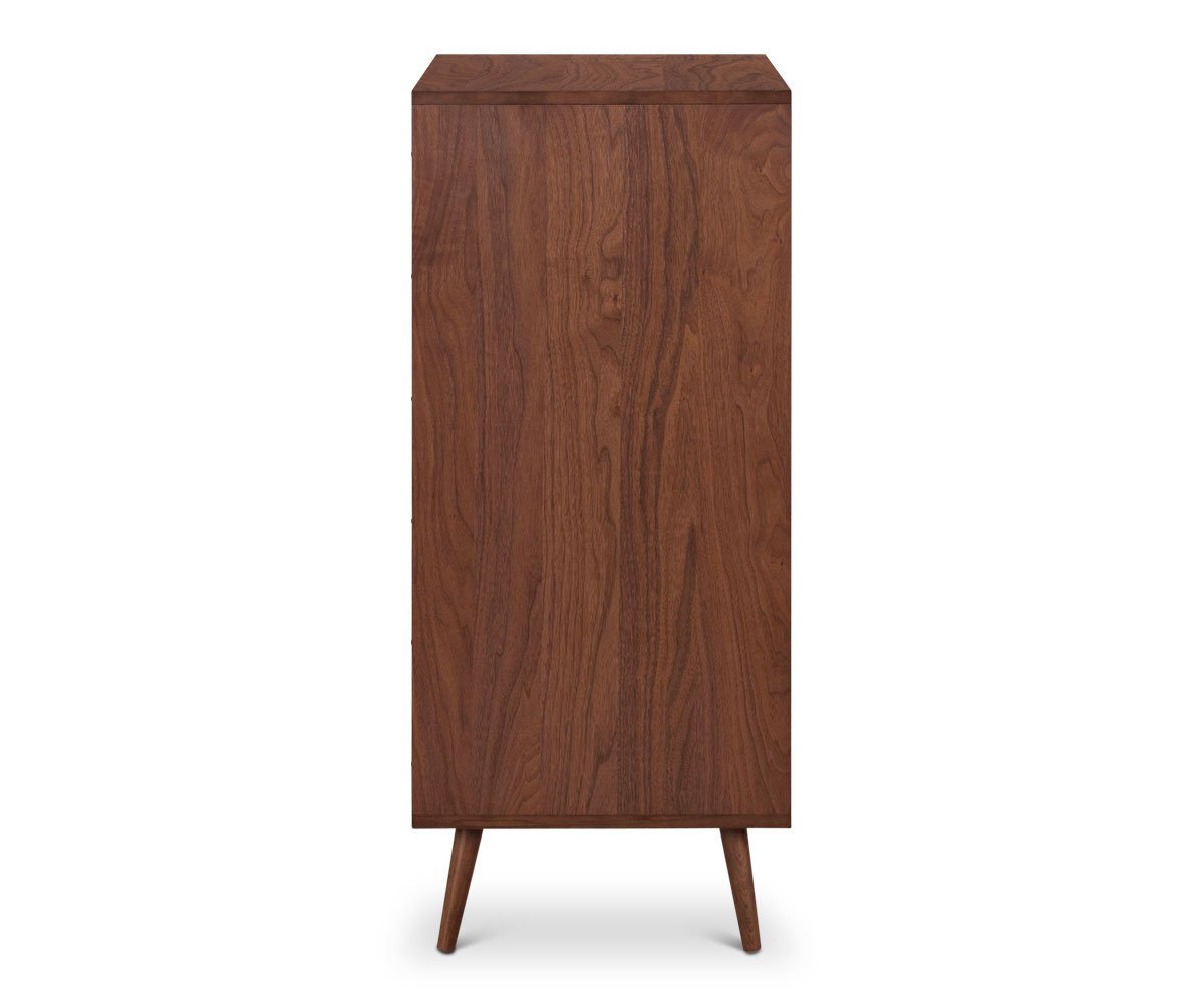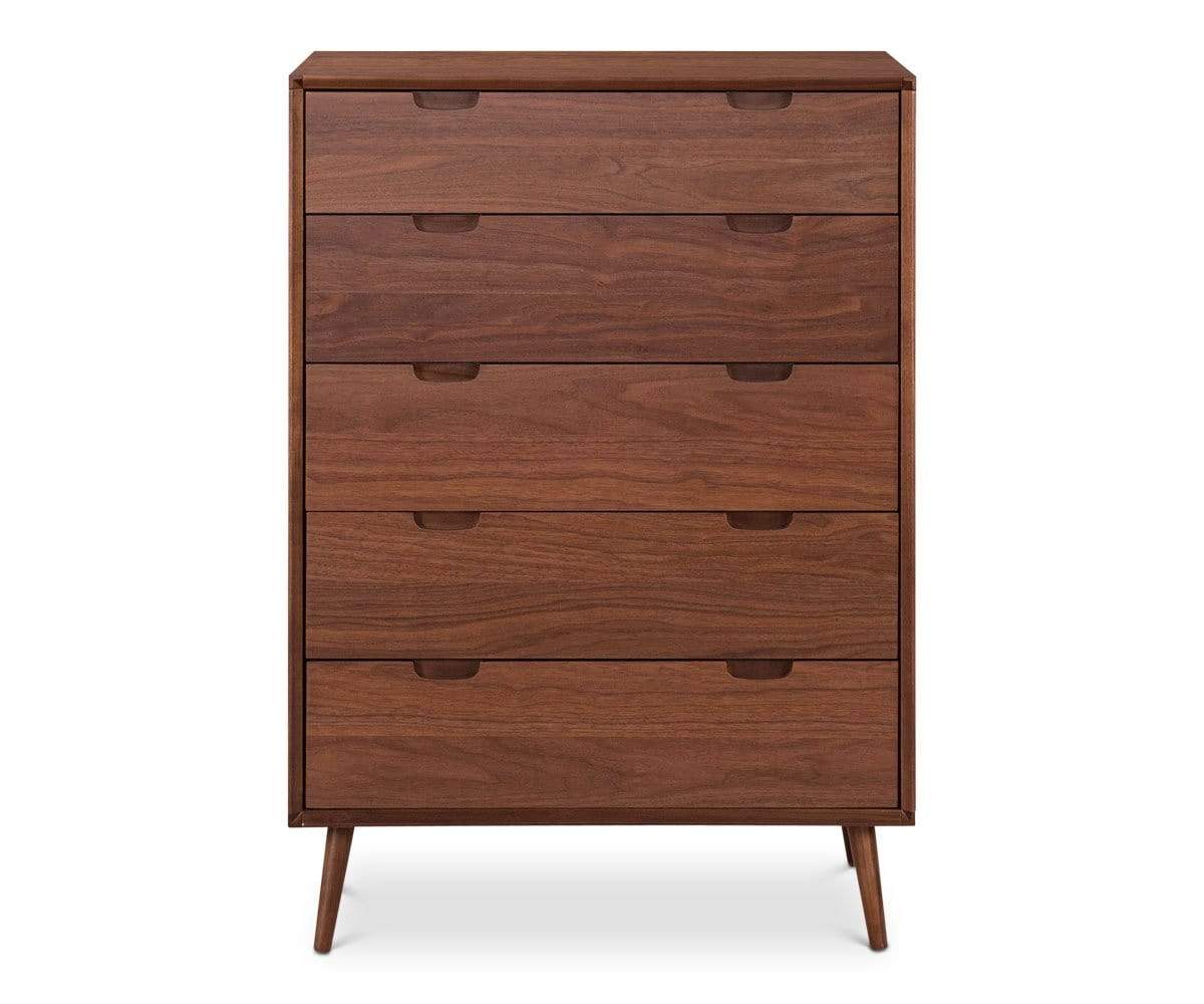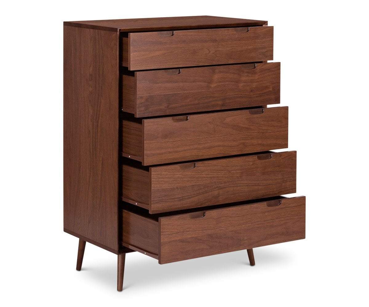 Adopt a timeless look for your garment organization with the Juneau high chest featuring five large drawers, all equipped with smooth-glide functionality. The clean silhouette and angled, tapered legs add visual interest and mid-century appeal.