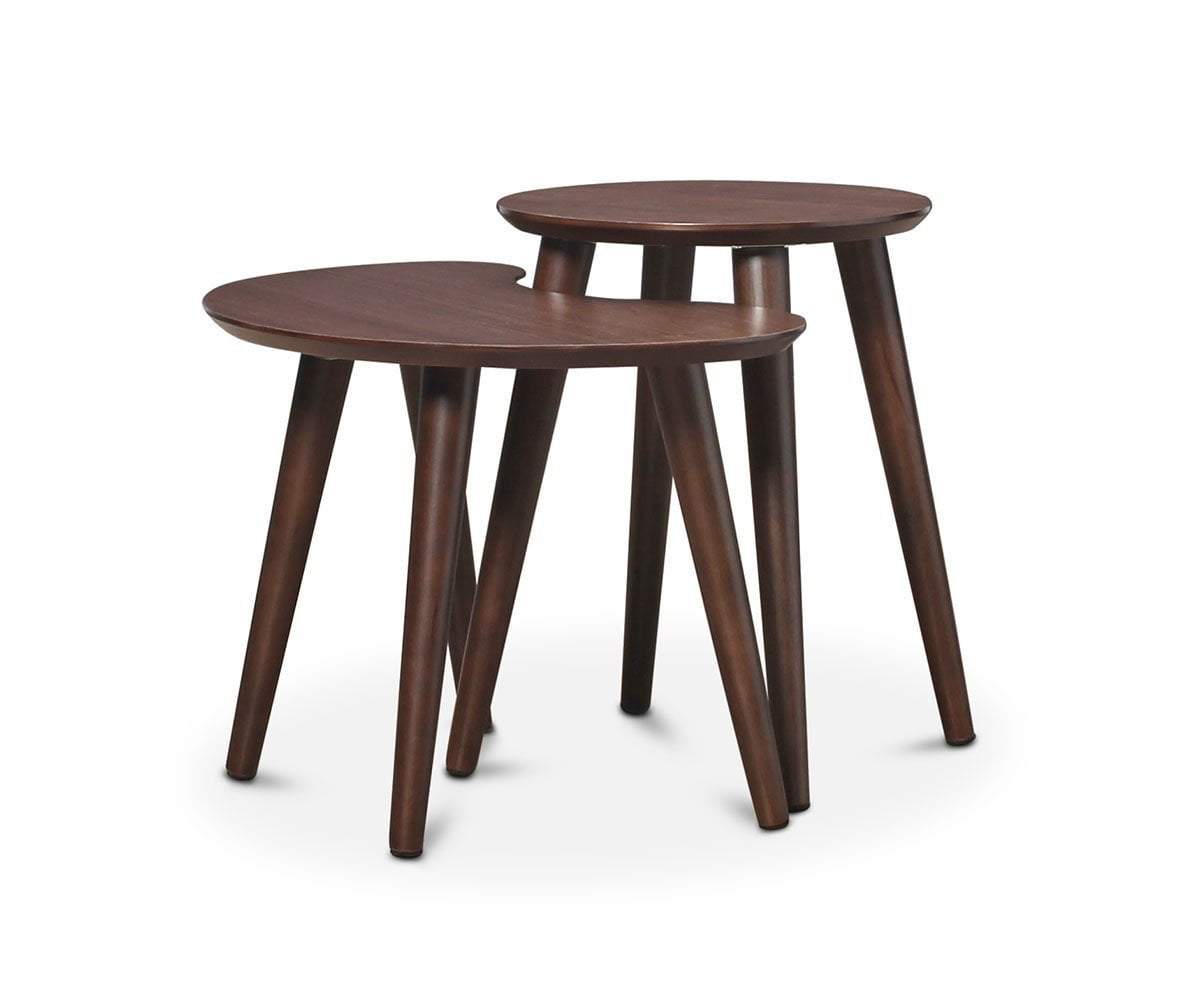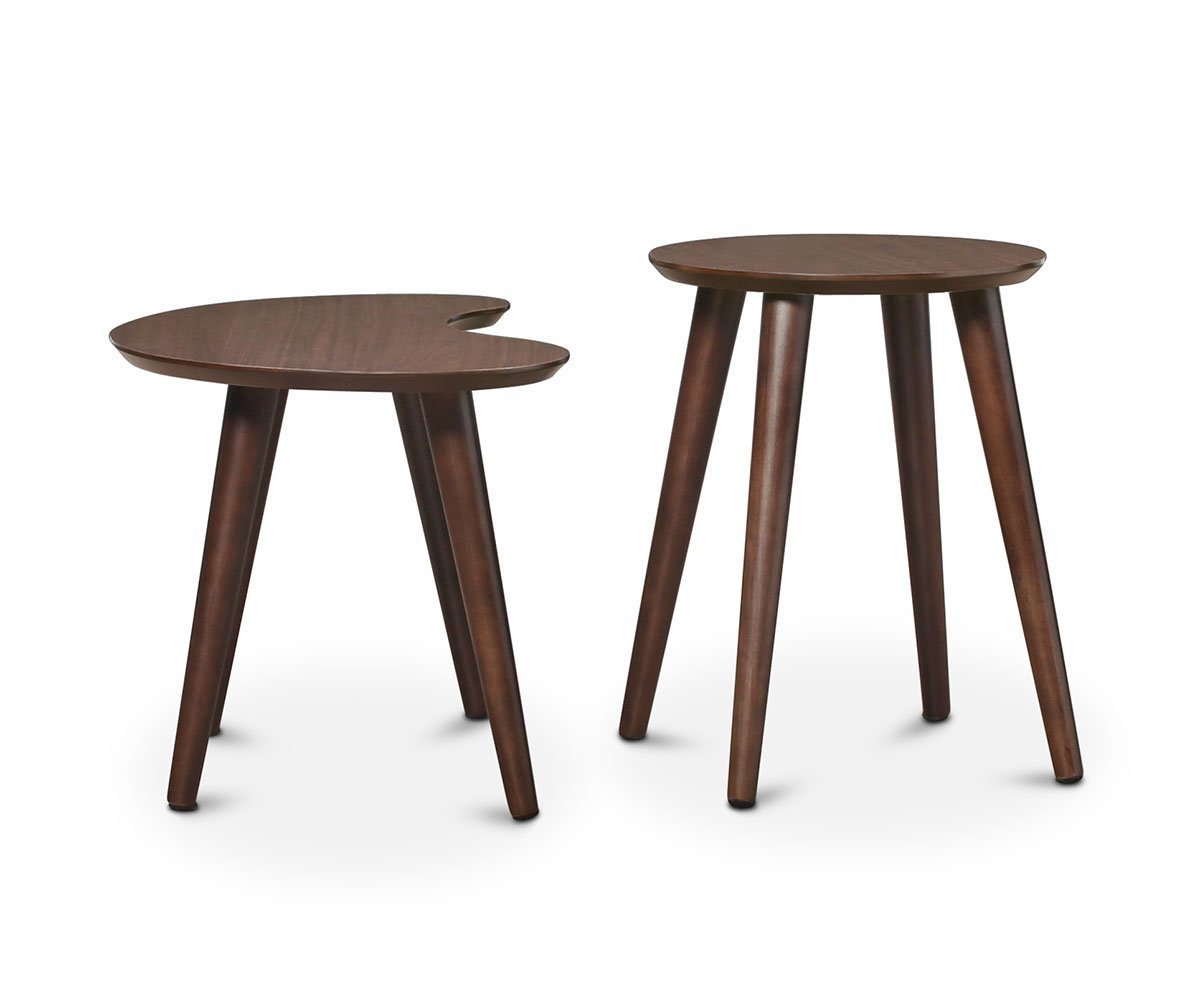 Add mid-century modern style to your living space with the Juneau nest of tables. This pair displays the classic lines and warm wood tones reminiscent of the era, while incorporating elements of modern design and quality craftsmanship. The shorter table with a kidney-shaped top nestles against the taller, round table. Placed together, they give the illusion of one extended surface, or separate them to use in different locations. Both stand on elegant tapered legs, slightly angled to complete its graceful aesthetic.