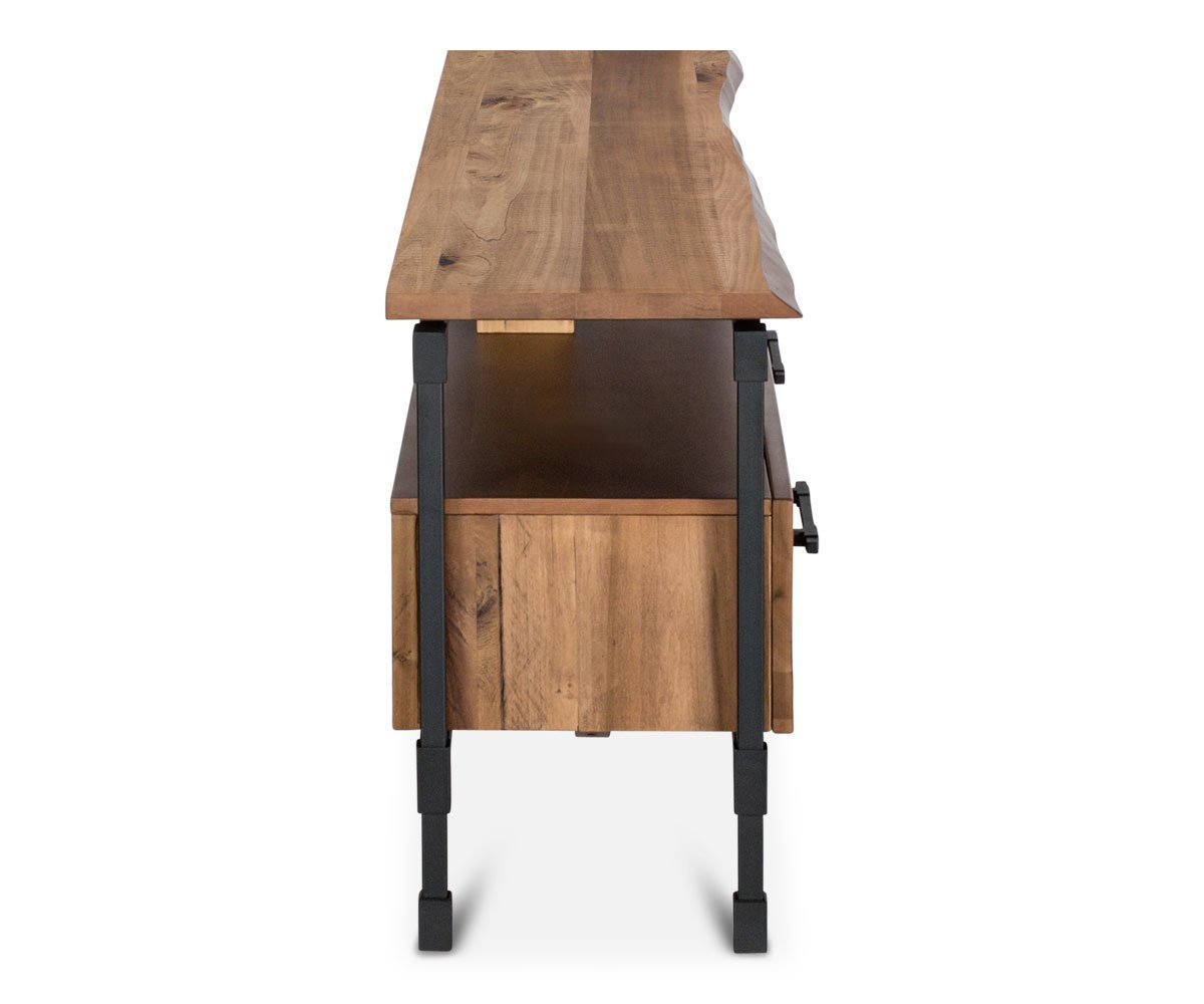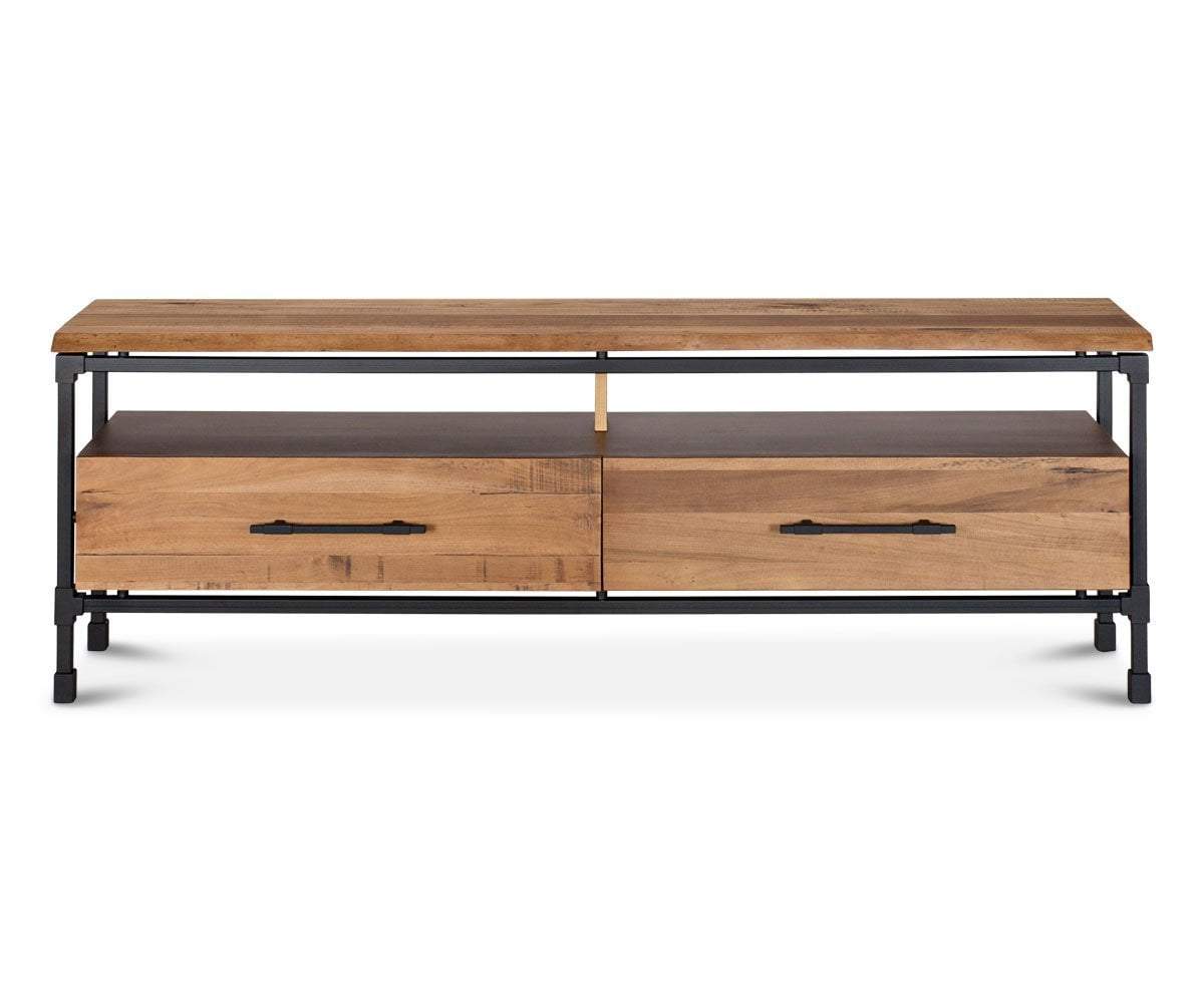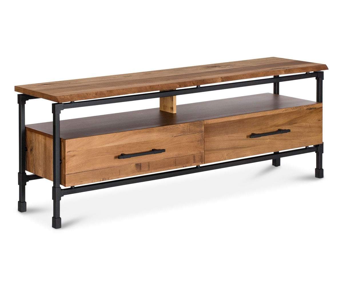 Streamline your industrial chic space with the Karsten media stand. This modern design features a mix of a live edge word top, rustic wood drawers and shelves supported by a powder-coated steel frame. Two large drawers store media, remotes and more.