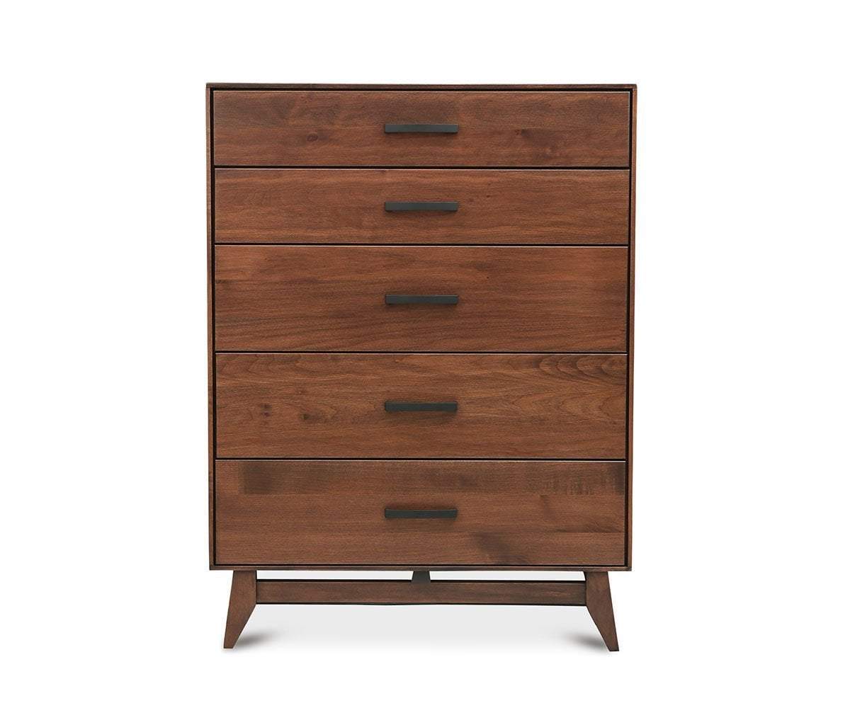 Made in the USA, the Kelby high chest stands proudly displaying mid-century modern design. Crafted of solid Oregon maple, the natural characteristics visible in the wood make each piece unique and lend to its organic beauty. The five drawers are finished with sleek, powder-coated metal handles to provide a subtle contrast against the overall warm tones. Tapered legs set at an angle, add the classic touch to this timeless bedroom storage piece.