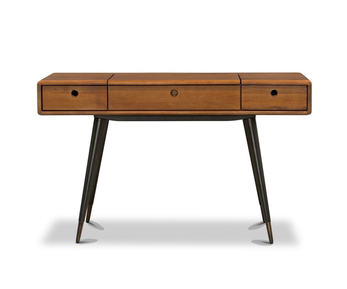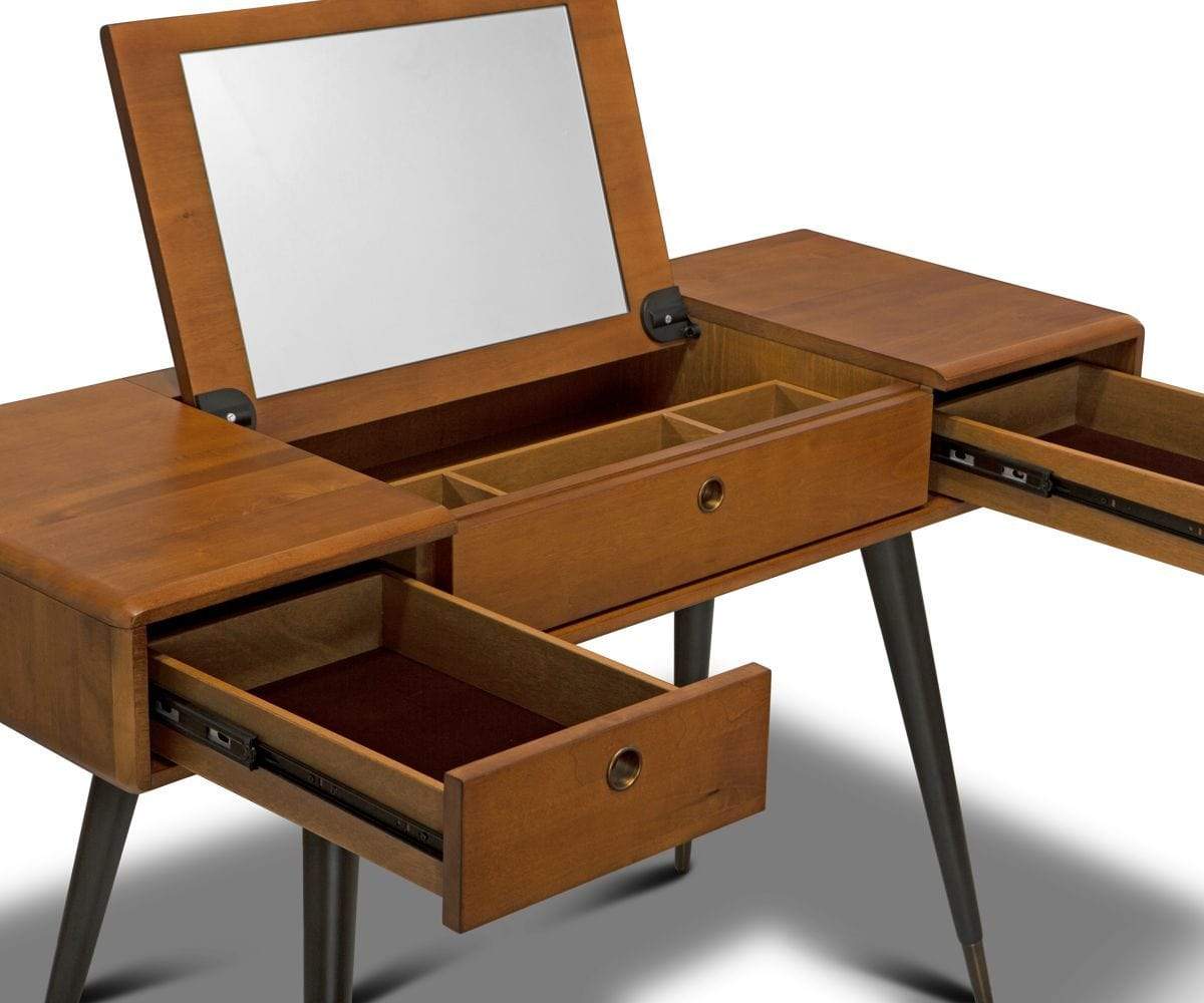 Did someone say statement-maker? The Lanson vanity is one of our newest favorites, a piece that melds exquisitely crafted storage with mid-century aesthetics in a classic way. Two drawers stash necessities, while the flip-top opens to reveal a mirror and segmented compartments. Angled, brass-capped legs give this a delicate, stylish finishing touch.