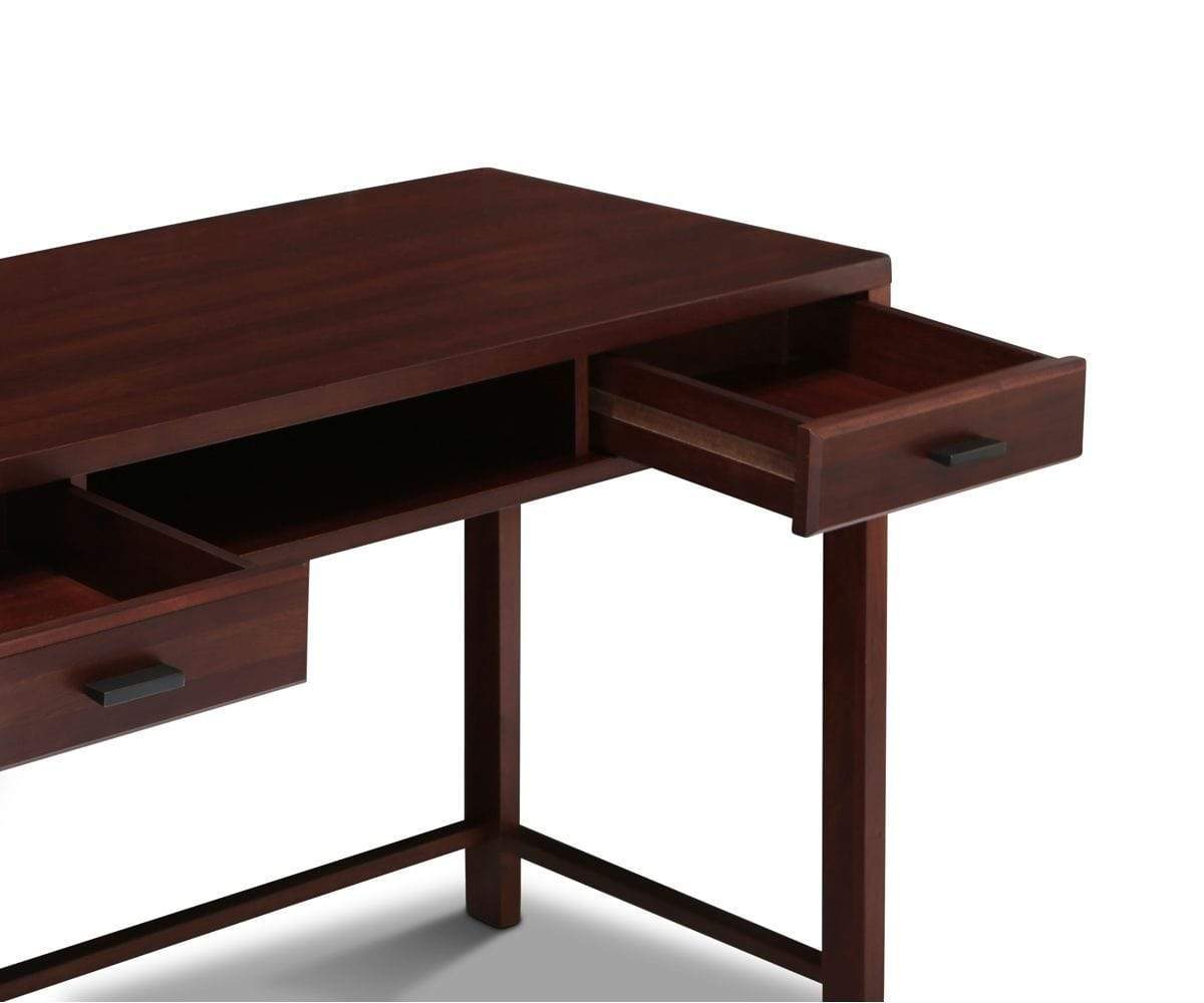 When you pair solid wood with an open shelving design, you get a fascinating blend of minimalism and warmth. The Lark desk is crafted from mahogany and finished with an earth-toned stain. An easy-access compartment and 2 spacious drawers provide storage, while the desktop gives plenty of space for productivity. Bonus: the Lark desk is modular, configure it with other components like the Lark bookcase to create a modern workspace.