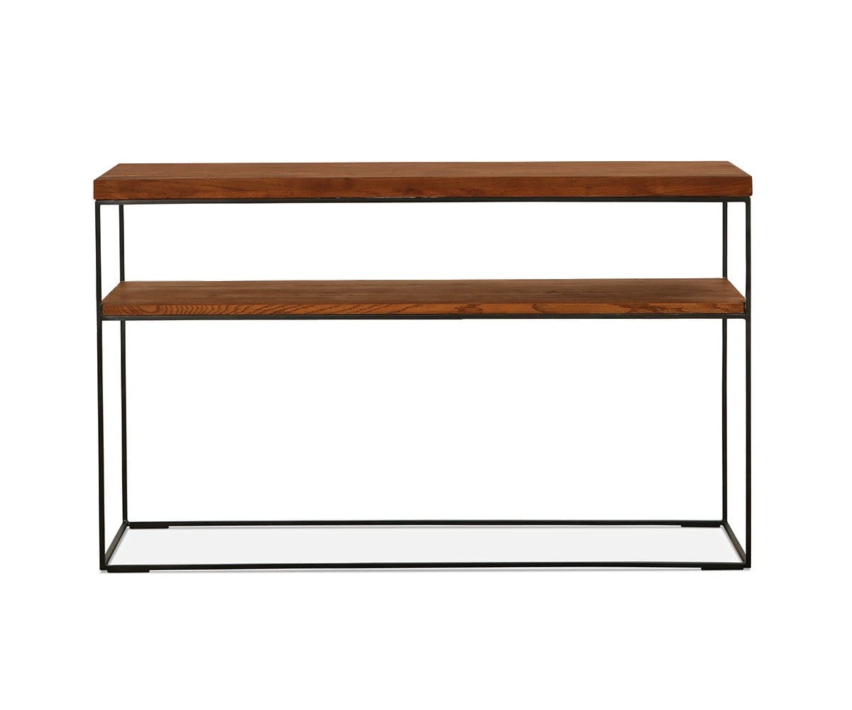 Strong yet refined, the Leende console table adds a touch of rustic industrial style to your living space. Its slim steel frame and legs support the smooth, solid European oak top and lower shelf, which allows open storage and display surfaces for refreshments, remotes, books, magazines and more.