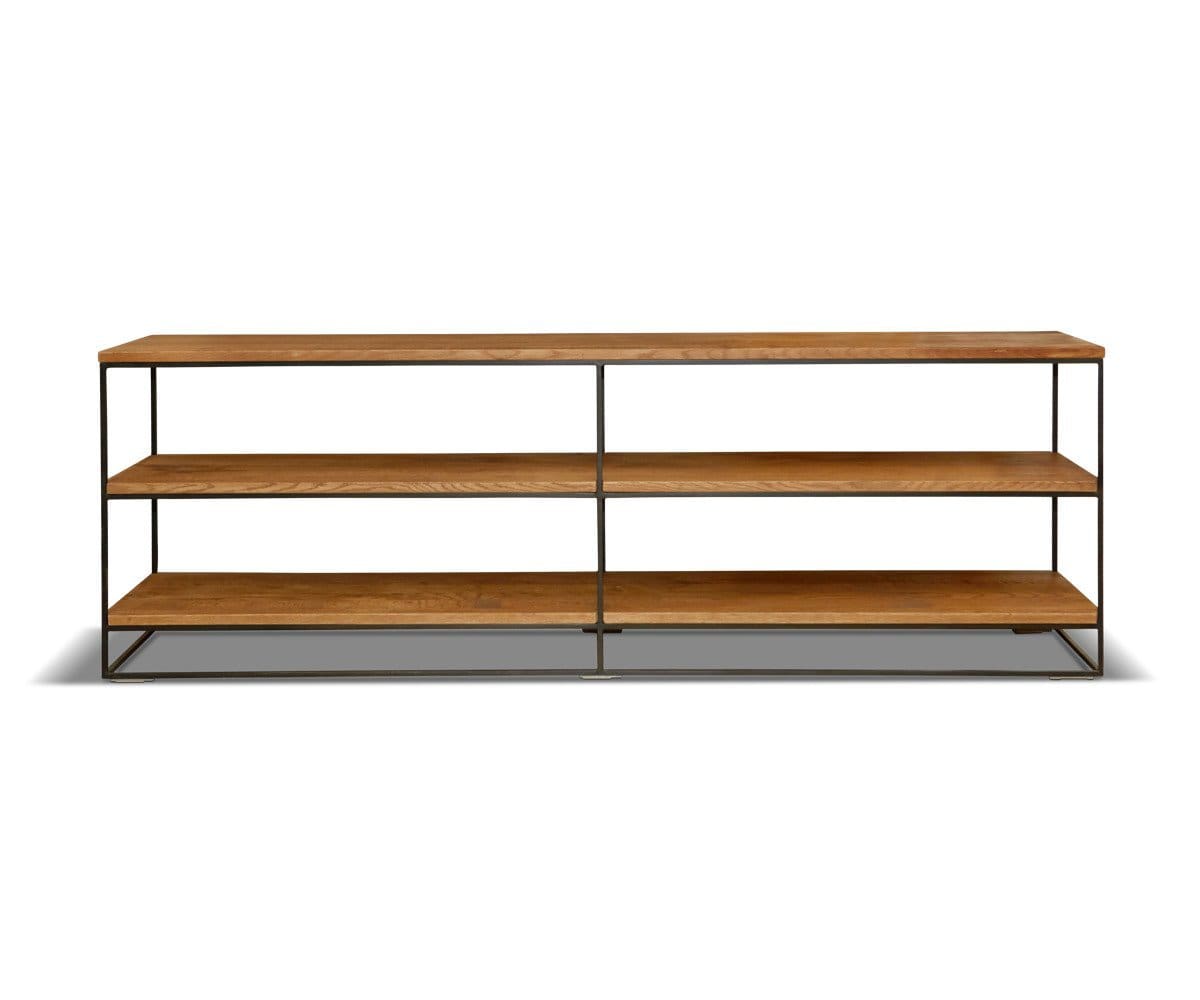 The Leende low bookcase strikes a balance between modern and rustic. It all starts with solid European oak, a rich, robust hardwood traditionally used in Scandinavian craftsmanship. Evident in the wood are natural cracks, knots and color variations which make each piece unique. Blackened steel is used for the frame for superior durability. The clean angles and blackened finish add an industrial feel to this piece.