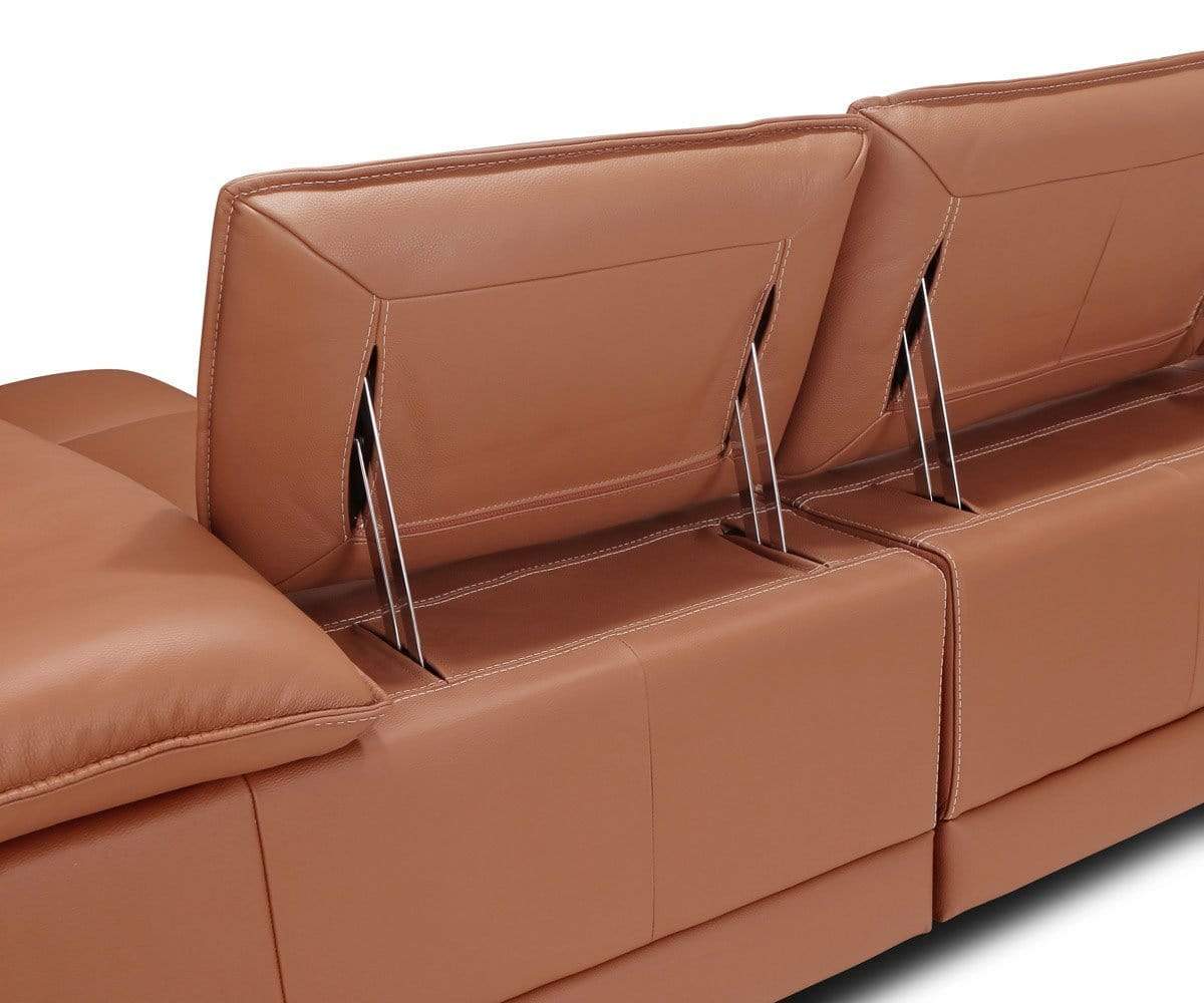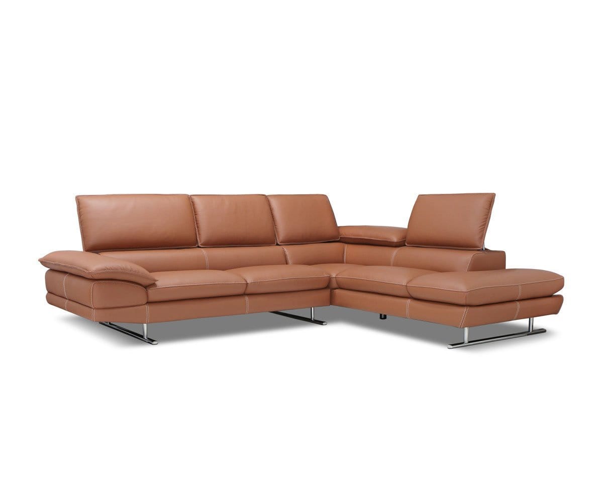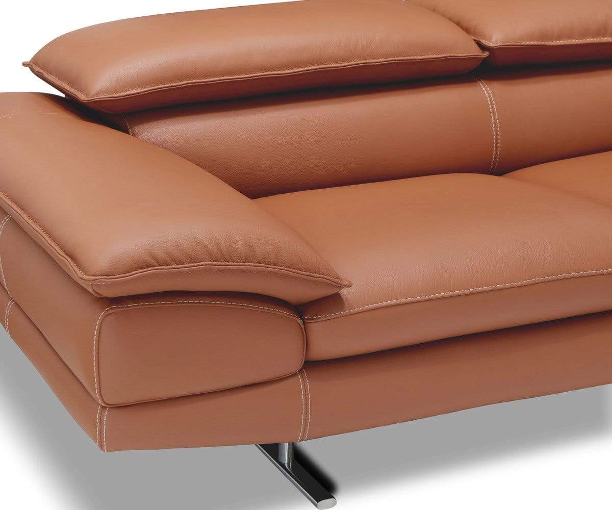 Make a statement of modern style and ultimate comfort with the Mauro leather sectional. Crafted in Italy, it features durable metal legs for a sleek and airy elevated look. Plush cushions are enveloped in rich cognac leather upholstery with contrast beige stitching. Ratchet headrests allow for various moods – up for watching tv or down for a more conversational feel. Elastic webbing suspension in the seats ensures lasting comfort.