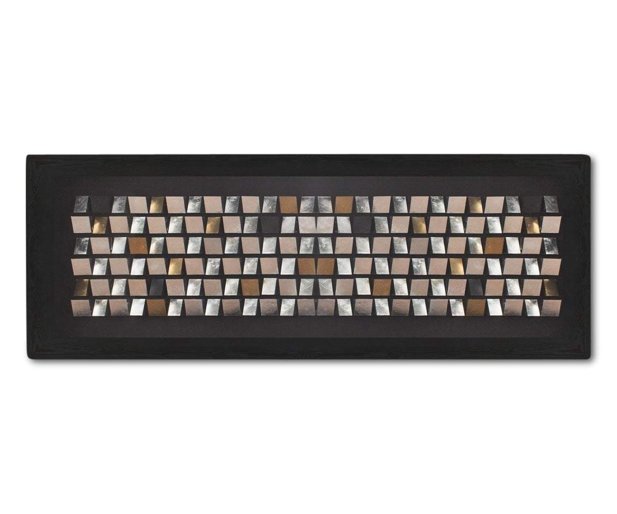 Modern art enthusiasts will love the energetic Mialata graphic. Black, antique silver and gold parallelograms create a large dimensional rectangular shape. Includes a thick black frame.