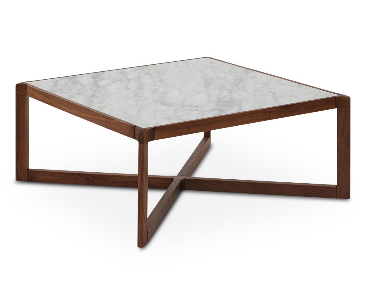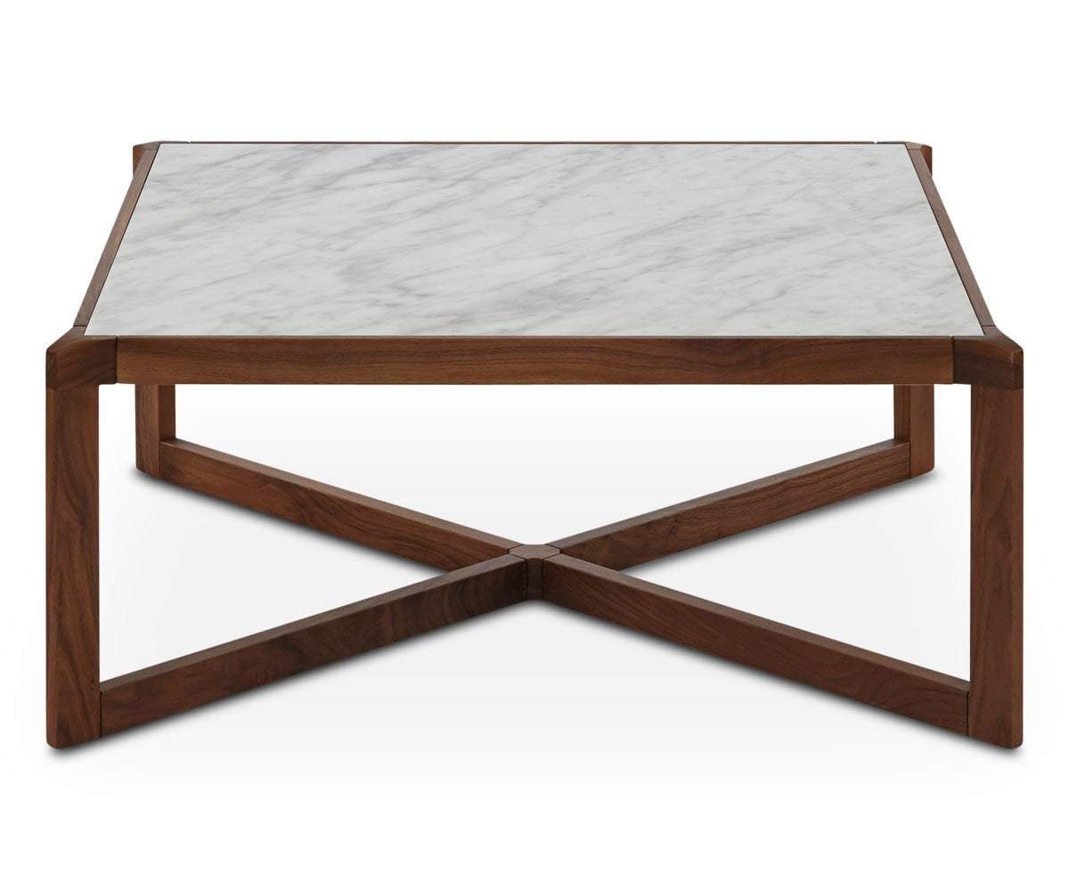 The intriguing design of the Eira coffee table makes it more than an accent piece. Crafted of solid walnut with an embedded white marble top, it is both durable and eye-catching. Allow this table to anchor your living room collection and admire it from every angle.