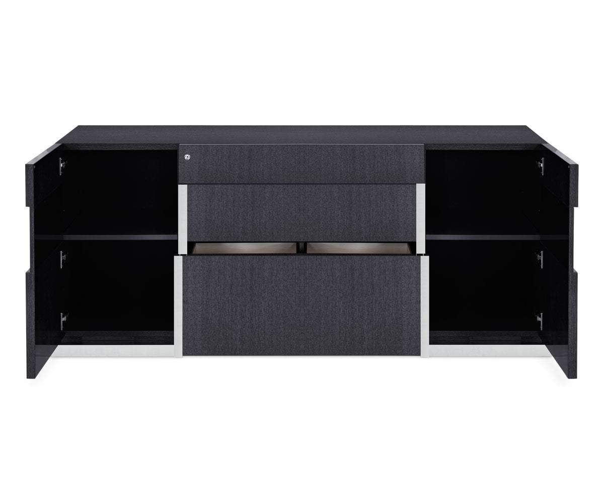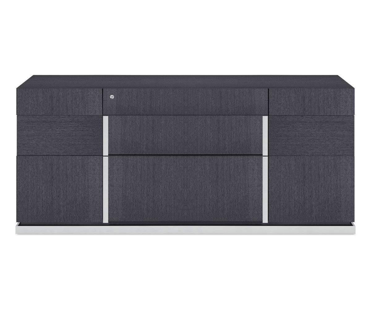 Crafted with roomy cabinets and drawers, the Mondiana credenza is a storage piece and a work of art. Chrome accents and a high-gloss koto veneer finish give this credenza a chic, modern aesthetic. Two large file drawers accommodate letter and legal size files. Two large cabinets provide extra space.