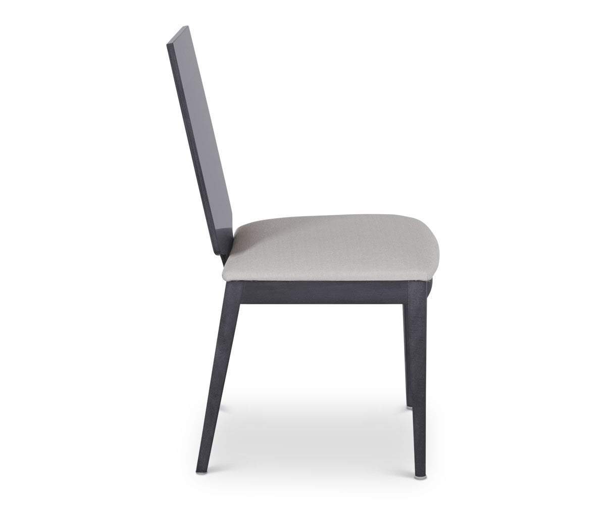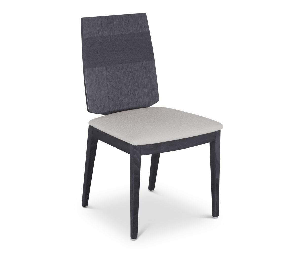 Making a bold statement, the Mondiana wood back dining chair features a comfortable padded fabric seat that provides a striking contrast to the gray koto veneer frame in a high gloss finish.