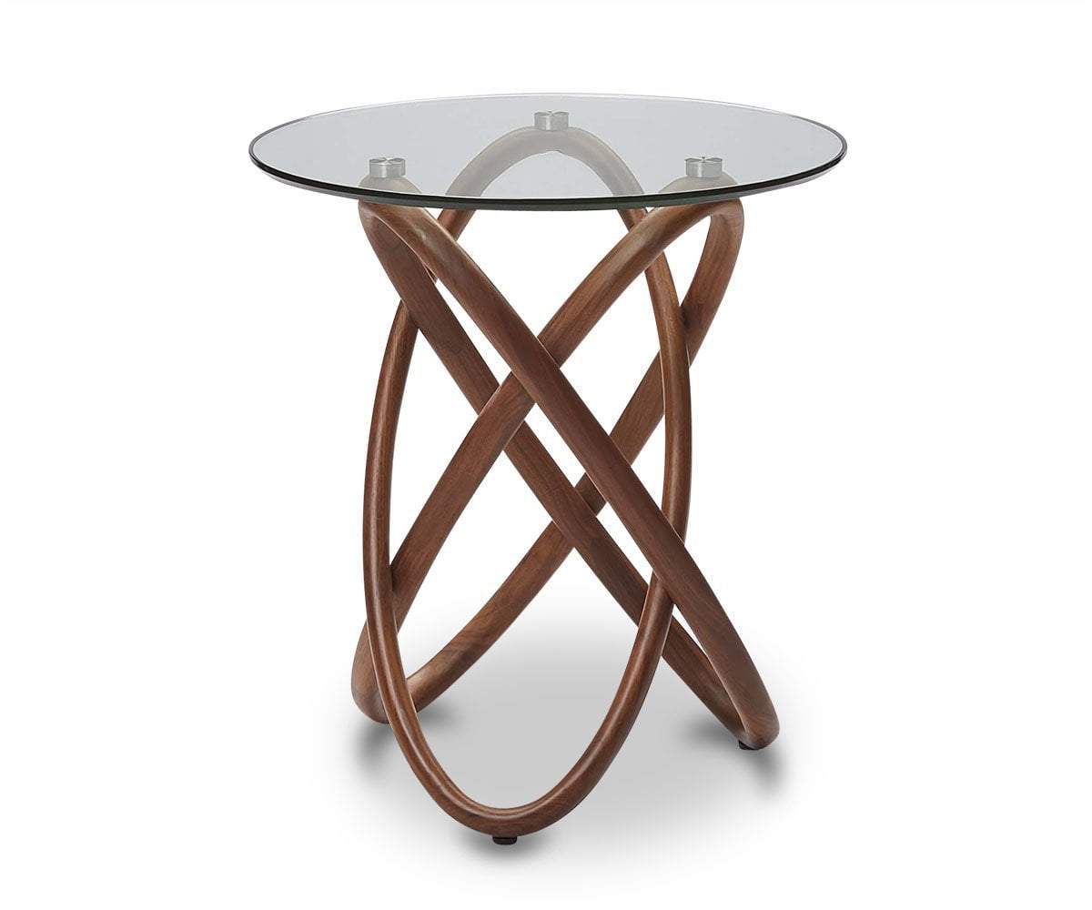 Like a refined work of art, the Oleander end table presents a striking balance of elements sure to draw the attention of anyone who enters the room. The round tempered glass top reveals a series of ovals in solid American walnut that form the eye-catching base.
