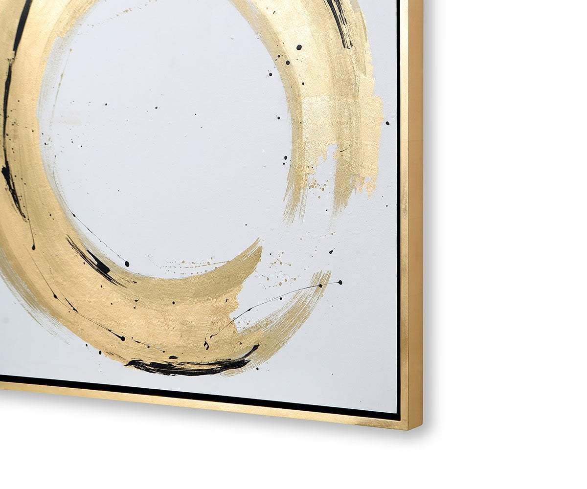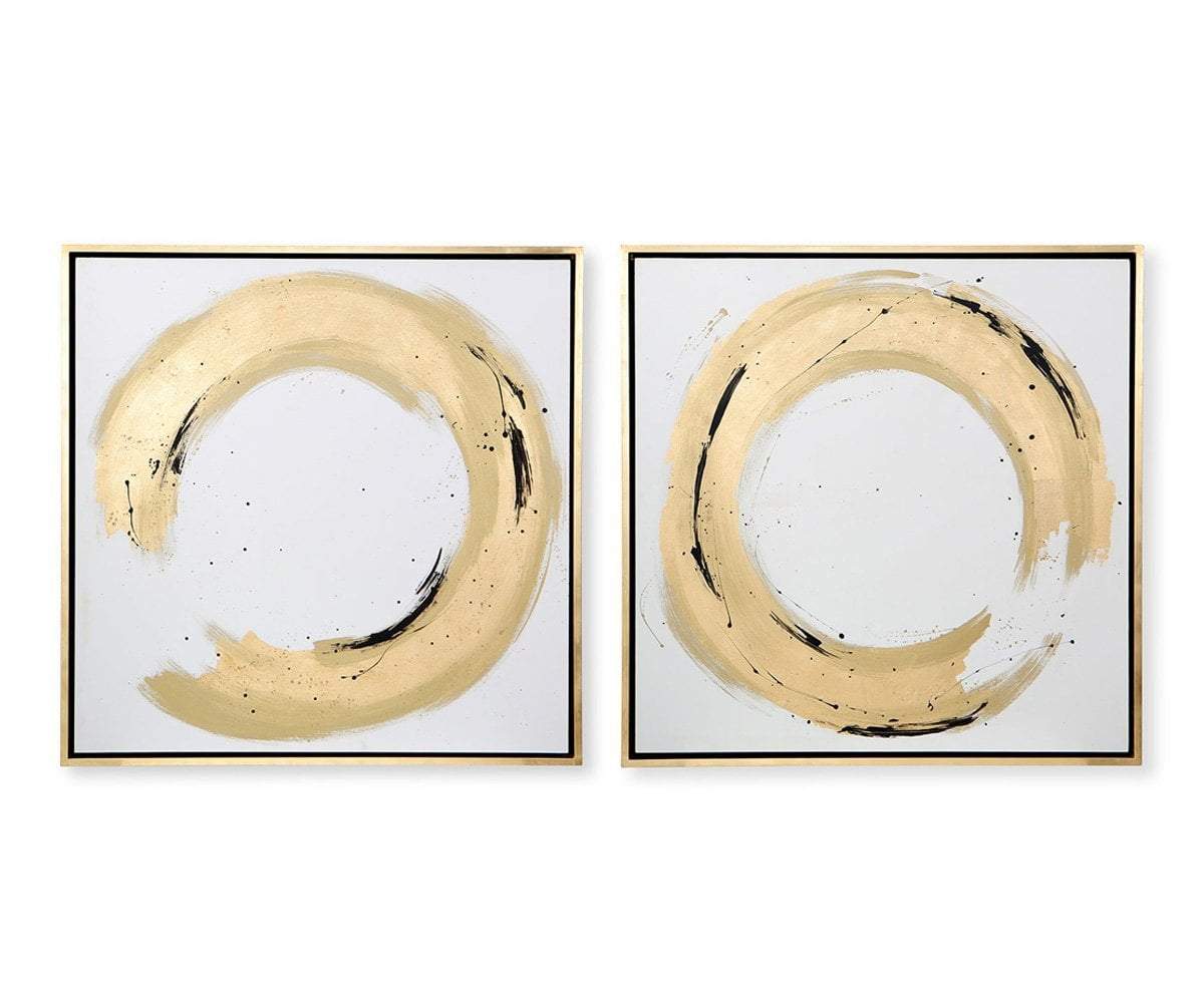 The Open Duo wall art is a set of two that perfectly complement each other when hung side by side or stand alone wonderfully when placed on different walls or in different rooms. Awash in gold leaf paint, the open circles create the perfect contrast between the linear frame. Touches of black allow the design to pop.