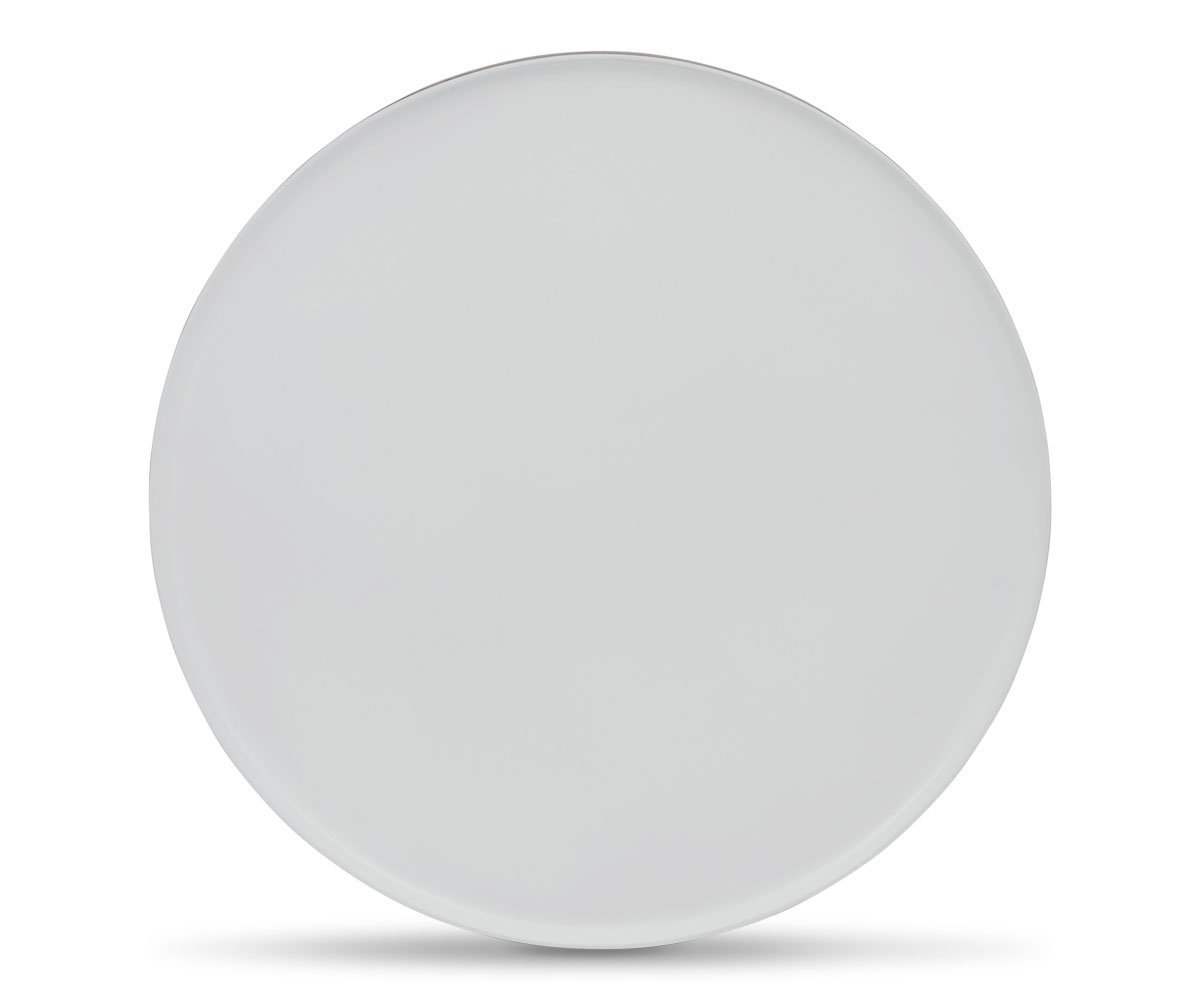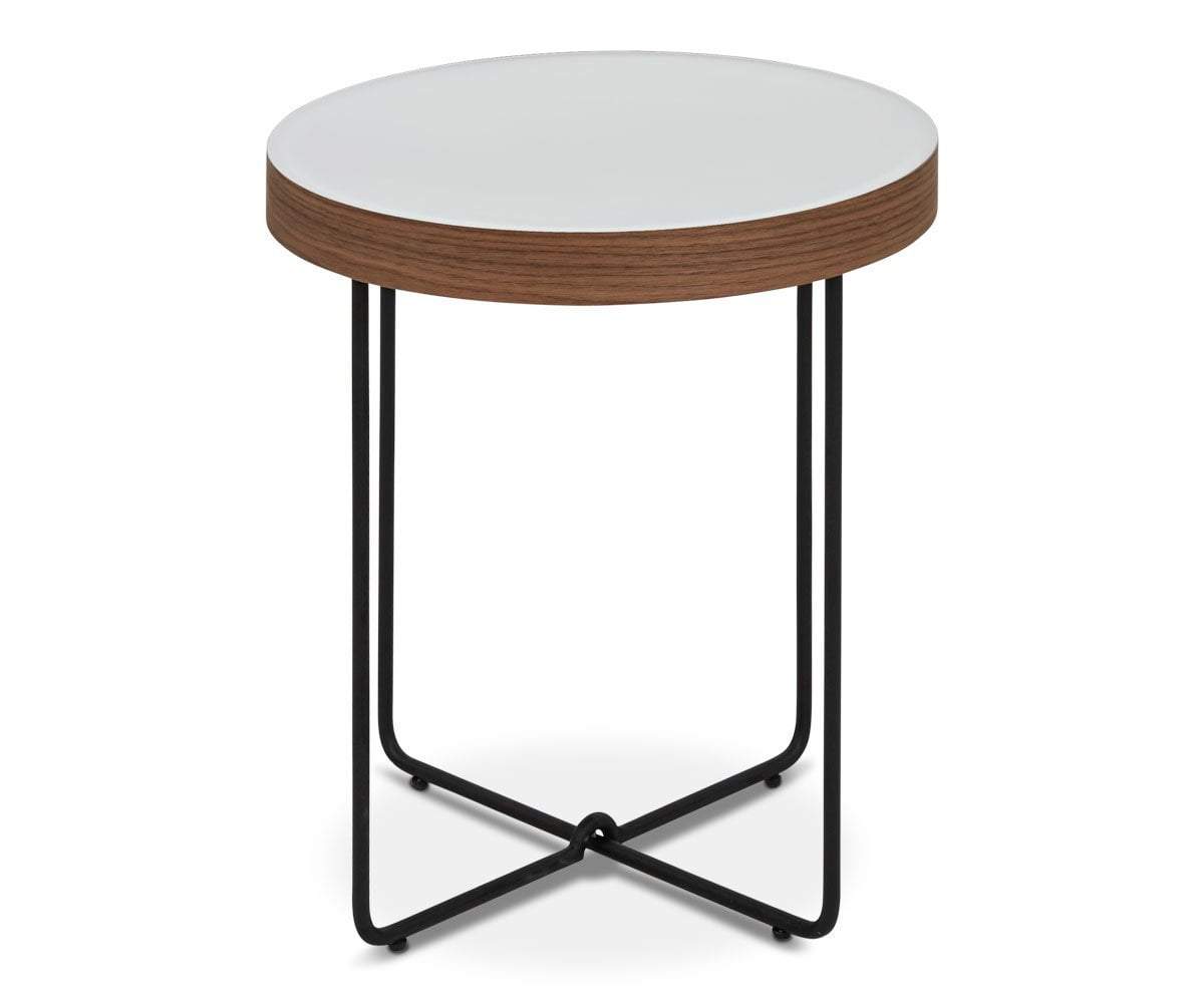 The versatile Pavlo end table displays classic modern design with a band of walnut veneer surrounding the solid color, round tabletop. A striking presentation, A simple frame featuring a matte black iron finish grounds this versatile and striking accent table.