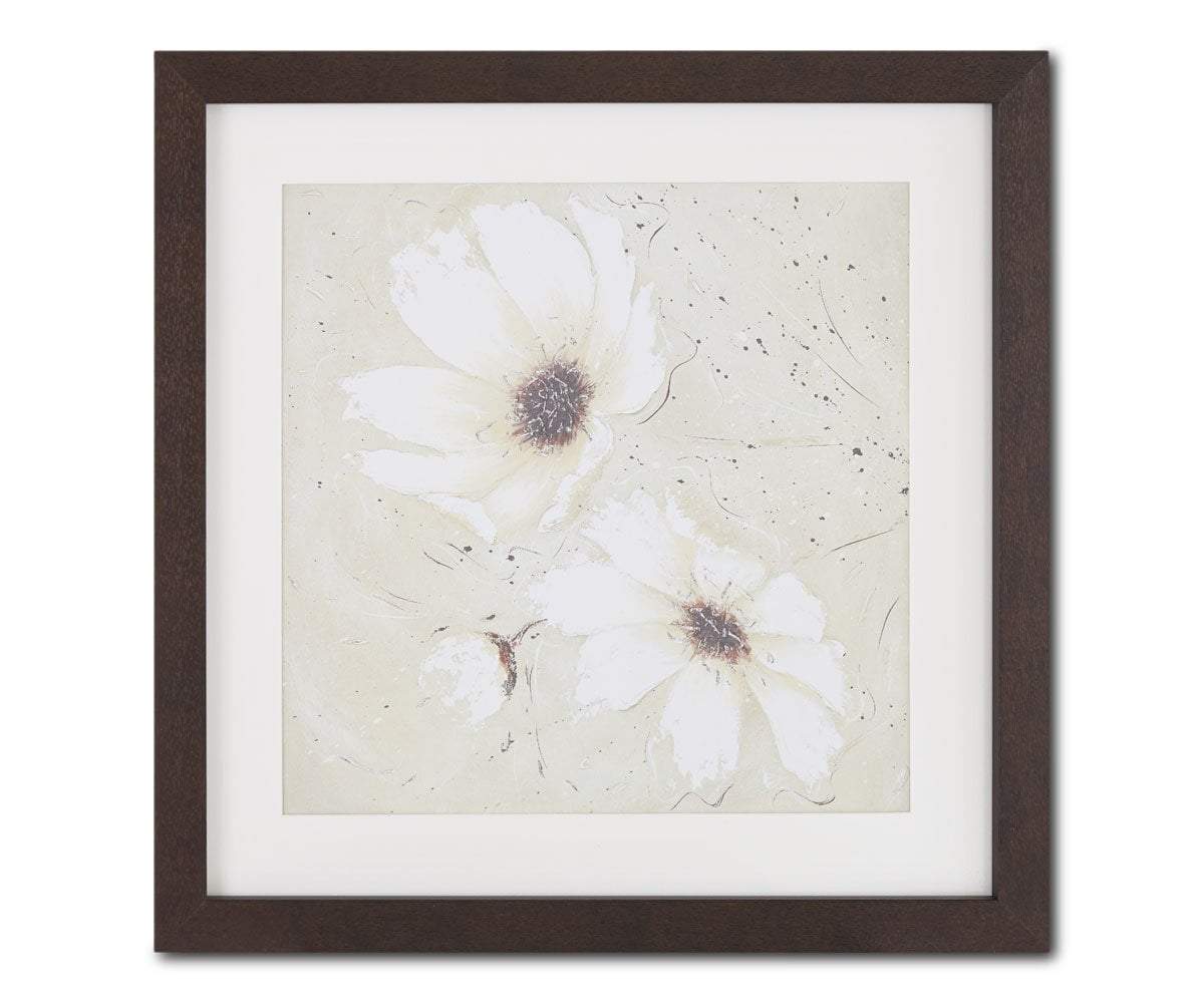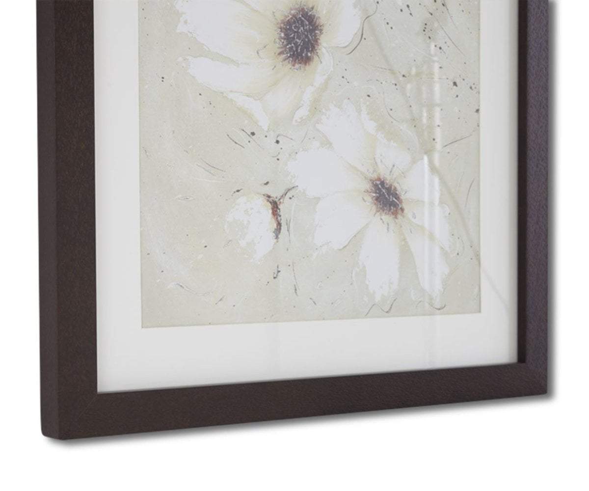 Feel uplifted as you gaze at the Peaceful Botanical I wall art and imagine the blossoms waving slightly in the breeze. The light-filled delicate palette of this soft floral abstract adds sweet, sophisticated style to your room with the polished look of the creamy mat and brown frame.