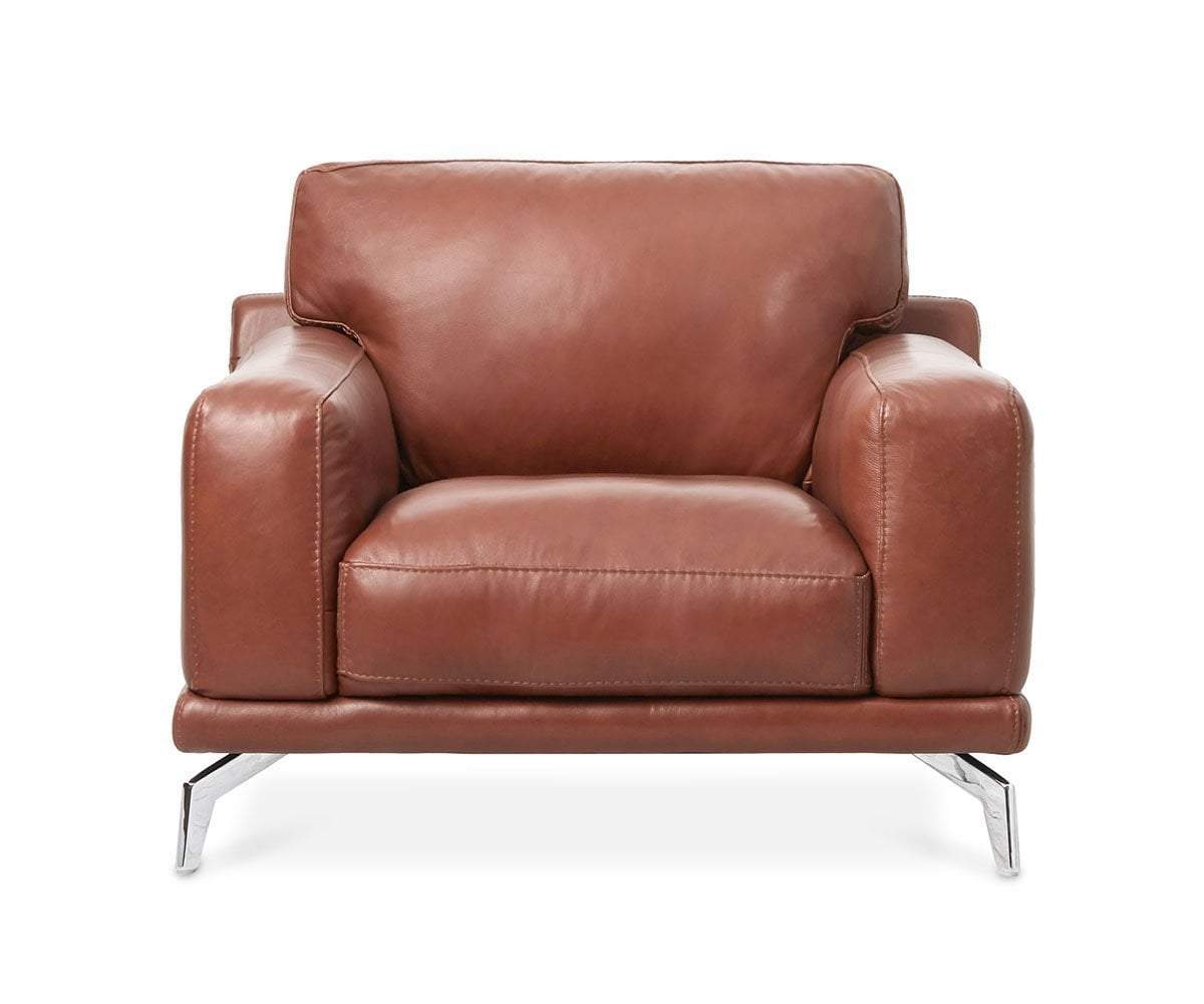 Everyone at home will be vying for the chance to claim the Peruna chair as their own go-to spot. Experience the comfort of the luxurious cognac leather that fully wraps the frame, wide track arms and overstuffed seat and back cushions. Unique, angular metal legs in a shiny, chrome finish add personality to the design and complete the look, ensuring you’ll enjoy this timeless favorite for years to come.