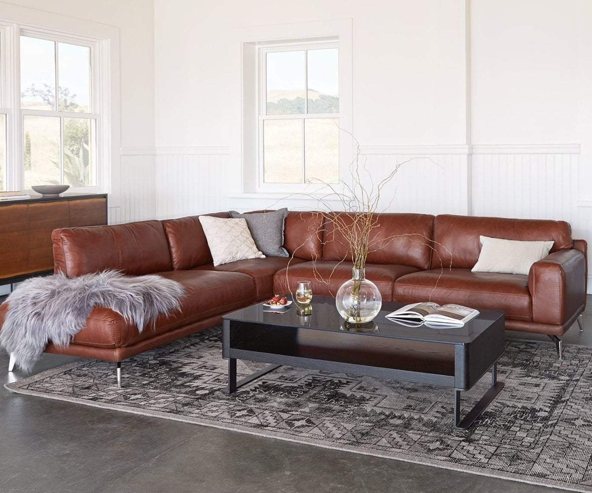 Overstuffed cushions wrapped in cognac leather, sit snugly into the low rectangular frame of the Peruna sectional. The look is punctuated with the unique, angular legs in a chrome finish, creating a stunning focal point for your living space. Give yourself room to stretch out or the ability to add a few more guests to the gathering.