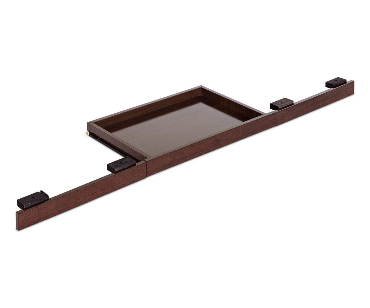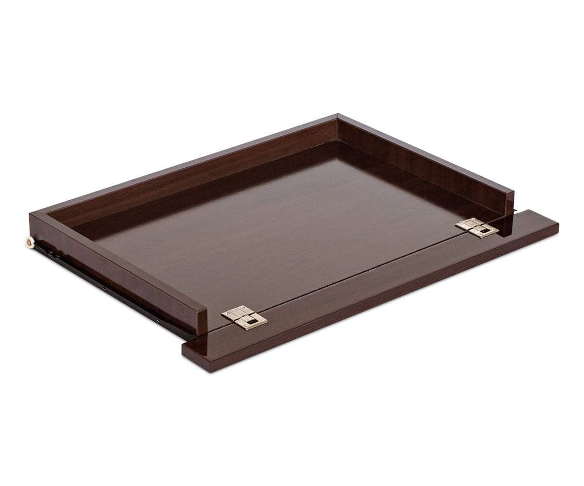 The Pisa pull-out keyboard shelf allows you to store your keyboard under your Pisa desk. Beautifully crafted with glossy walnut canaletto veneers and zebra wood inlays with a flip-down front for easy use.