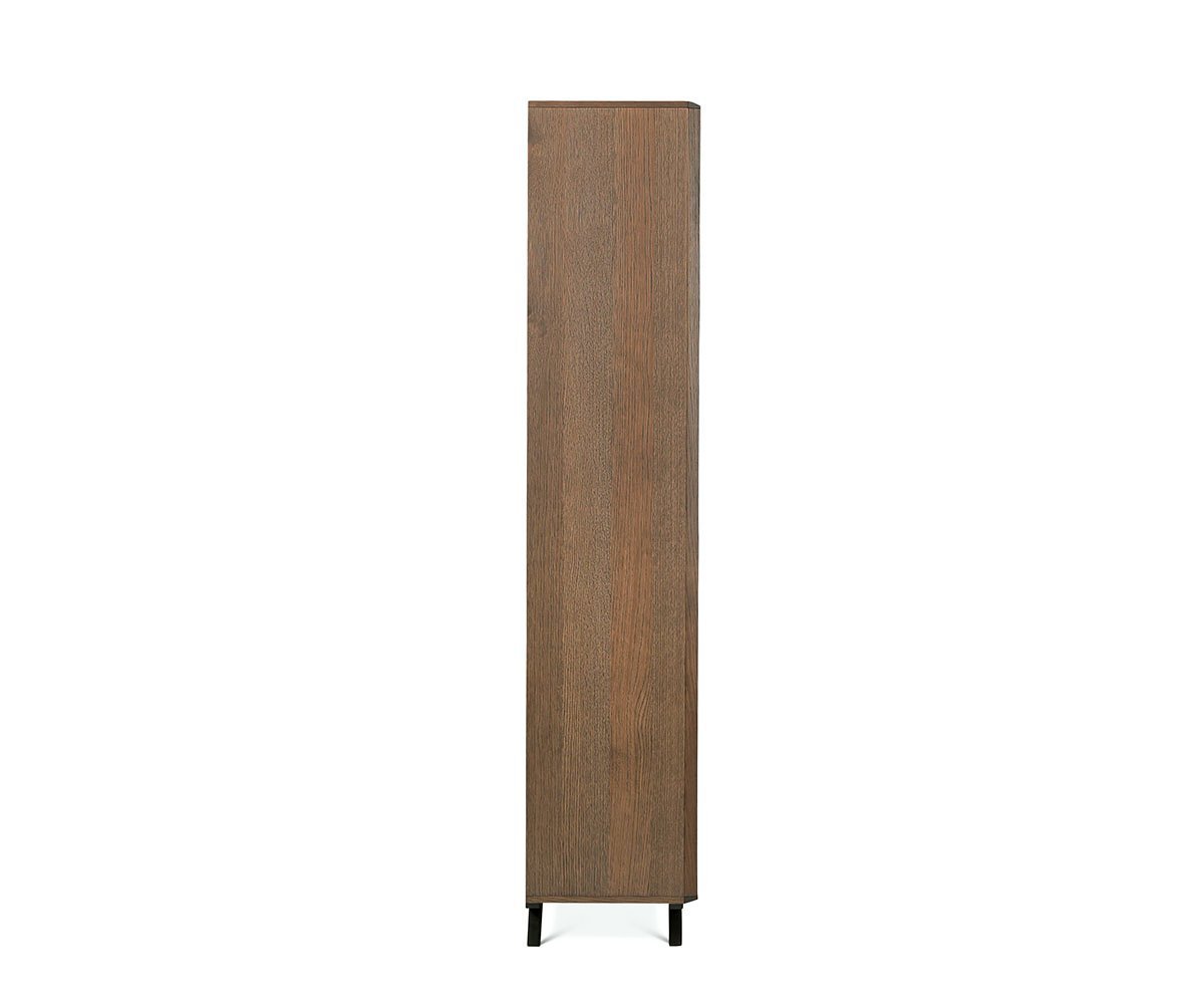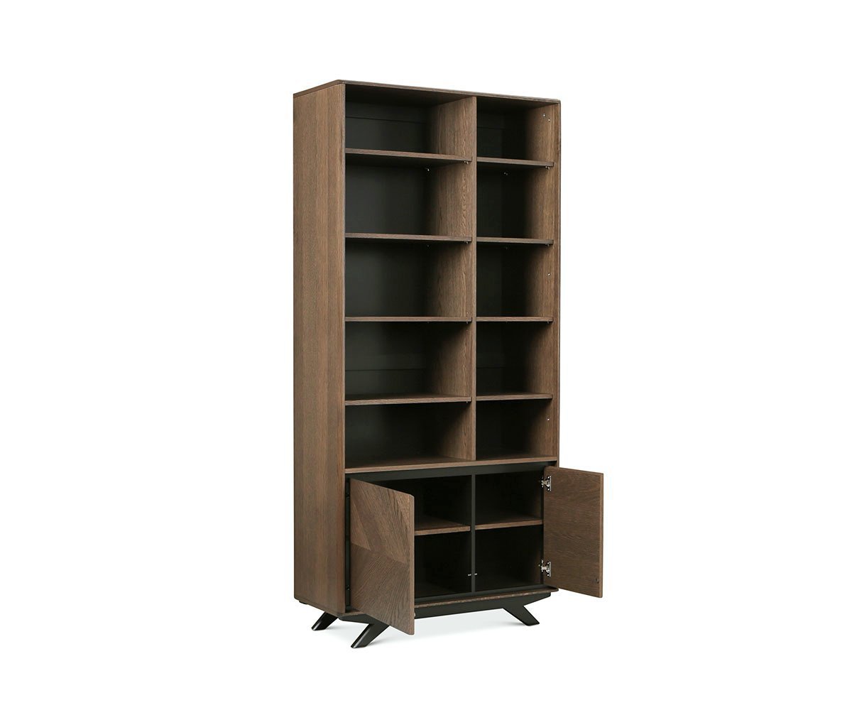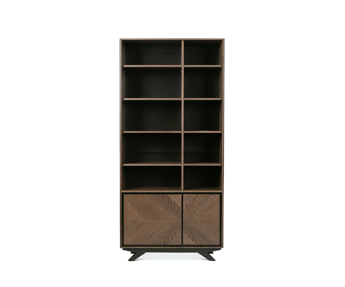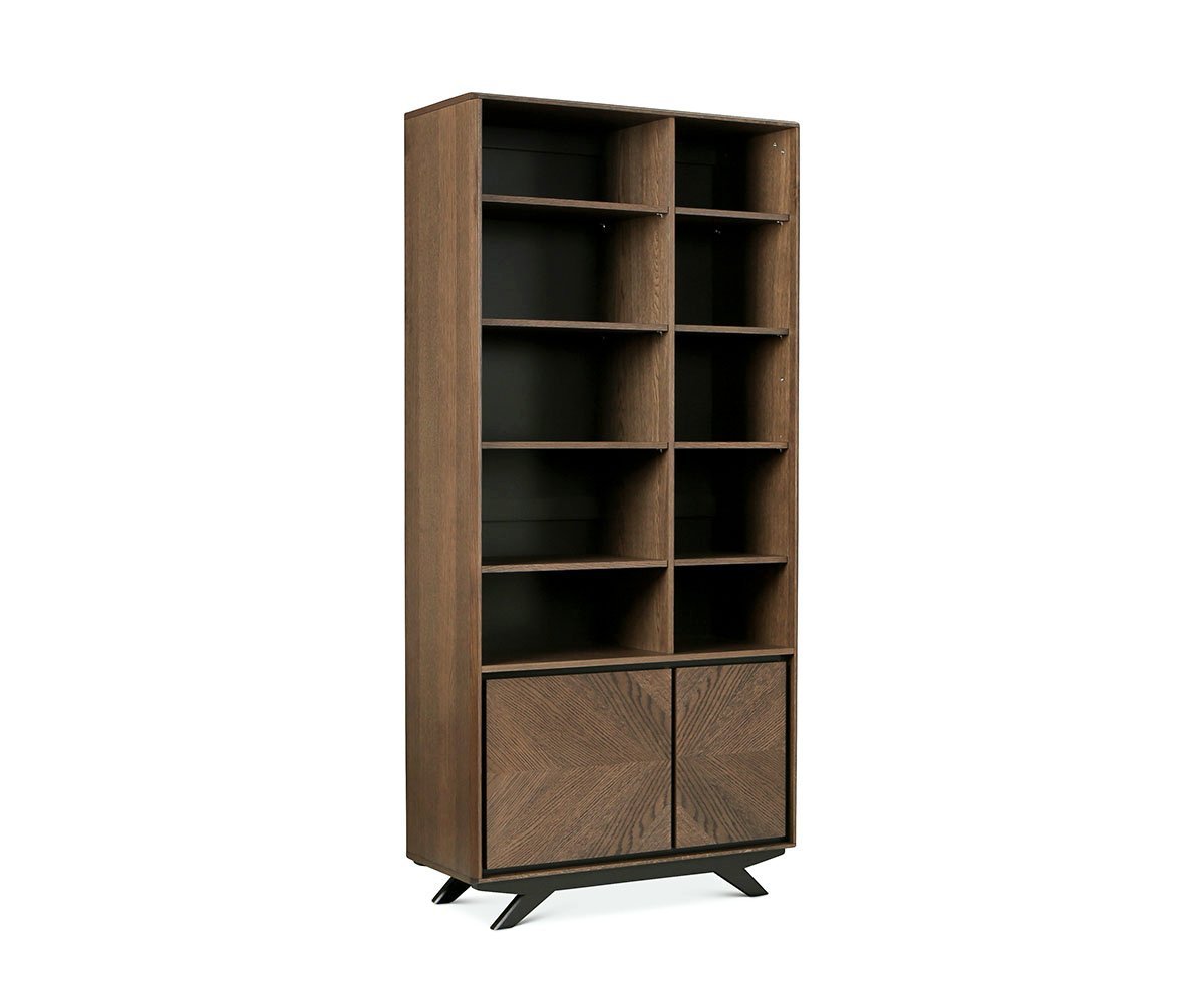 Incorporate beautiful standing storage into your room of choice with the Raynor bookcase. It features two columns of open shelves, intentionally divided asymmetrically for artistic design. The two lower doors keep selected objects protected and hidden from view, while highlighting the chevron pattern of the striking wood grain. Its mid-century modern look is completed by the solid beech base and tapered legs set at angles.