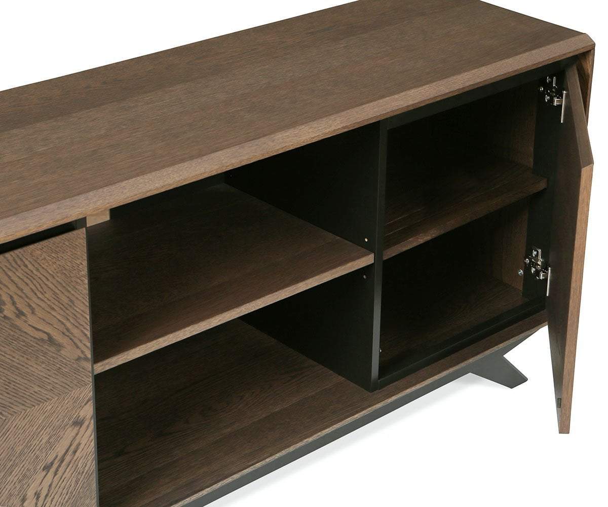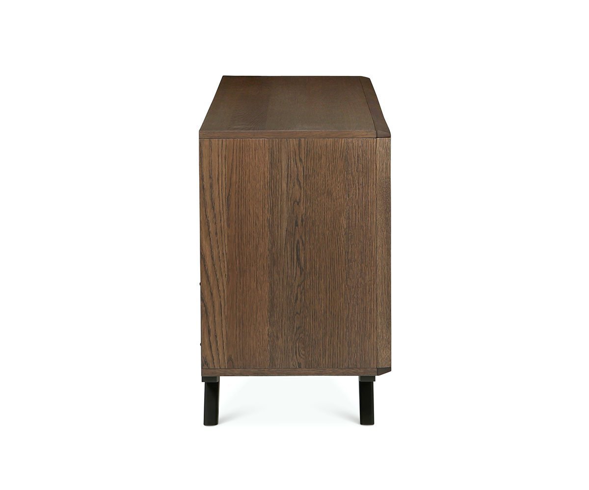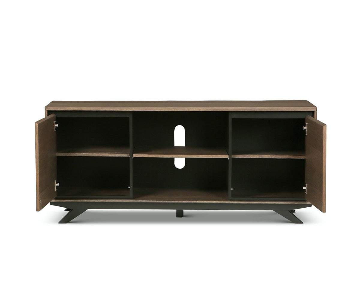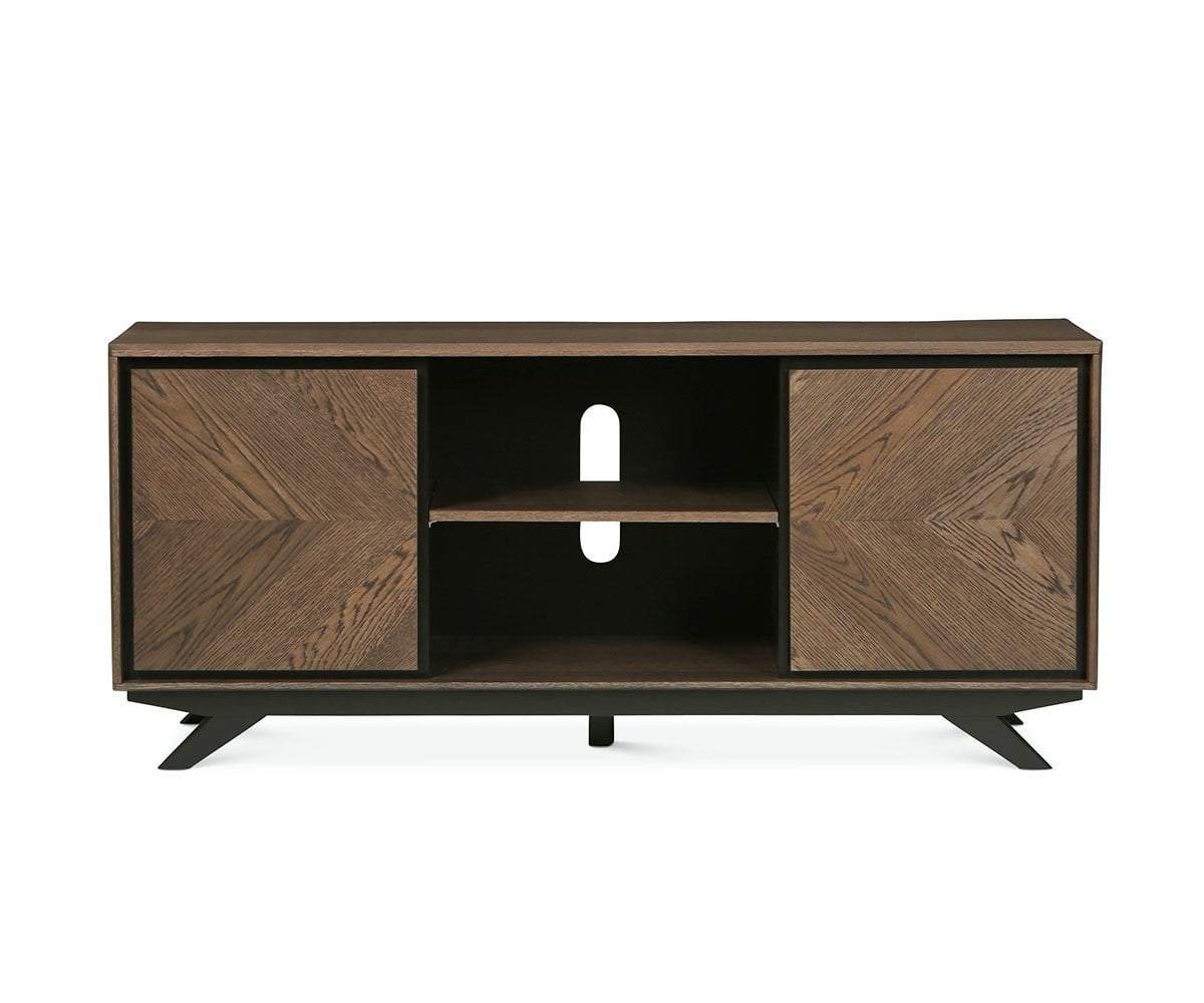 The Raynor media stand achieves beautiful design balance with angles repeated in a chevron pattern of the wood grain finish and the solid beech legs. This mid-century modern storage solution boasts two large open shelves with conveniently located cutouts in the back for cable management. Two doors open to reveal more shelving on the right and left side for items you would like to remain out of sight. Whether you have multiples pieces of media equipment, games, remote controls or even CDs, records and books, the Raynor media stand is built to accommodate in style.