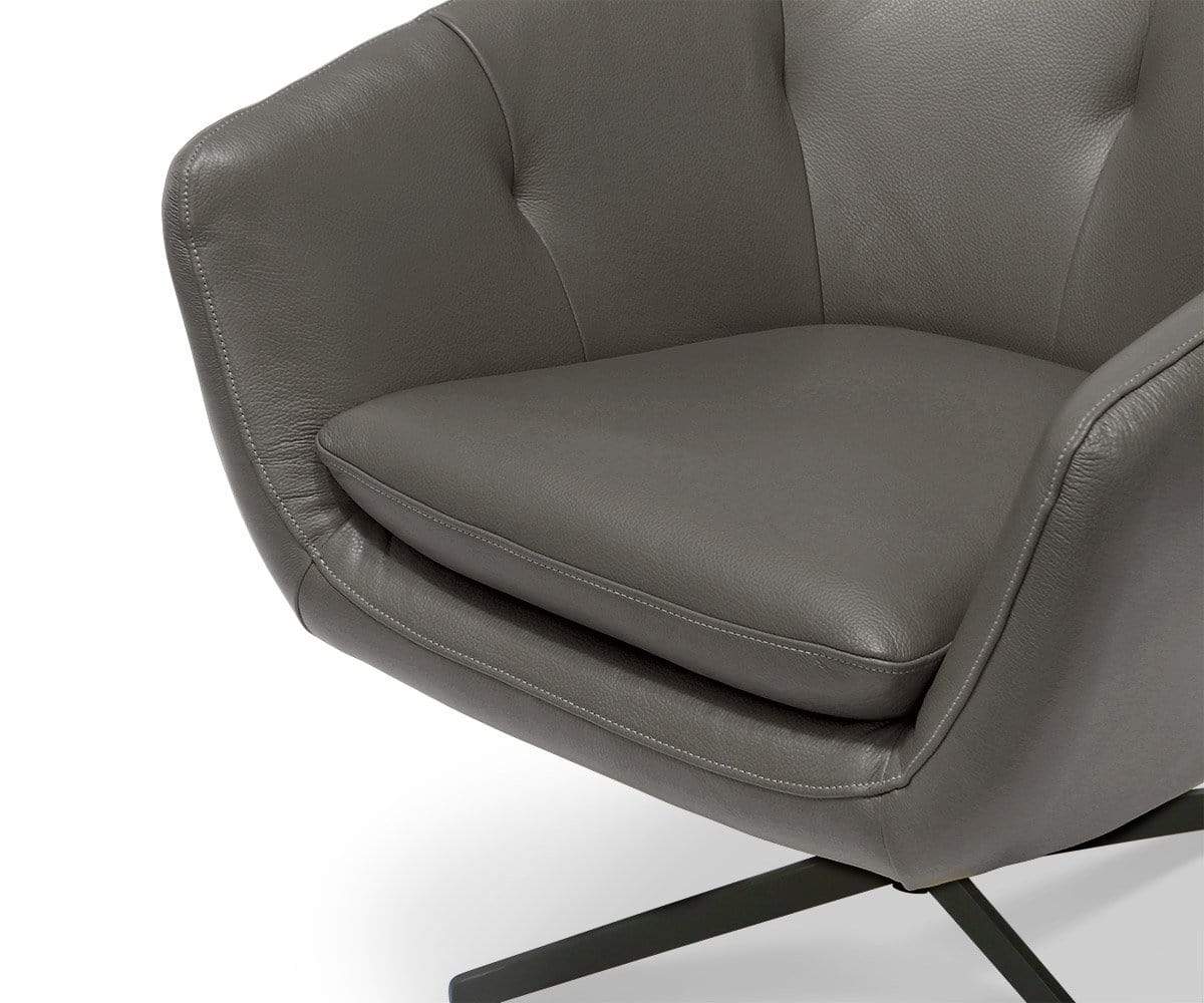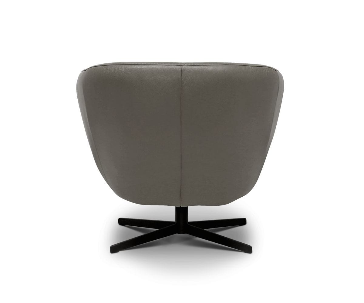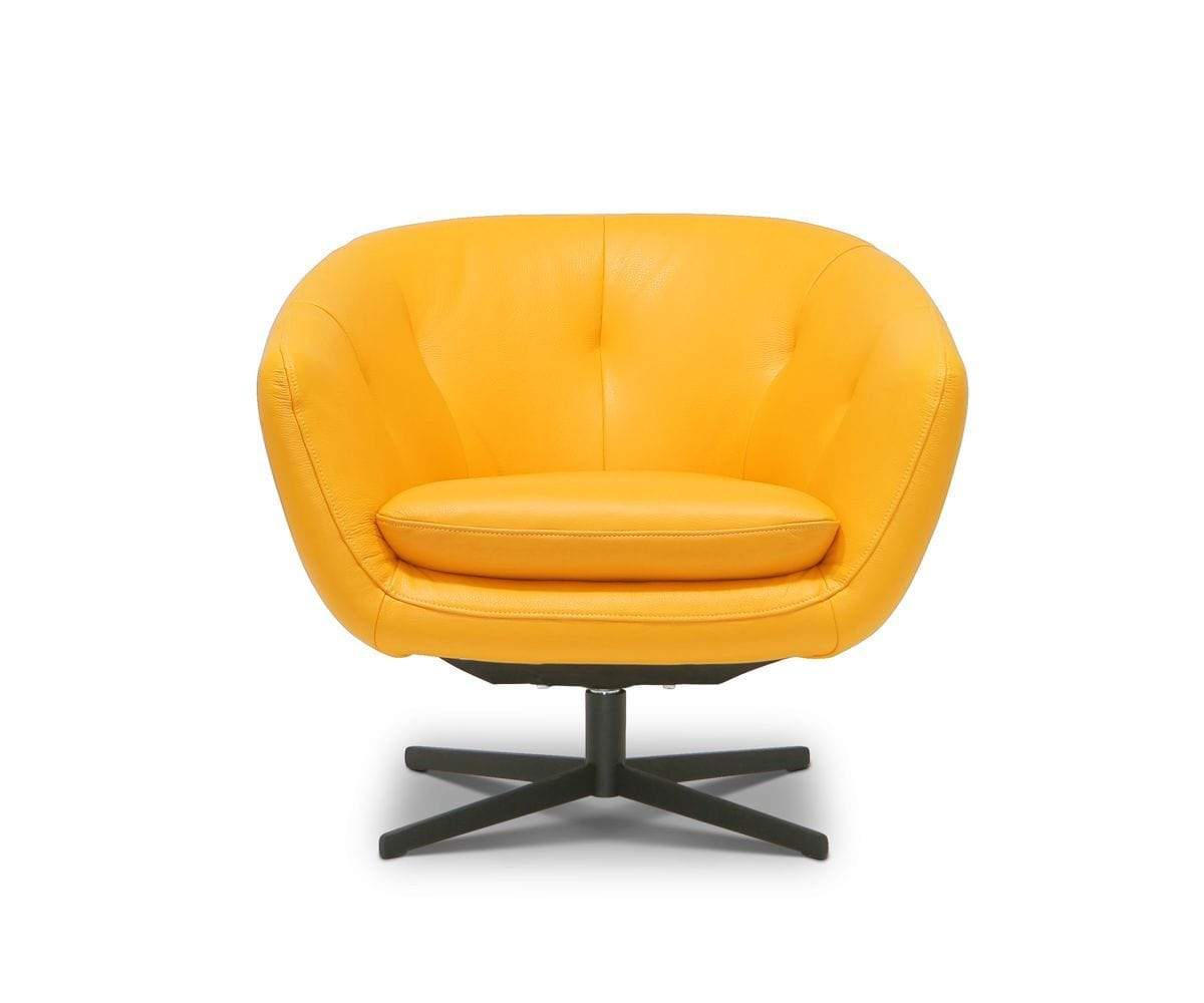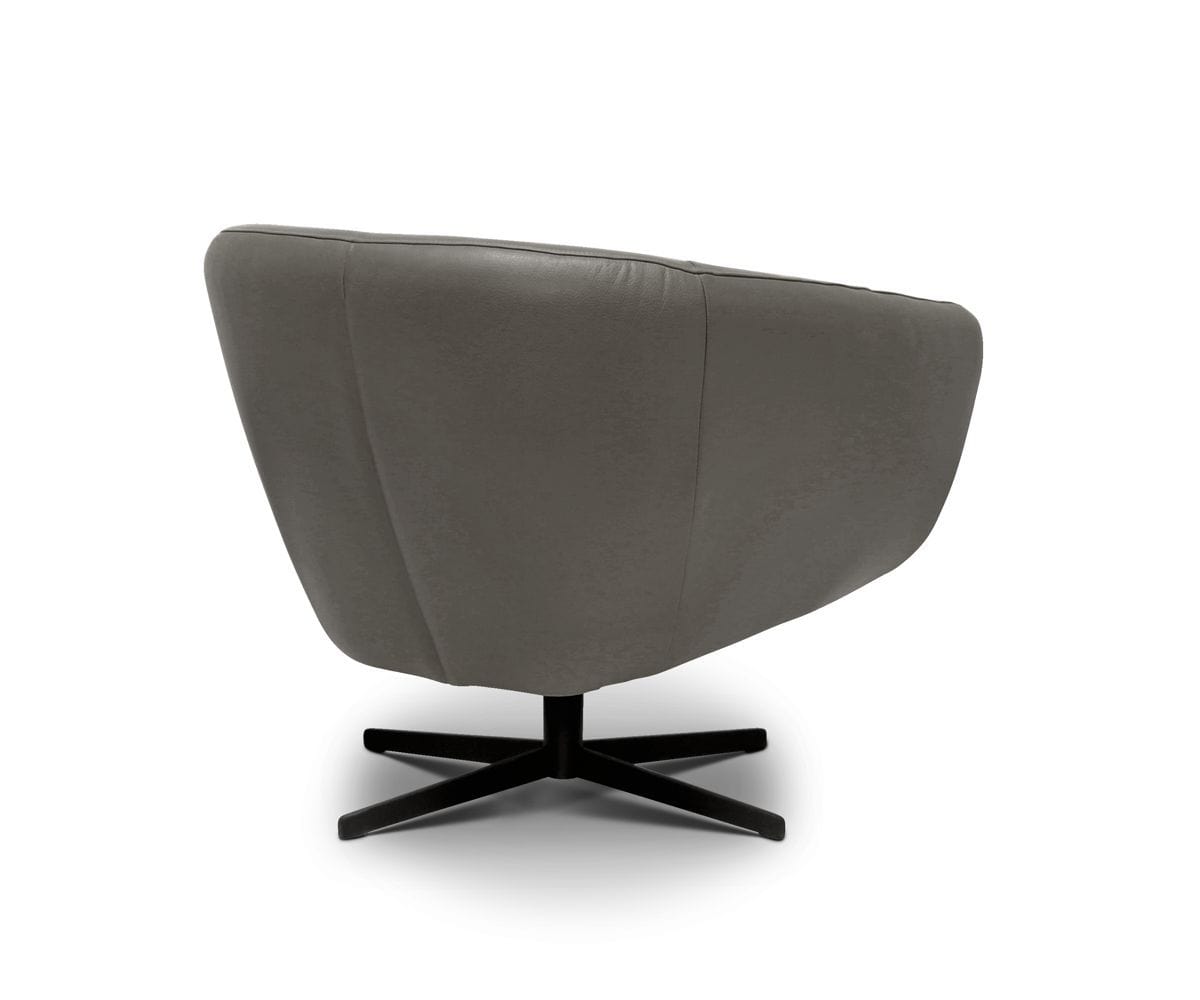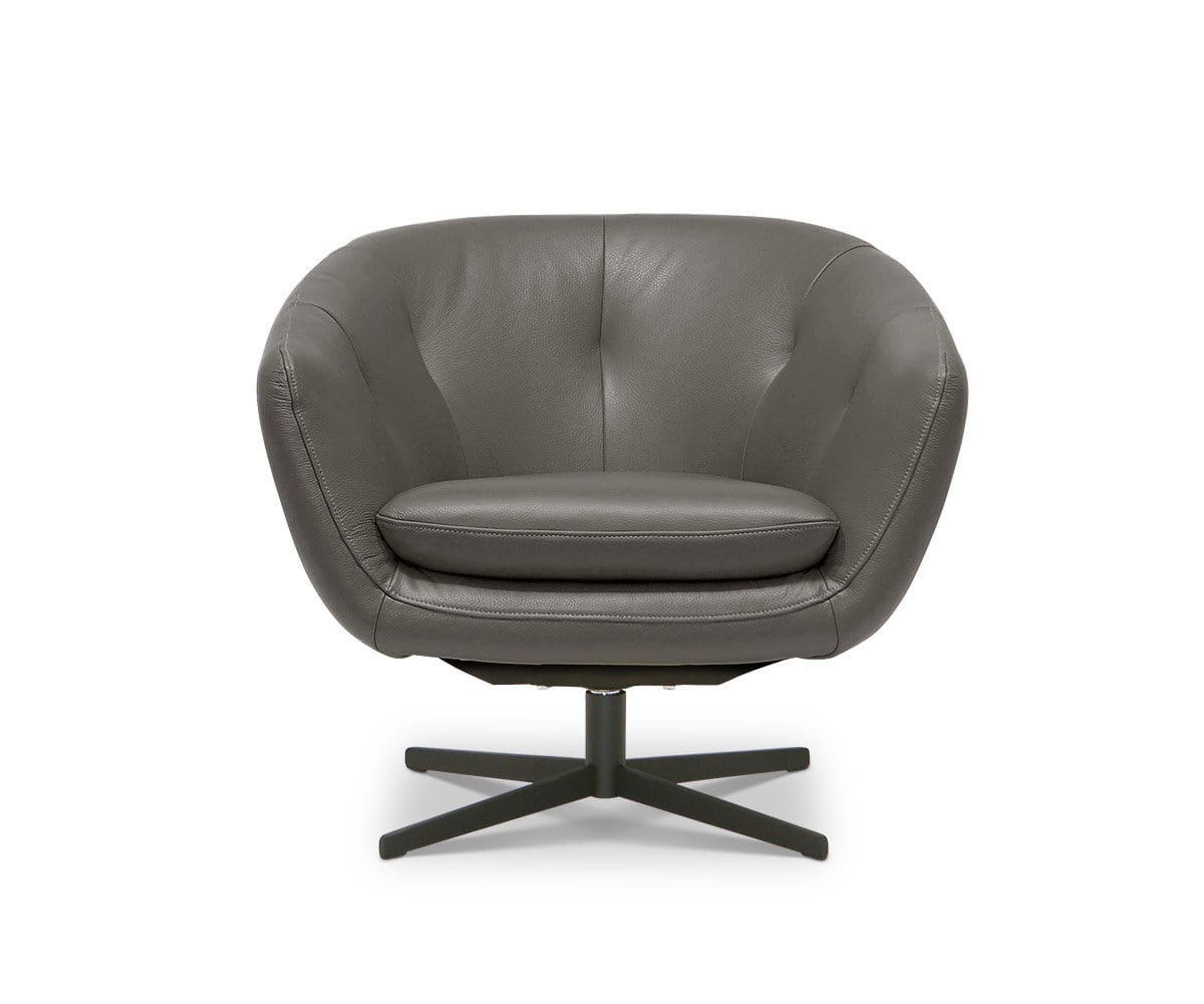 The Rory swivel chair has the modern lounge feel on lock. This barrel-style chair offers sublime comfort with a wraparound design. Plush cushioning surrounds the durable swiveling frame. Tufted leather upholstery gives a luxe look.