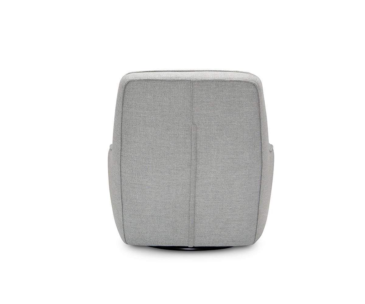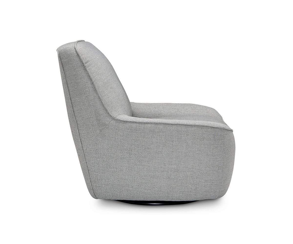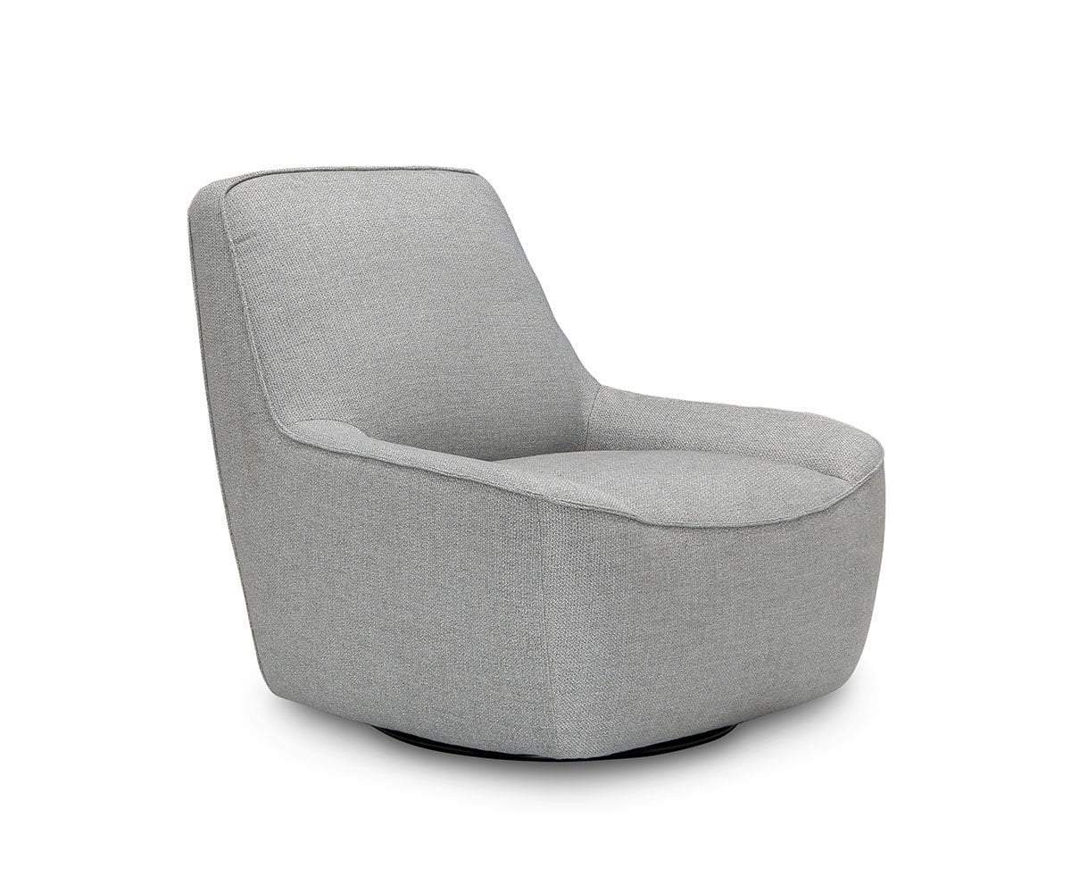 Cool contemporary style meets incredible comfort in the Rost swivel chair. The supportive back flows to the low, wide arms and cushioned seat. Plush upholstery displays a woven pattern outlined with piping detail that together, gives texture and dimension to this piece, which further adds to the visual appeal. The hidden metal swivel base provides stability plus the ability to turn 360 degrees and not miss a moment of the conversation or entertainment going on in your living space. This unique seat welcomes you to relax and is sure to become your favorite go-to spot.