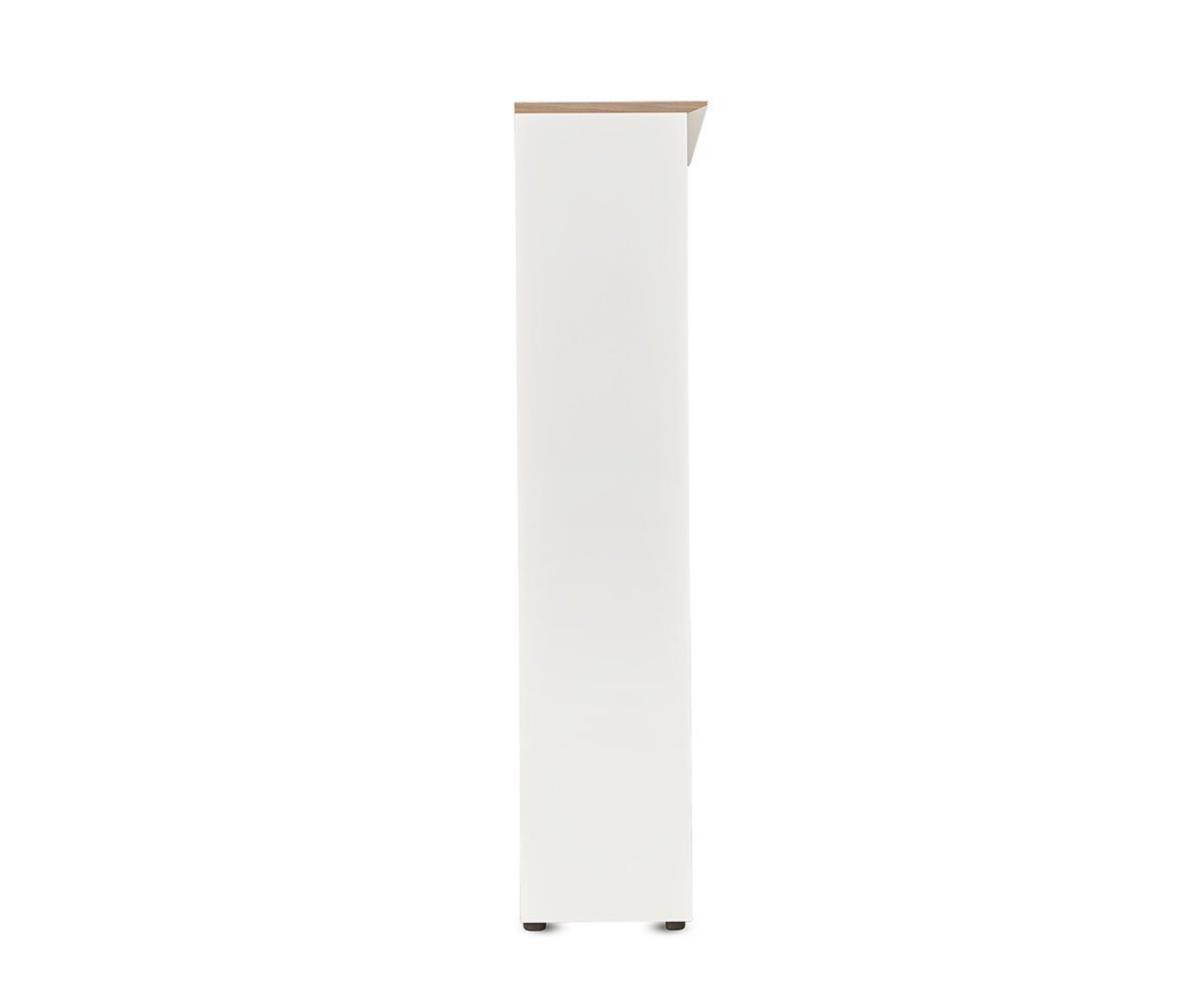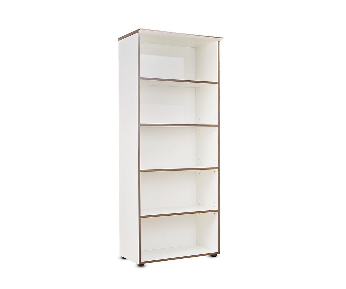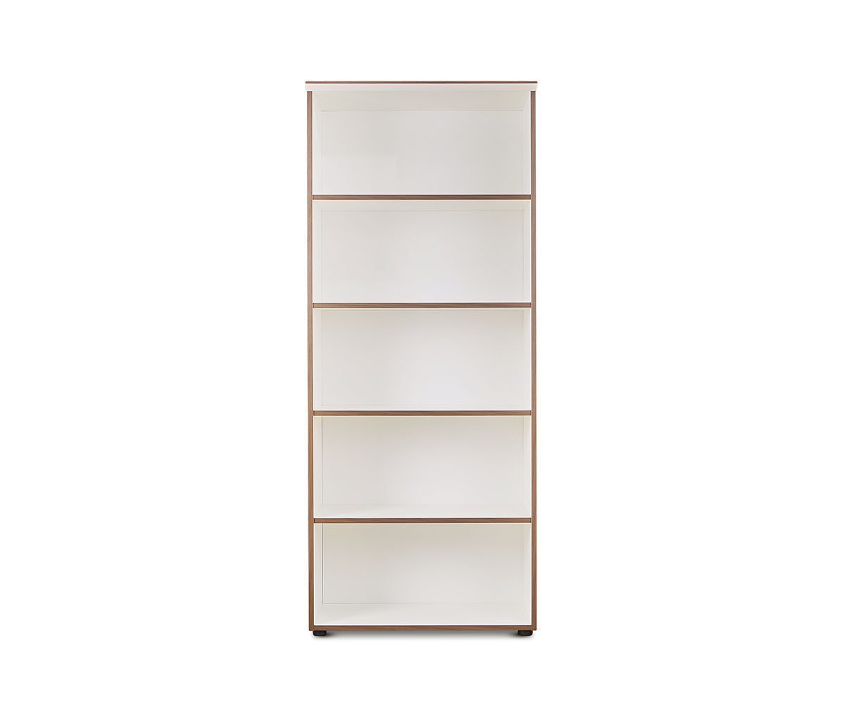 The Sparsa bookcase provides plentiful, flexible storage for any setting. Standing tall at 76” with four adjustable shelves and the option of five display areas, this piece is built to work for you. Its simple lines and light finish with walnut melamine details suit many styles of decor.