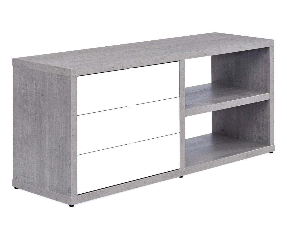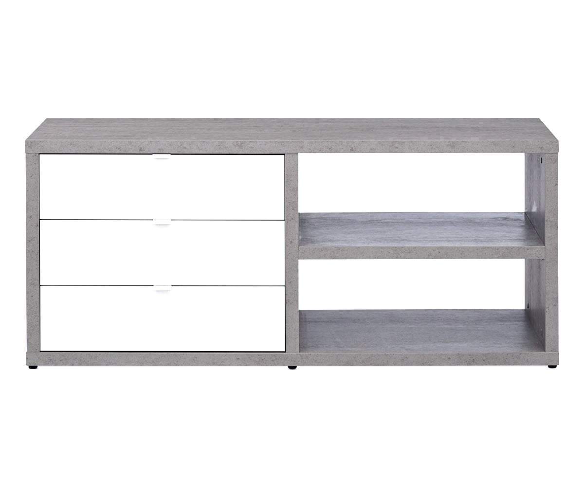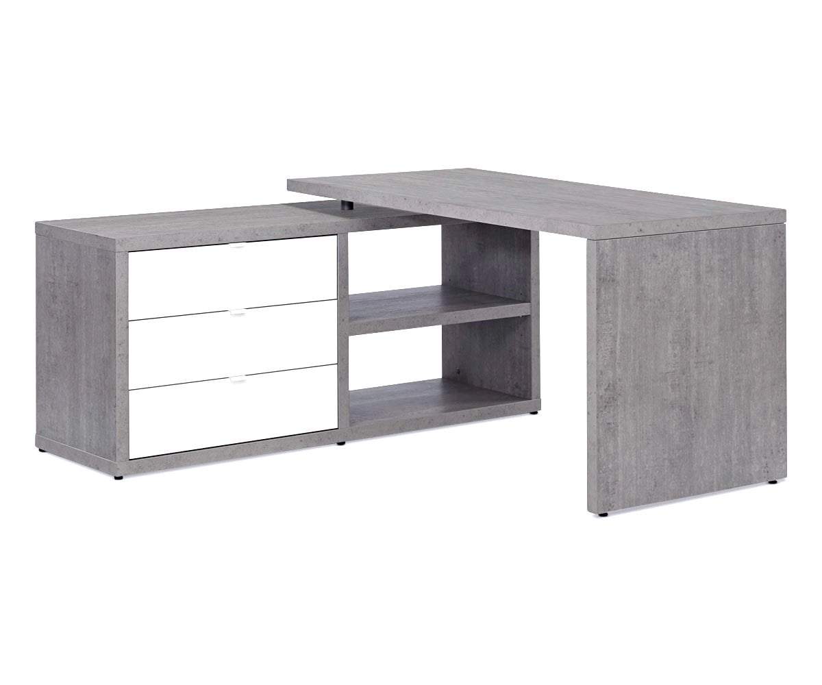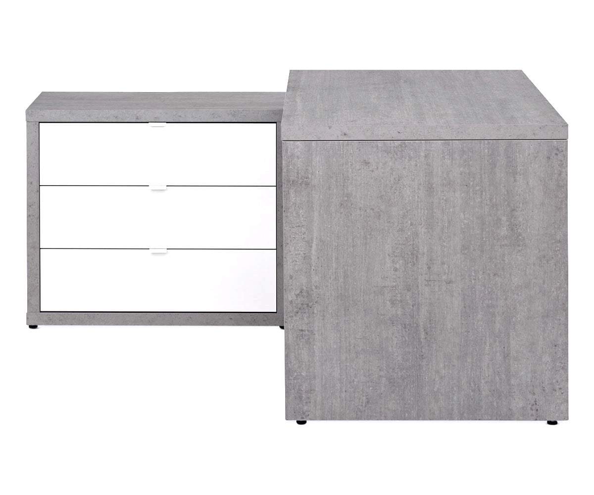 Anchor your workspace with the stylish and completely functional Sten 60” desk with storage return. Your main surface is formed by the straight, clean lines that lead to the prominent return with two open shelves and three deep drawers. The L-shape allows this piece to fit nicely into a corner or stand handsomely and strong in the open area of your room. Crafted in Italy of cement-look melamine and complemented by the high gloss white drawer fronts, this desk system brings a cool, modern industrial vibe to your office space.