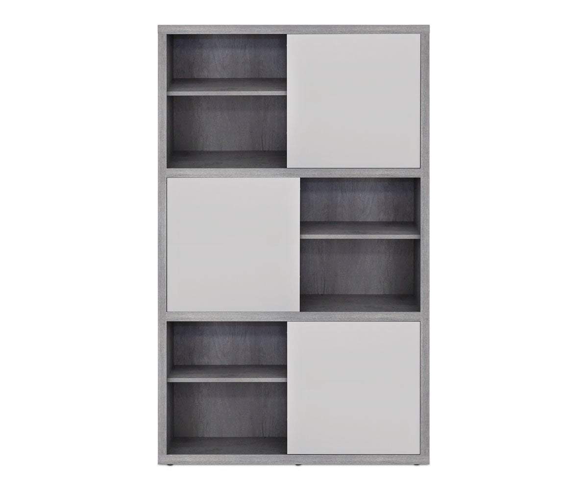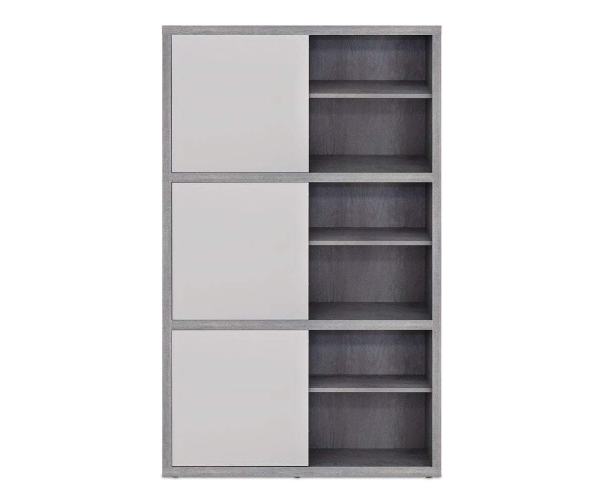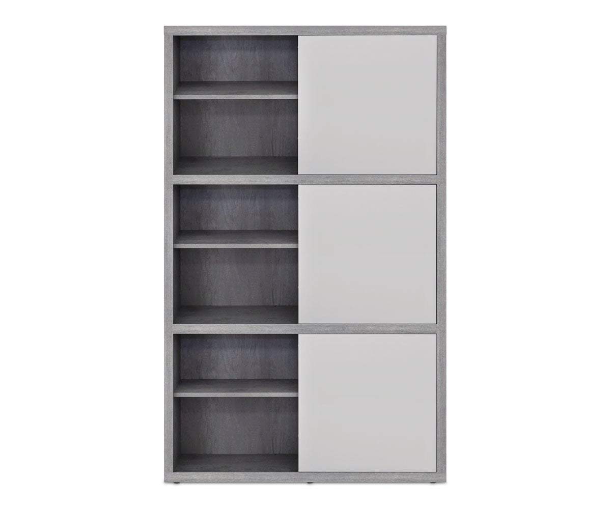 Go big, cool and modern with the Sten bookcase. The cement-look melamine body is complemented by three doors in a high gloss white finish, making it is a striking office companion. Multiple shelves allow loads of storage space as you stow items out-of-site, or slide the unique doors to reveal the contents behind.