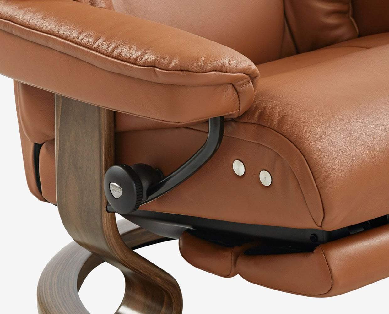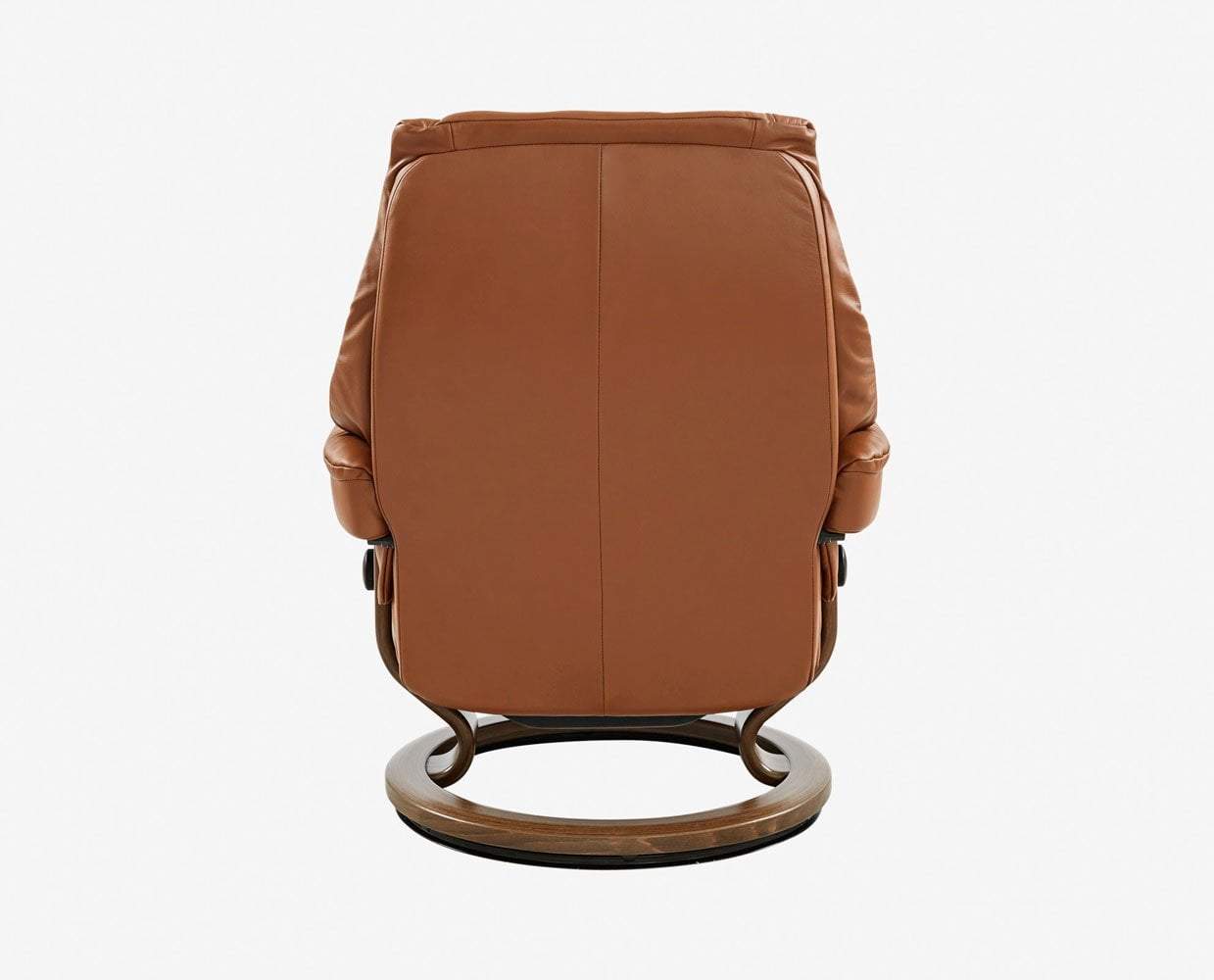 The Live Stressless® recliner allows you to customize your comfort level from head to toe without taking up a large footprint in your room. Upholstered in leather with a solid birch base, it features a tilting headrest and unique electric integrated footrest that unfolds and extends at the touch of a button.
