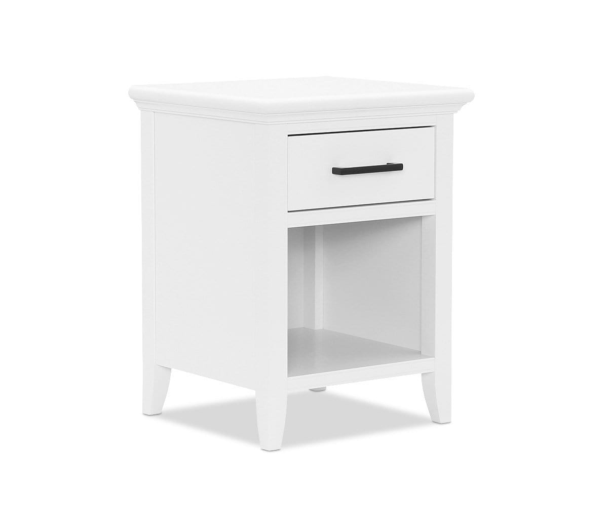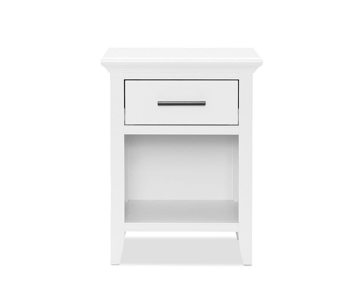 The Summer nightstand makes a stylish and versatile accompaniment in any bedroom. Elegantly crafted and finished in semi-matte white, this piece features a single drawer with a black powder-coated cup pull and a large open cubby for storage.