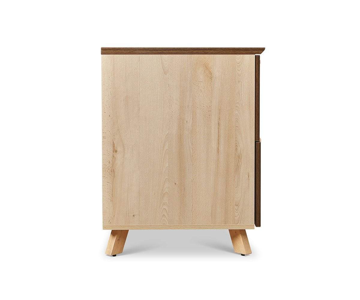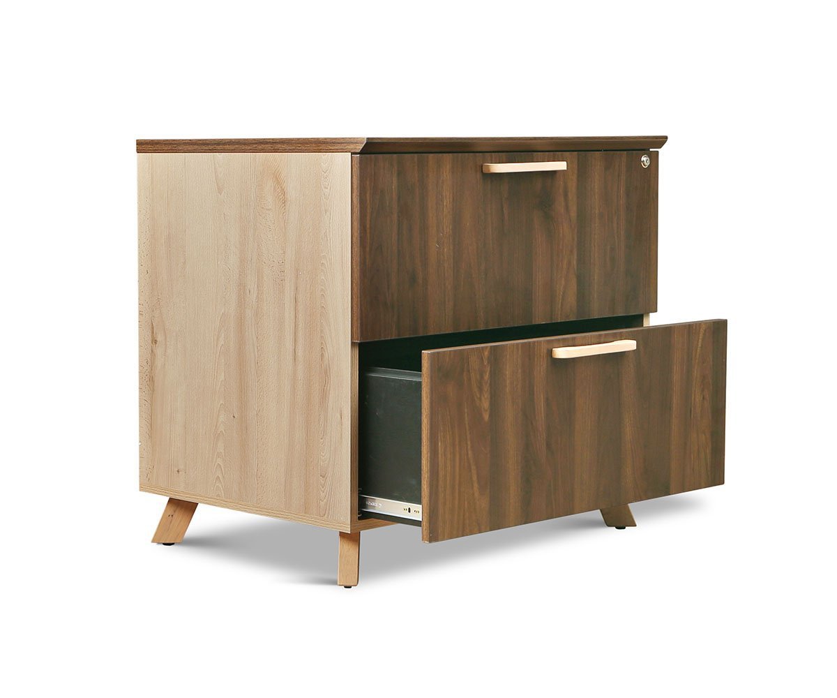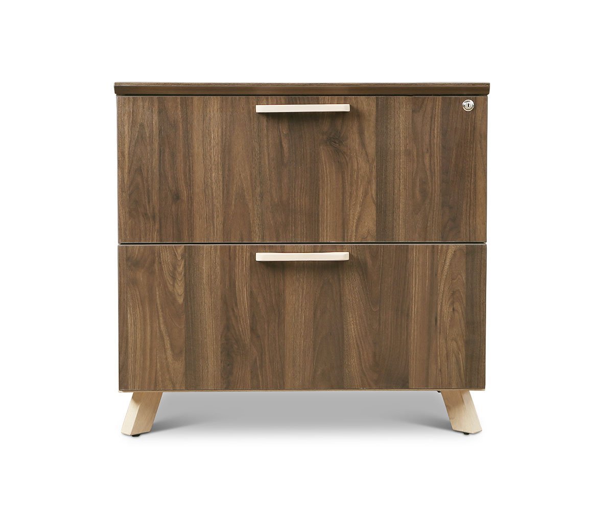 The two-tone color palette of the Thorsten file pedestal adds visual interest to the clean, simple lines of its versatile design. This storage solution features two drawers and legs set at angles, giving it mid-century modern style. The light wood finish on the cabinet base, handles and legs contrasts beautifully with the walnut wood grain pattern of the top and drawer fronts. Improve organization at the office with this piece that includes a top locking drawer.