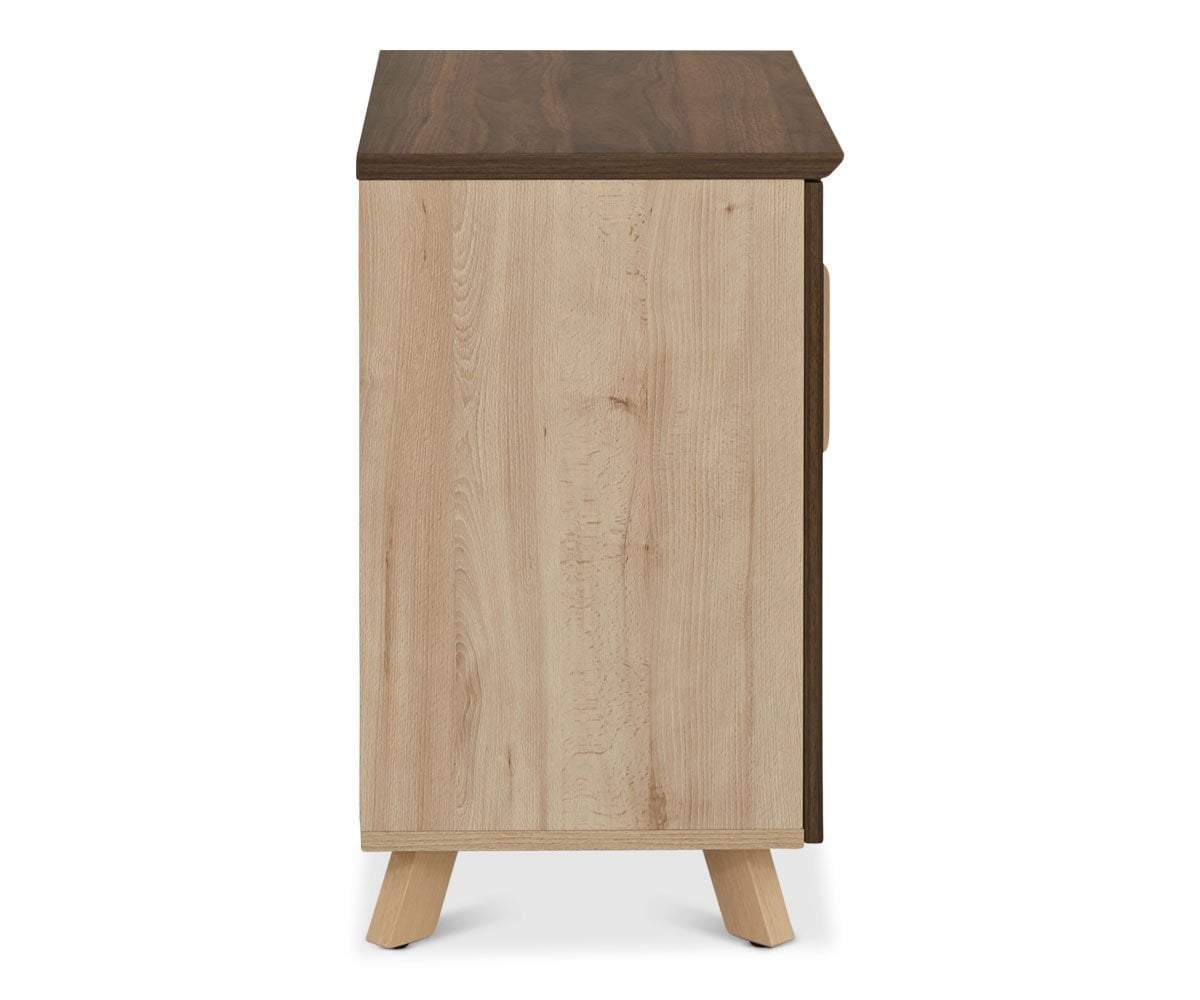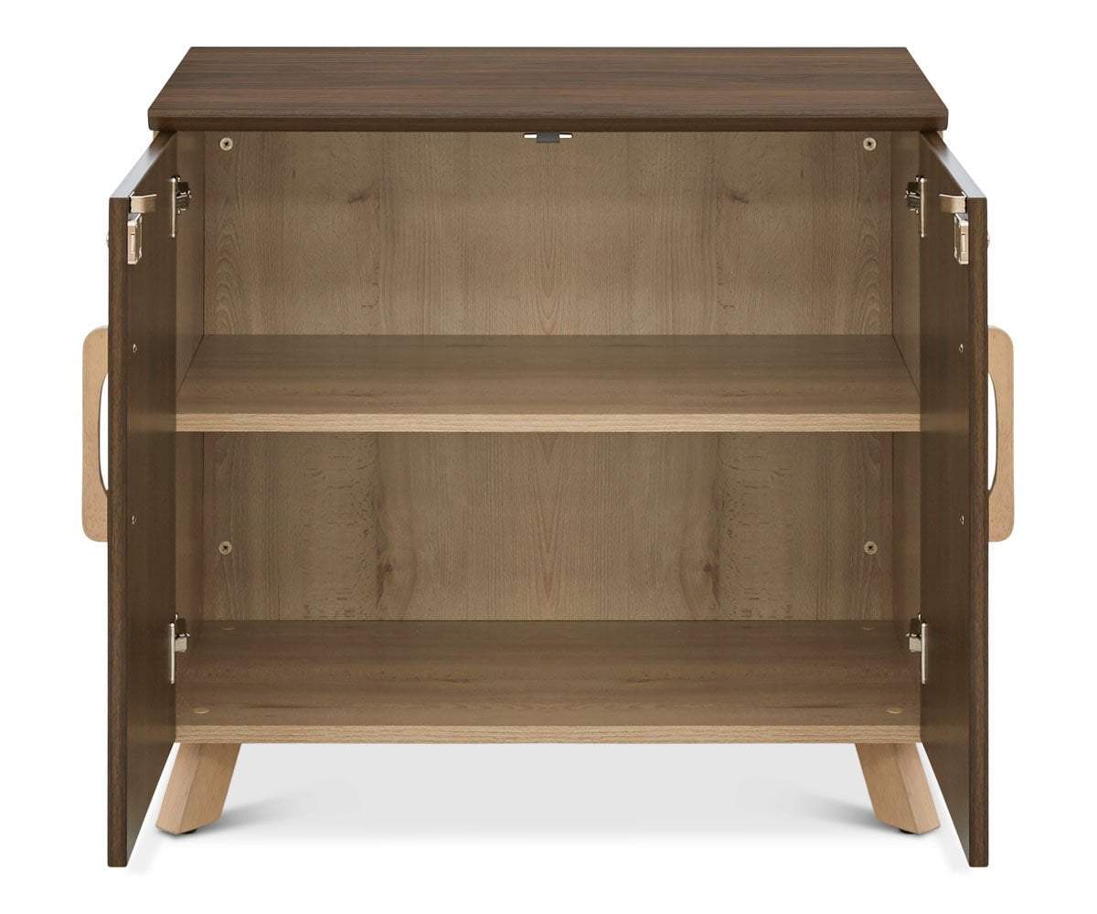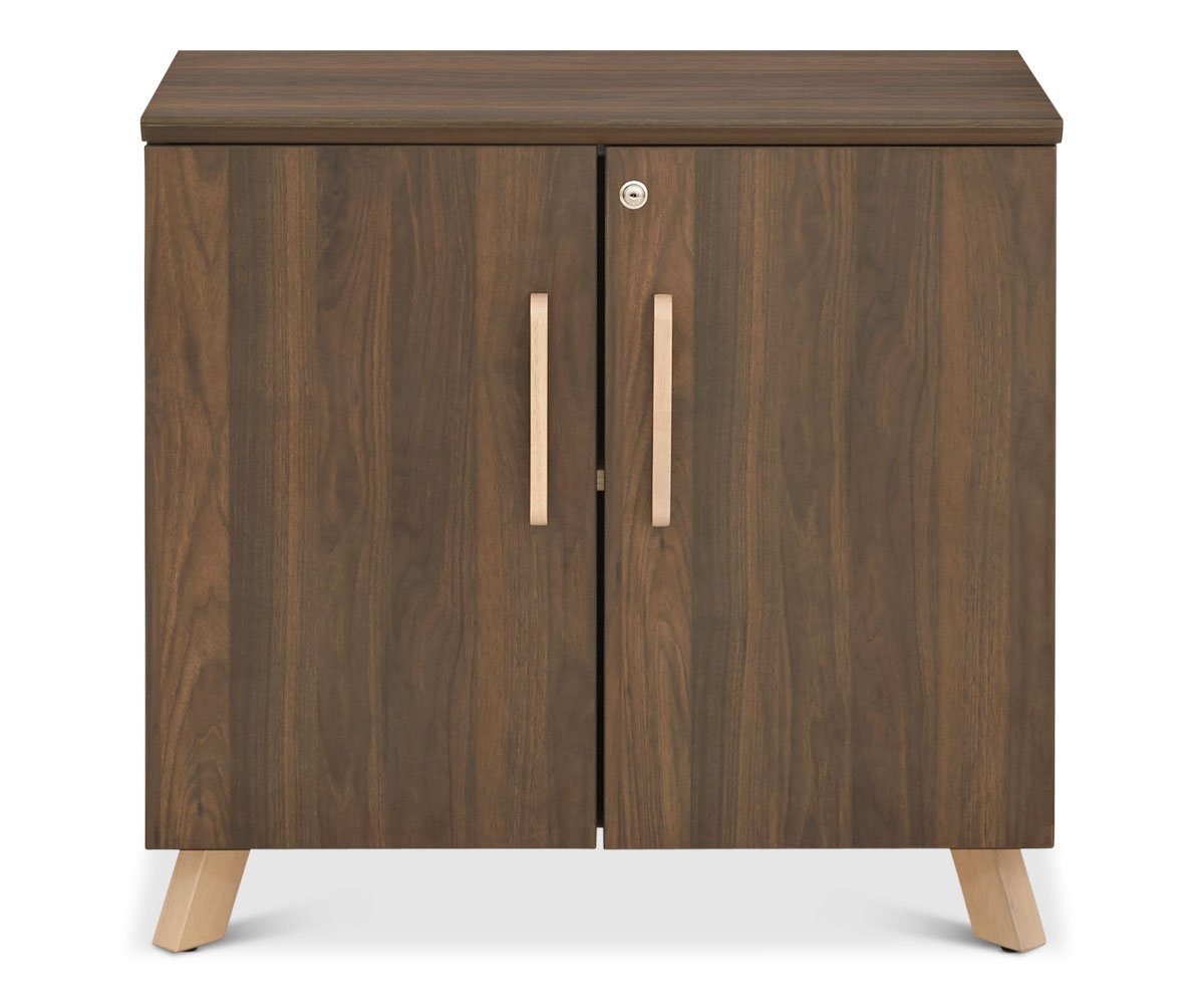 The Thorsten low cabinet is large enough to provide ample storage space without overtaking your office. Its two-tone color palette is easily incorporated into many styles of decor and adds a warmth to your professional workspace. The walnut wood grain pattern displayed on the doors, contrasts handsomely with the light wood finish on the sides, interior, angled legs and door handles. Place items on the top for easy access and organize other necessities inside with an adjustable shelf and lockable doors.