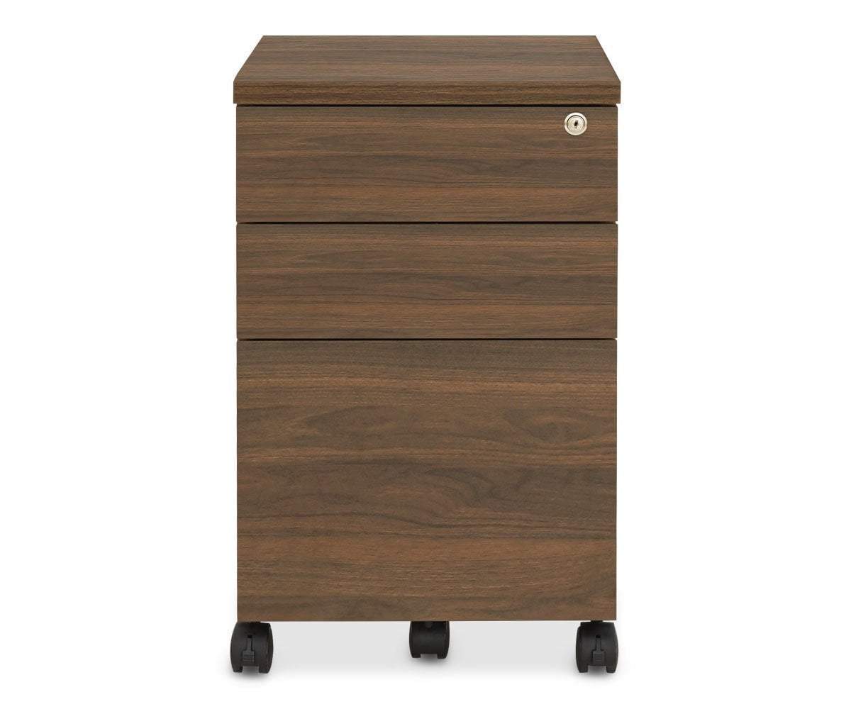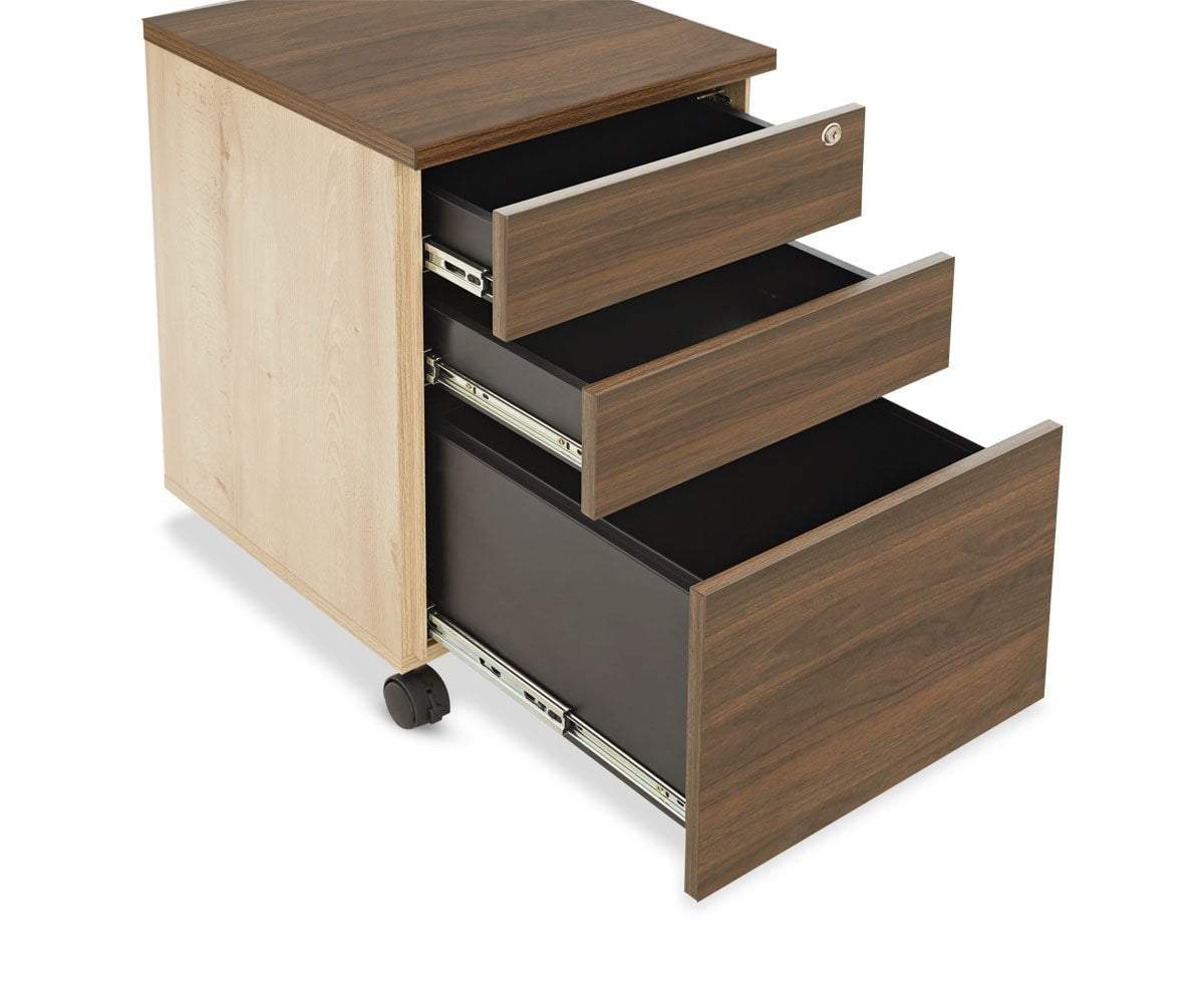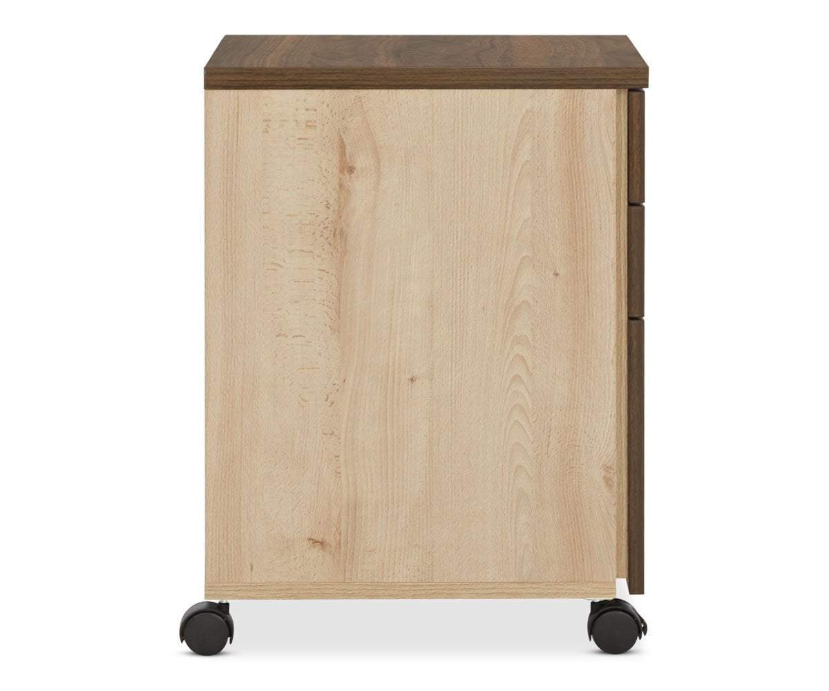The two-tone color palette of the Thorsten mobile file pedestal adds visual interest to the clean, simple lines of its versatile design. This storage piece, boasting three drawers, blends well with many styles of office decor with a light wood finish on the cabinet base that contrasts beautifully with the walnut wood grain pattern of the front and top. Move it easily around your workspace or tuck under the desk for quick accessibility.